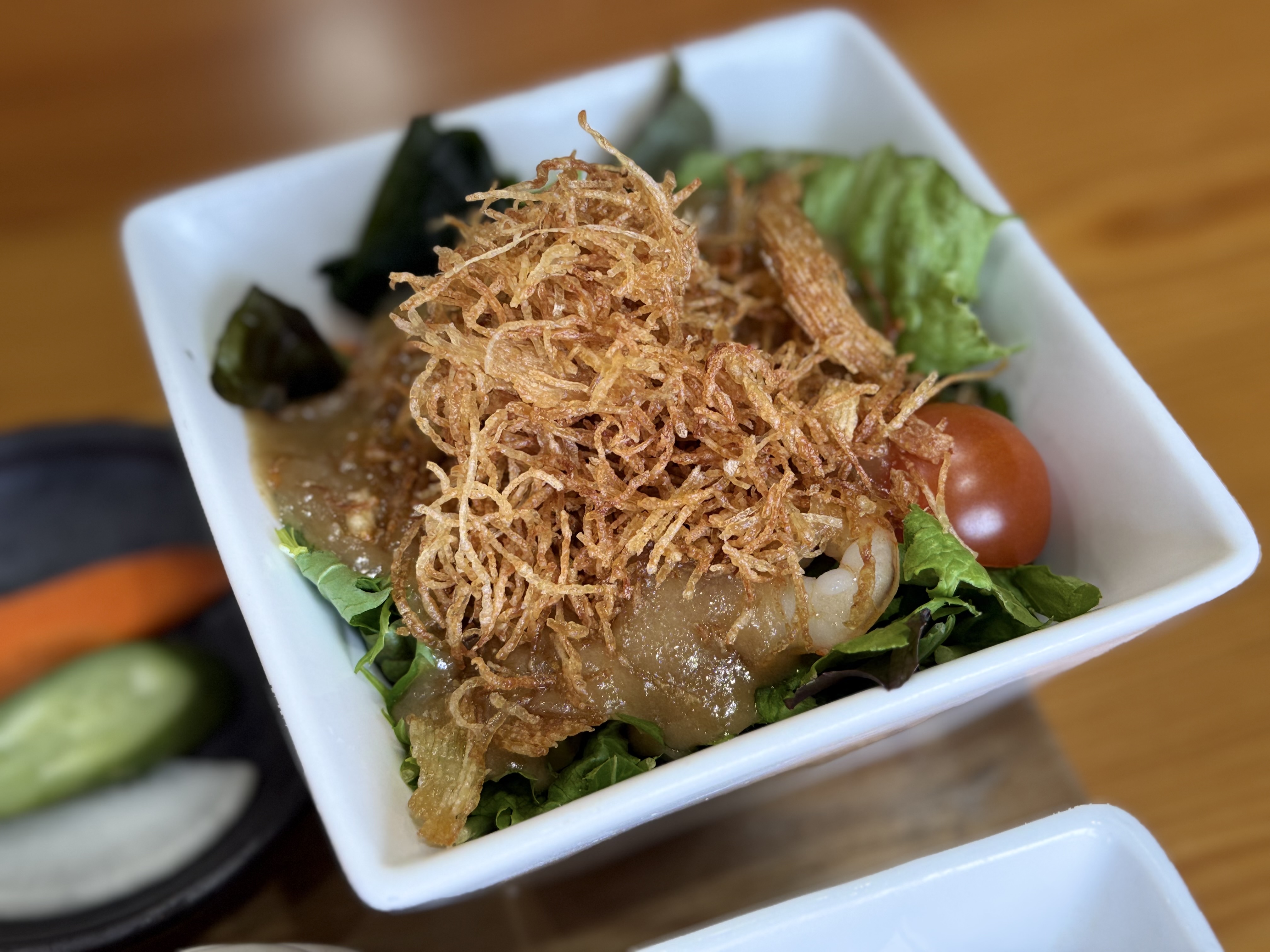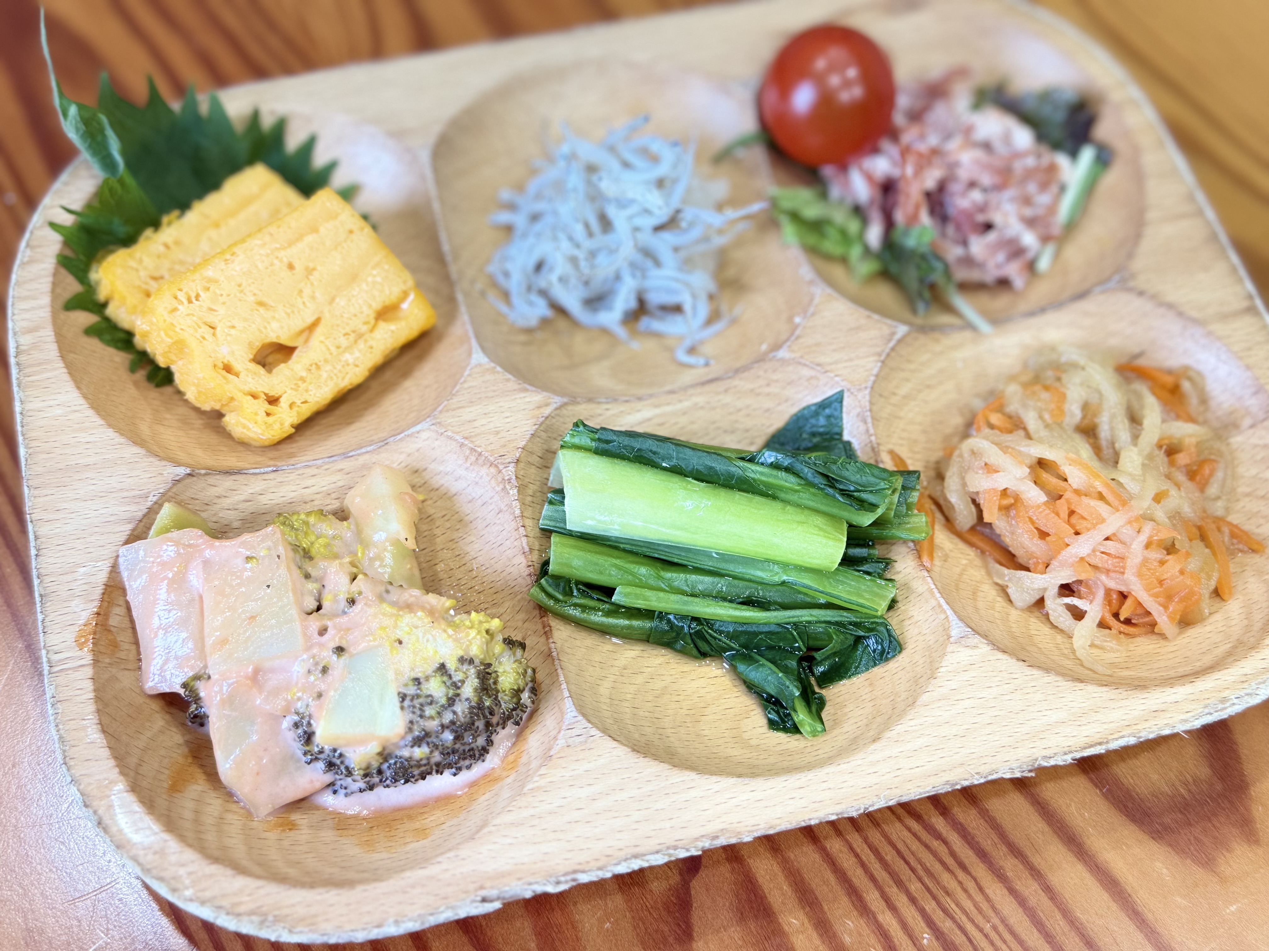 6種の小鉢とサラダが付いた「うれしたのし屋定食」は、ランチタイムに人気の看板メニューです。三浦半島の海と畑の恵みを少しずつ楽しめる構成で、品数の多さと内容の充実感に、自然と気持ちも満たされます。