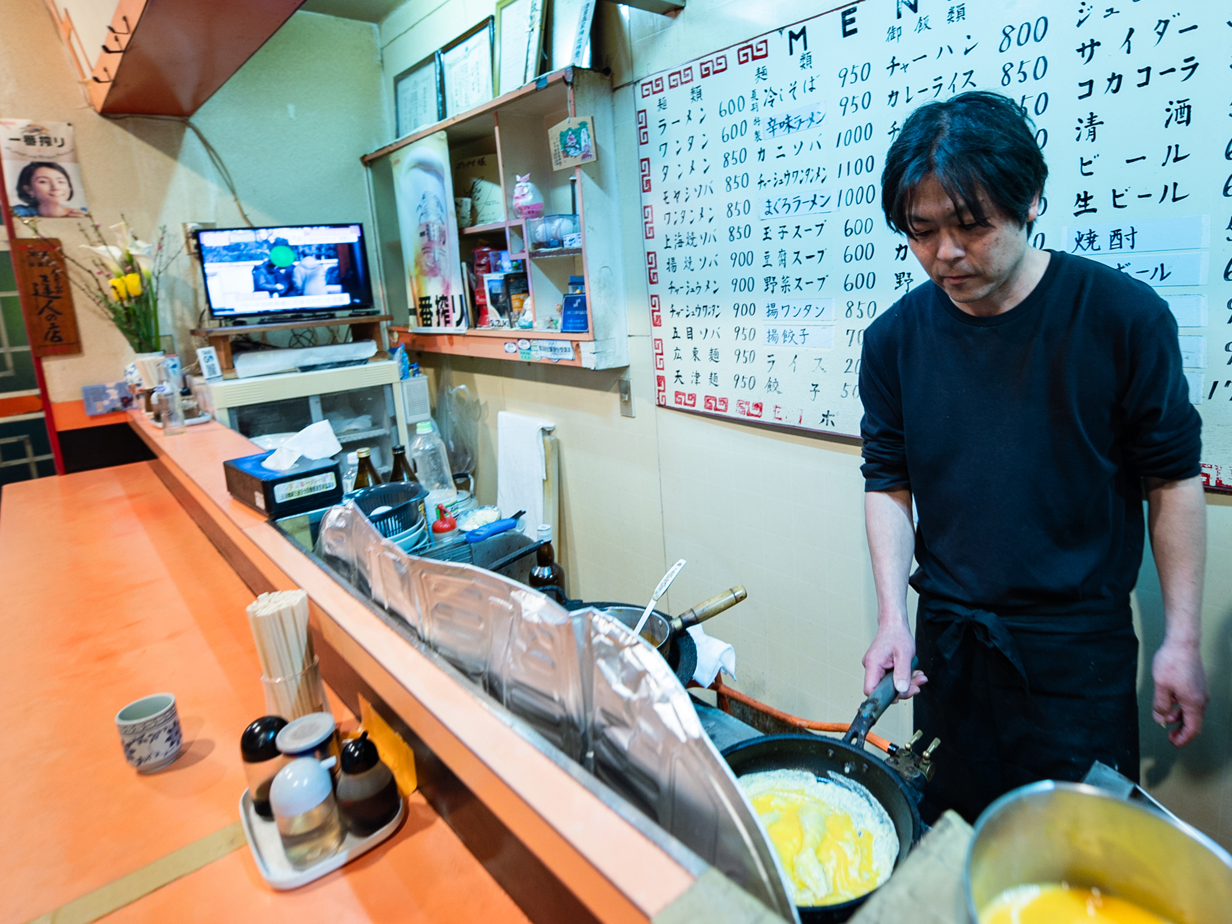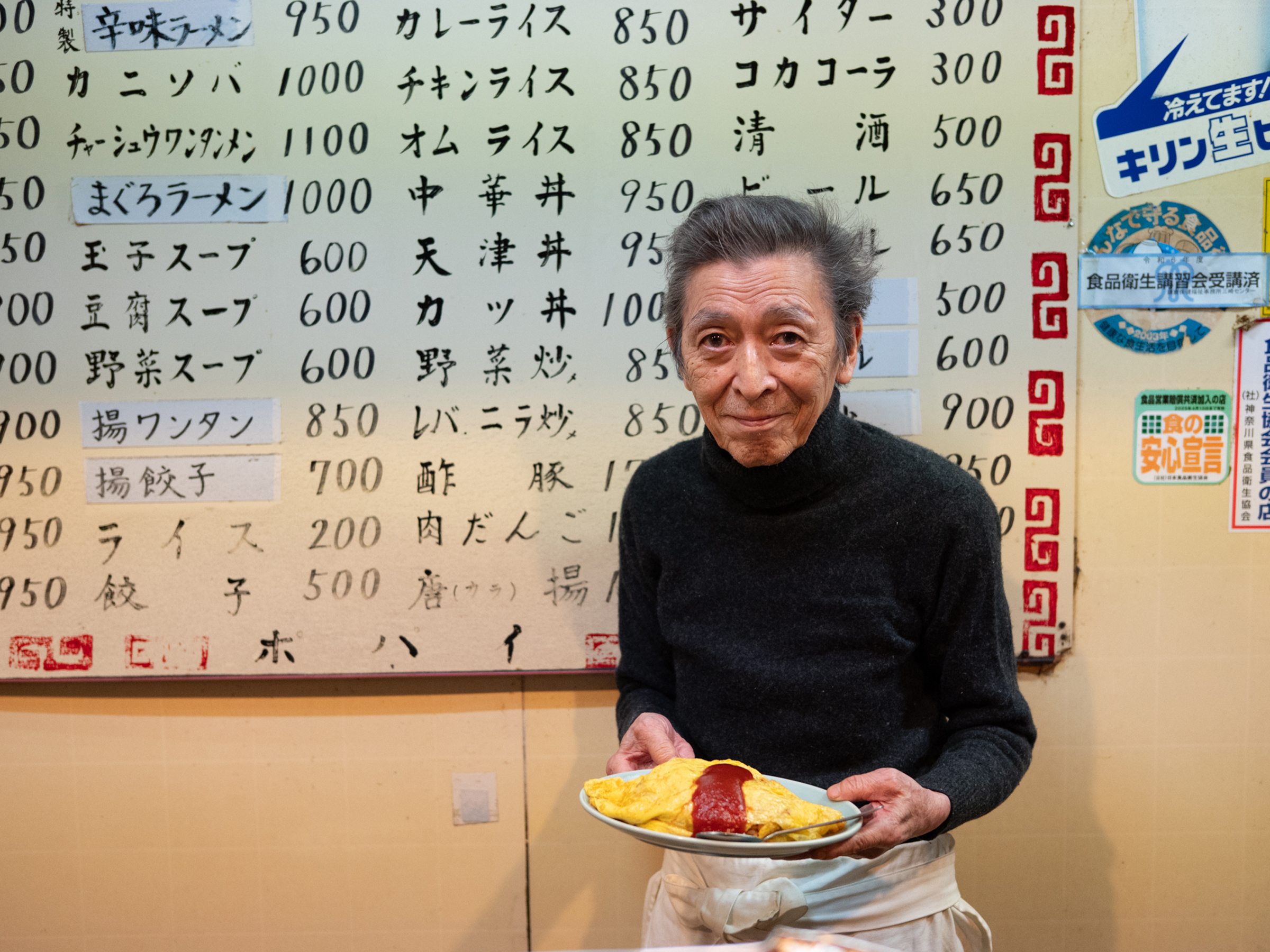 「この店がオープンしたのは昭和41年(1966年)。もともと義兄が鉄板焼きの店としてはじめました。昔“ポパイ”というセーラー文化を描いたアニメがあって、三崎も港町ですから、漁師と言えばポパイだろうということでこの店名になりました。私は東京・浅草の生まれで、和食の板前としての経験があったのですが、義兄に誘われて三崎へ移住し、この店を引き継いで中華料理に転向しました。漁師にはお腹いっぱい満たされる大衆料理の方が求められていたからです。メニューのラインナップも毎日食べても飽きないように、いろいろあった方がいいと思い、オムライスは最初からメニューに入れていました」