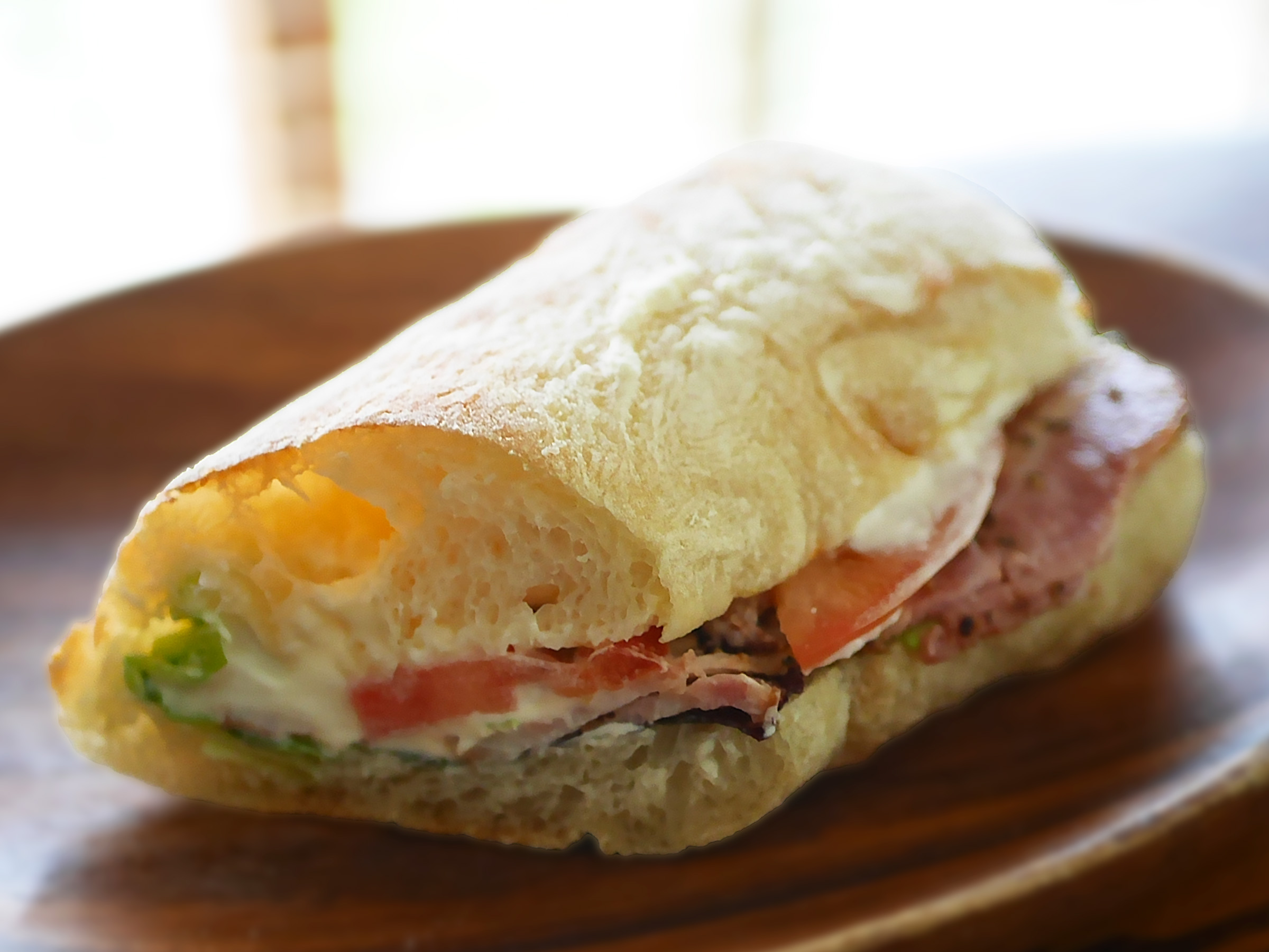 人気の「チャバタサンド」は、イタリアの伝統的なパン・チャバタを使用。修行時代から研究を重ねた、小麦粉と水分を強く結びつける「水和」の技術にこだわることで、外皮は薄くパリッと、中はふわっとした歯切れの良い生地に仕上げています。美味しさと食べやすさを兼ね備えた一品です。