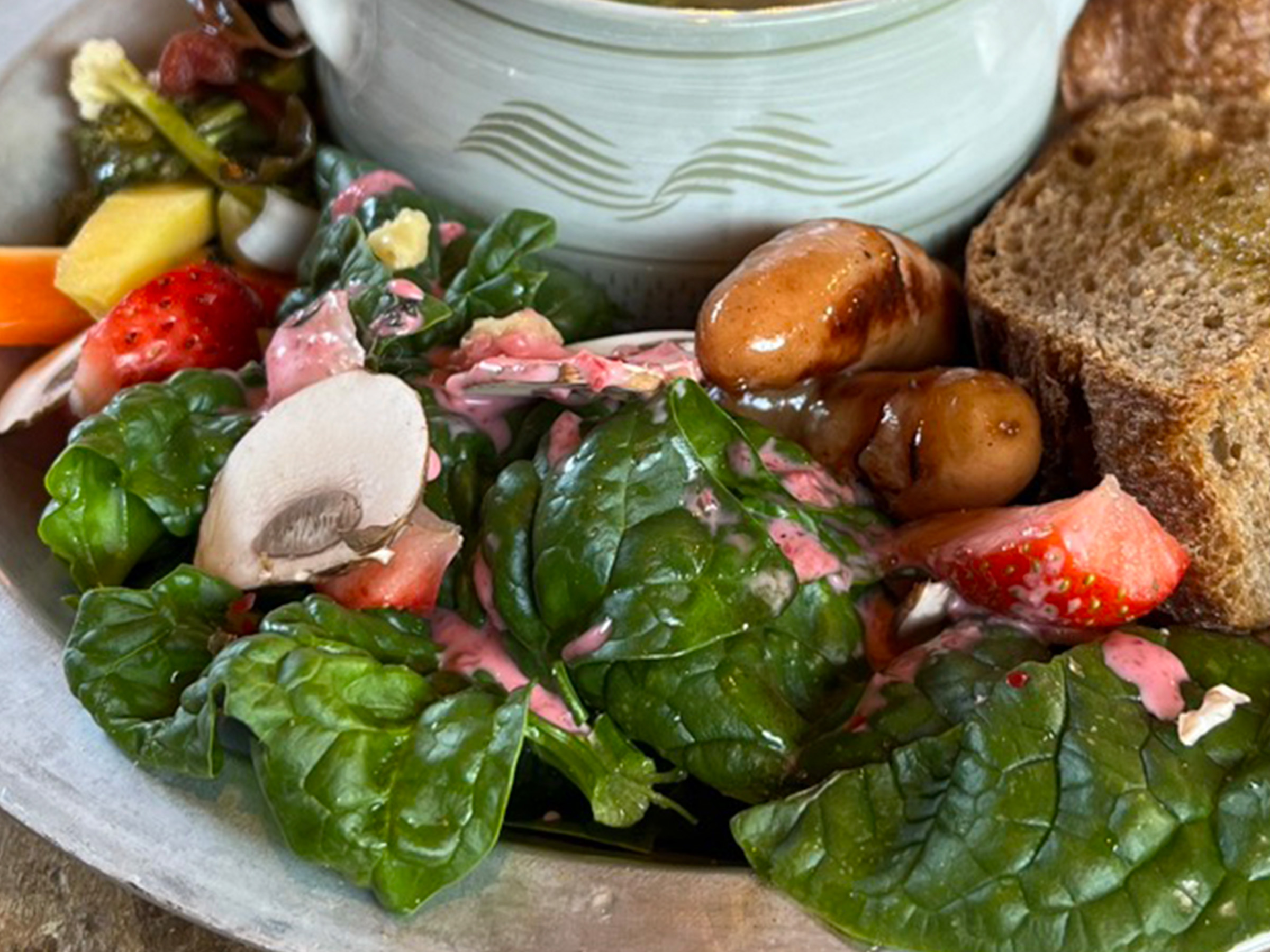 この日のセットには、ちぢみほうれん草やピクルス、いちごを添えたサラダと、にんじんと新玉ねぎのスープ、チーズブレッド、粗挽きウインナーが並び、ドリンクがつきます。