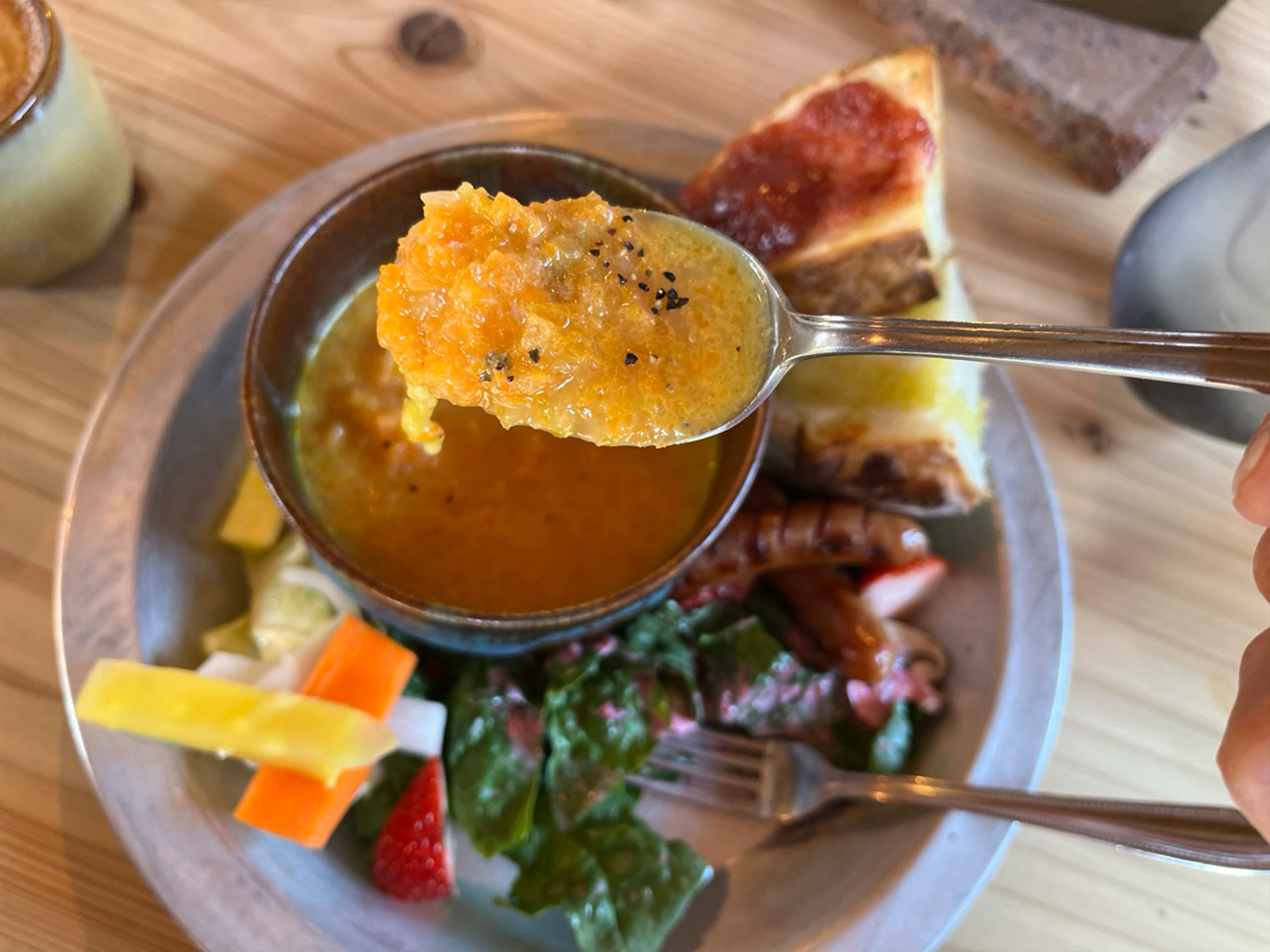 スープは、にんじんと新玉ねぎ本来の甘さを活かし、ほんのりスパイスが香る優しい味わい。漉さないことで、食感が口いっぱいに広がり、満足感のある一品に仕上がっています。