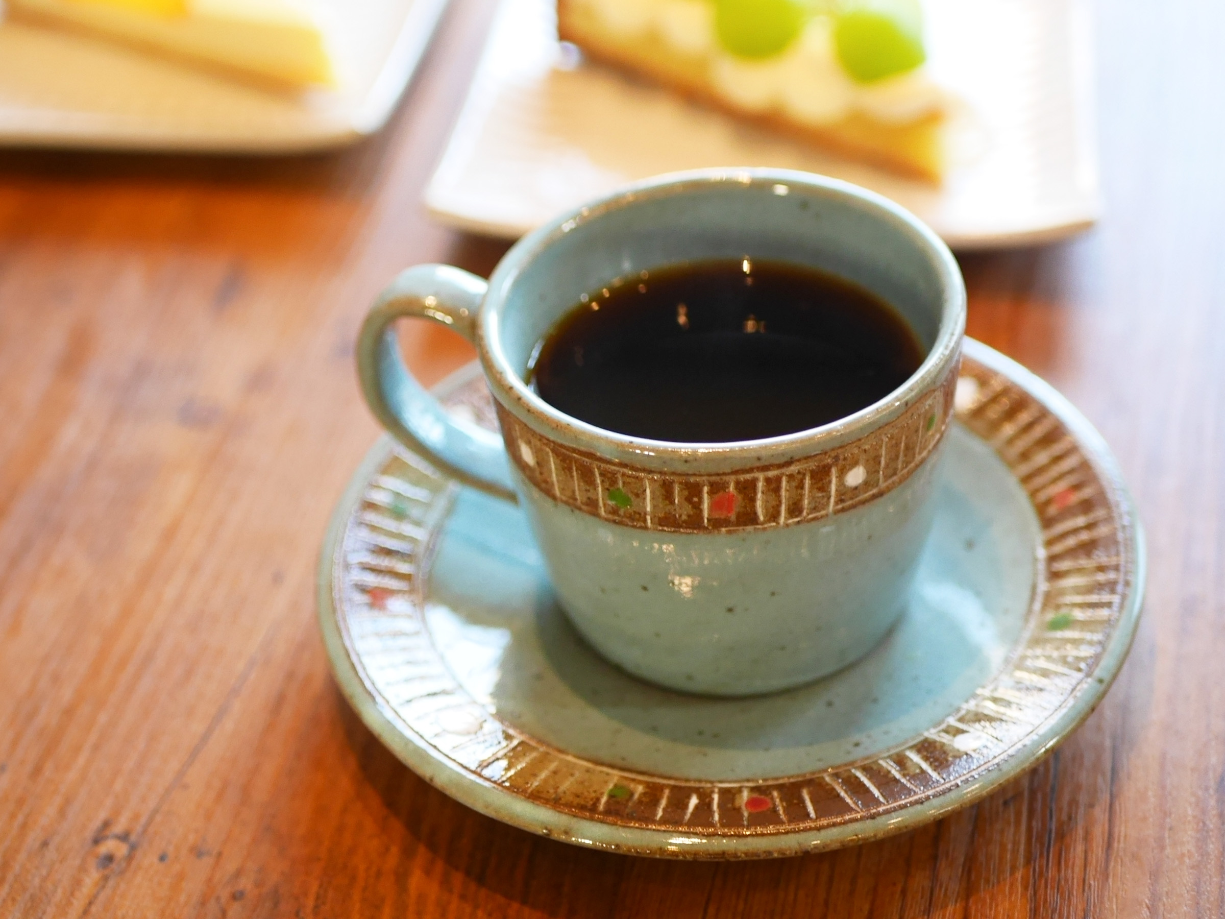 タルト&ドリンクセットのドリンクのコーヒーは、ブレンド(495円税込/単品)や浅煎り・中煎り・深煎り(各550円税込/単品)の4種から選べます。特に深煎りは人気で、甘いタルトの余韻を引き締め、とんかつの後でもカフェ利用でもすっきりする味わいです。