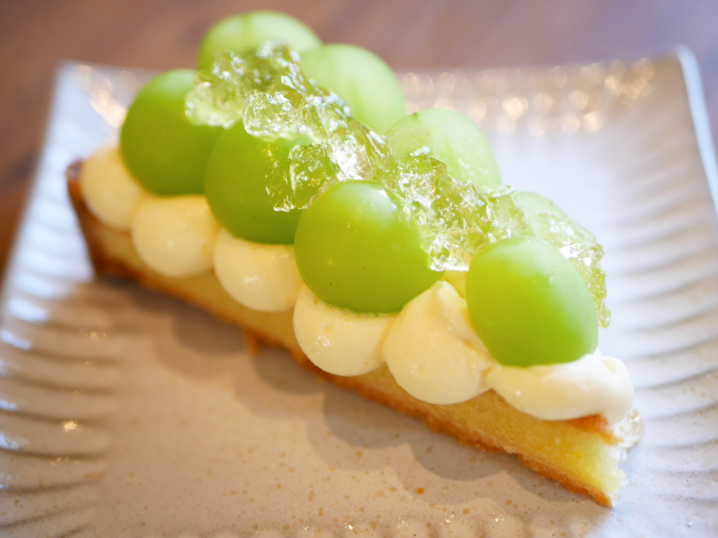 この日のフルーツ系は「シャインマスカットタルト」(単品770円/セット1210円税込)。大粒でジューシーな実に白ワインと黄桃果汁リキュールのゼリーをまとわせ、爽やかな甘さと香ばしい生地、カスタードのコクが響き合う贅沢な一品。