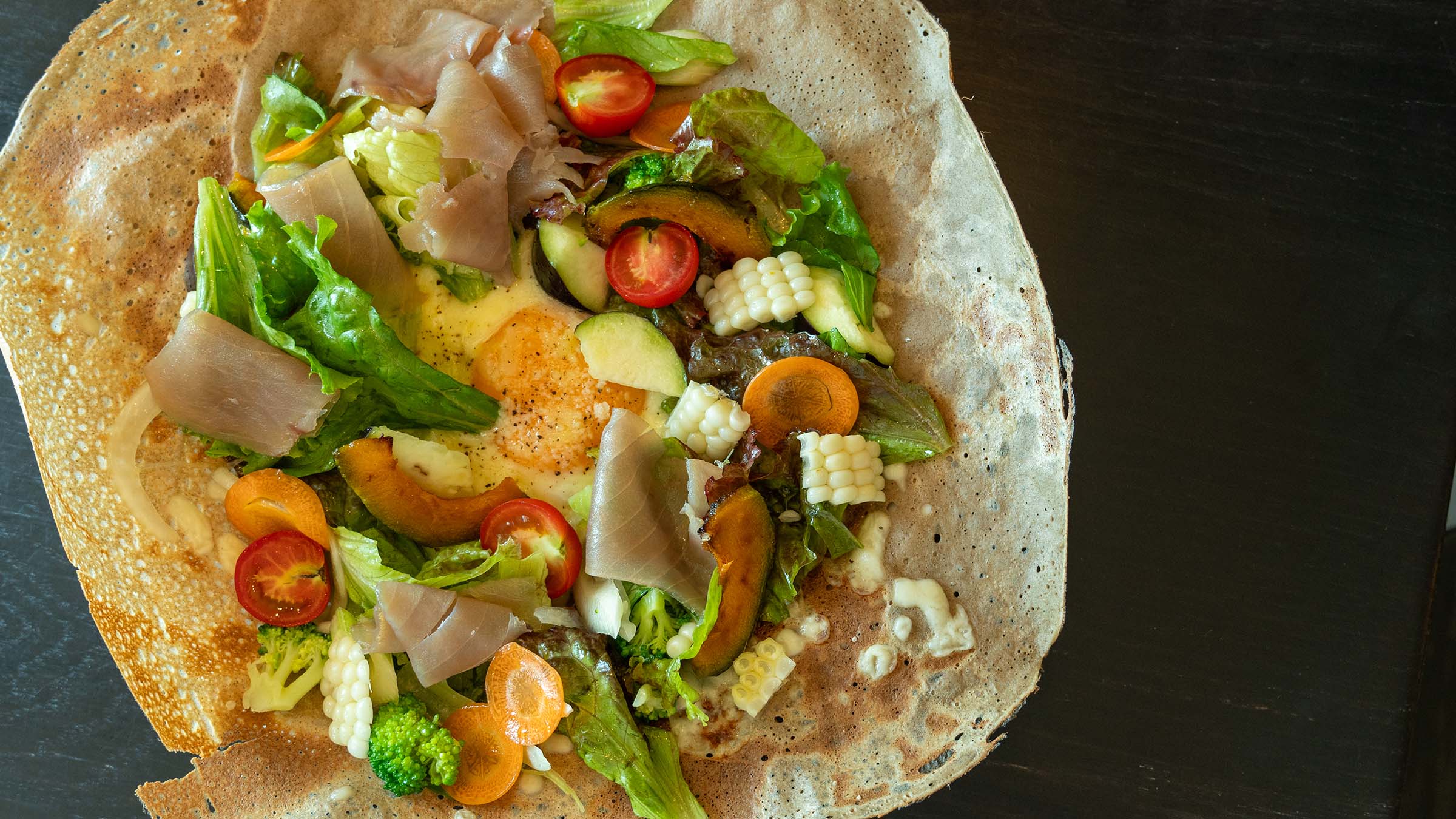 Cafe Fossetteの名物のひとつが、そば粉100パーセントのガレットです。生地に深みを出すために、卵とはちみつを加えているところがポイント。一番のおすすめは「季節の三浦野菜のサラダ」+マグロの生ハム・チーズ・エッグ添え(2,100円)です。