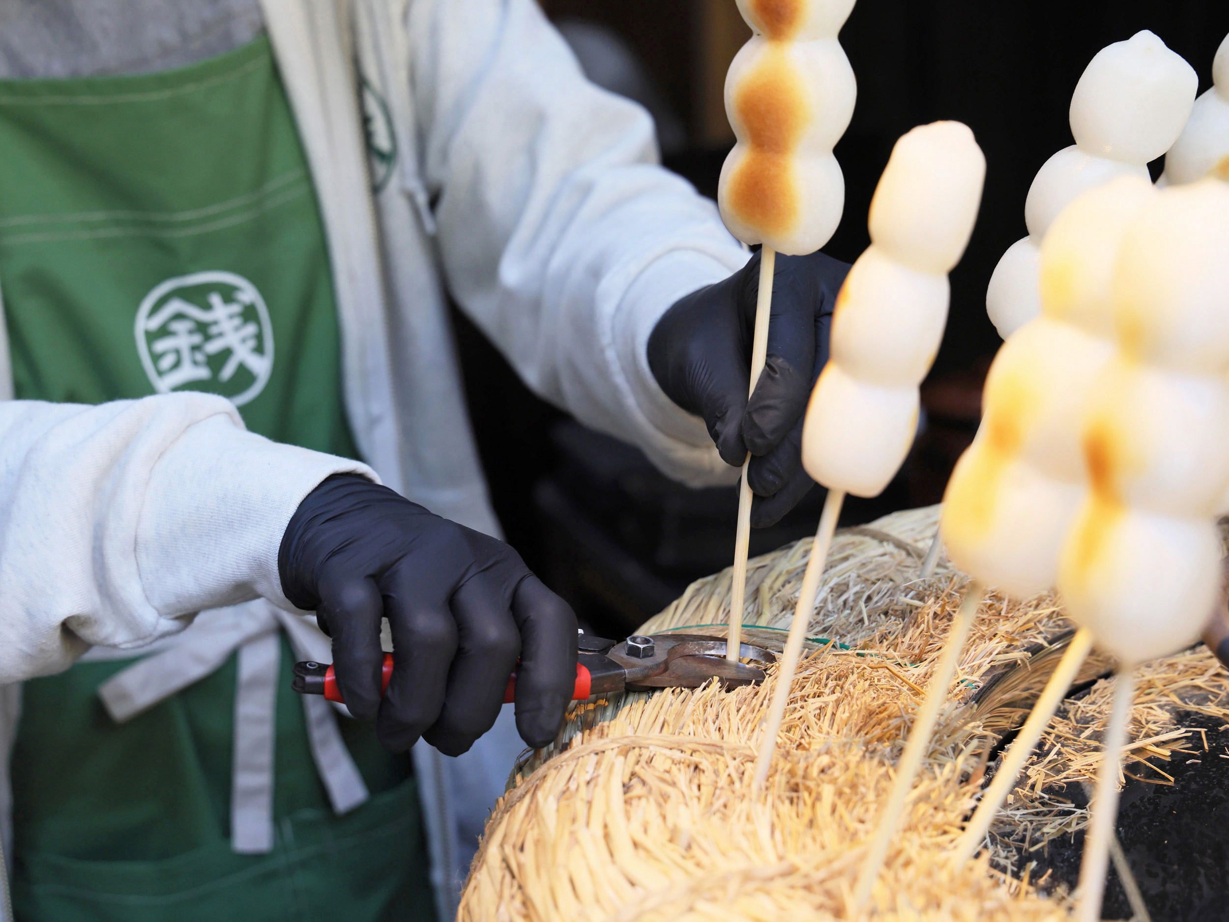 焼き上がったら、串の根元をハサミでパチンと。「健康・長寿の願いを込めて、串(=苦死)を切っているんですよ」と、岡本明子さんが笑顔で手渡してくれました。