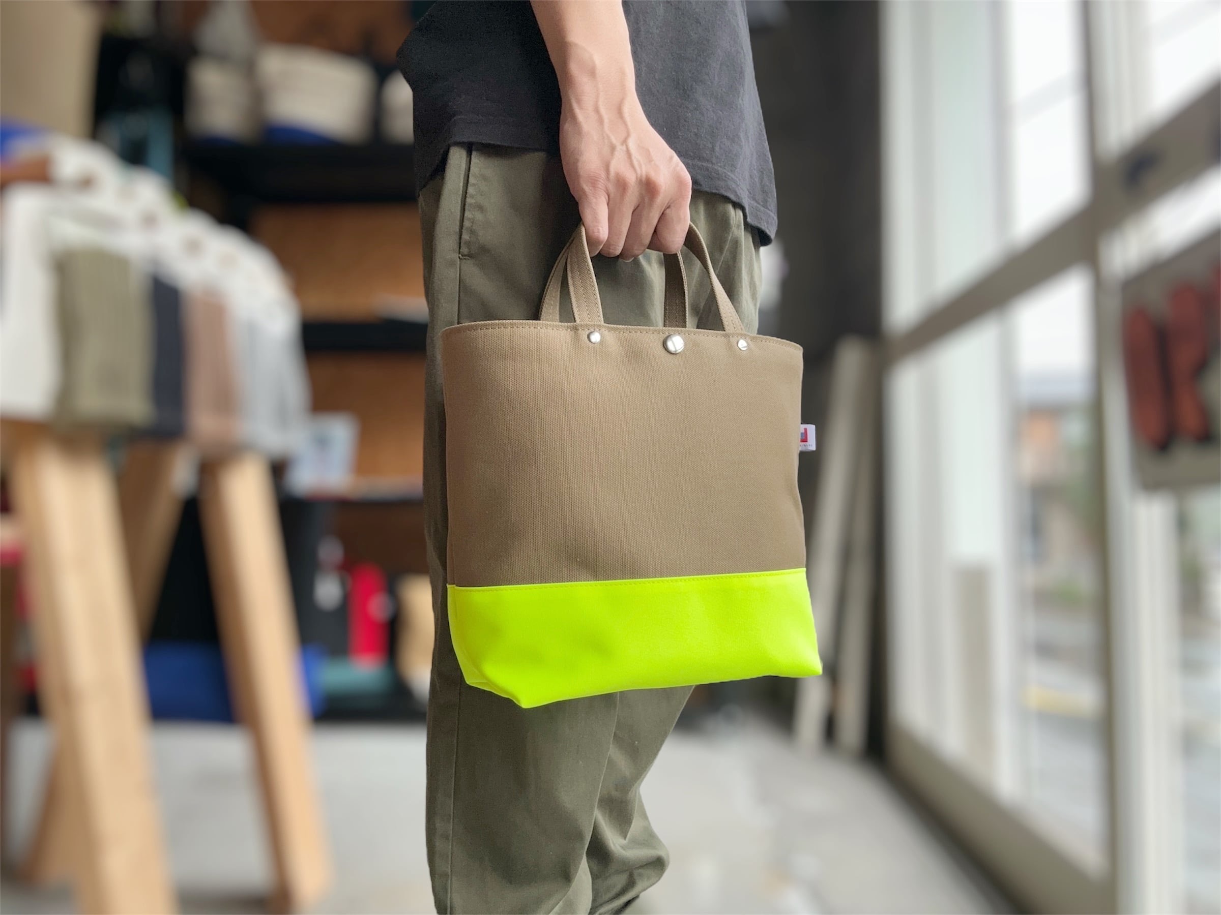 シンプルでありながら、色彩の遊び心が感じられるバッグです。