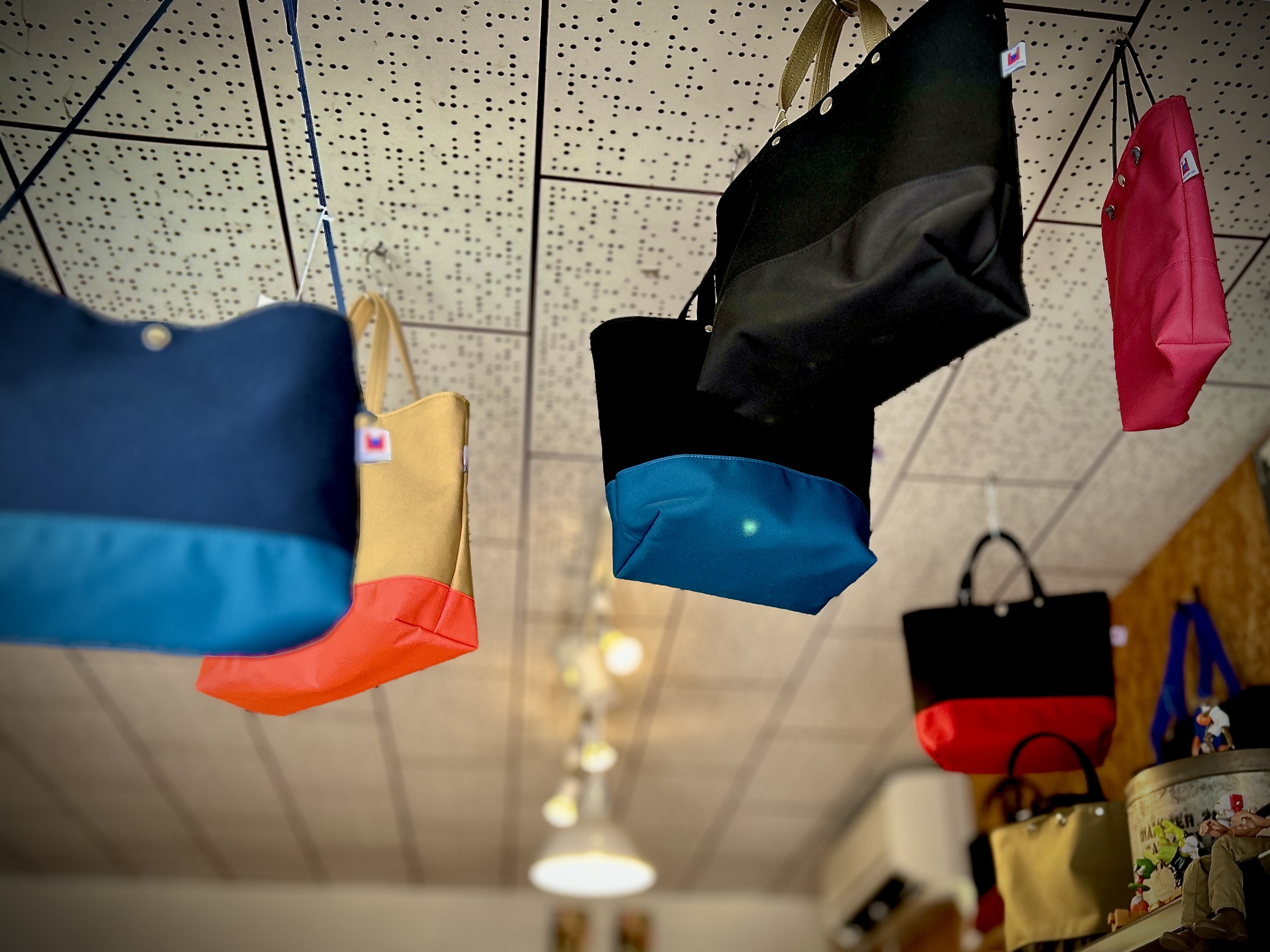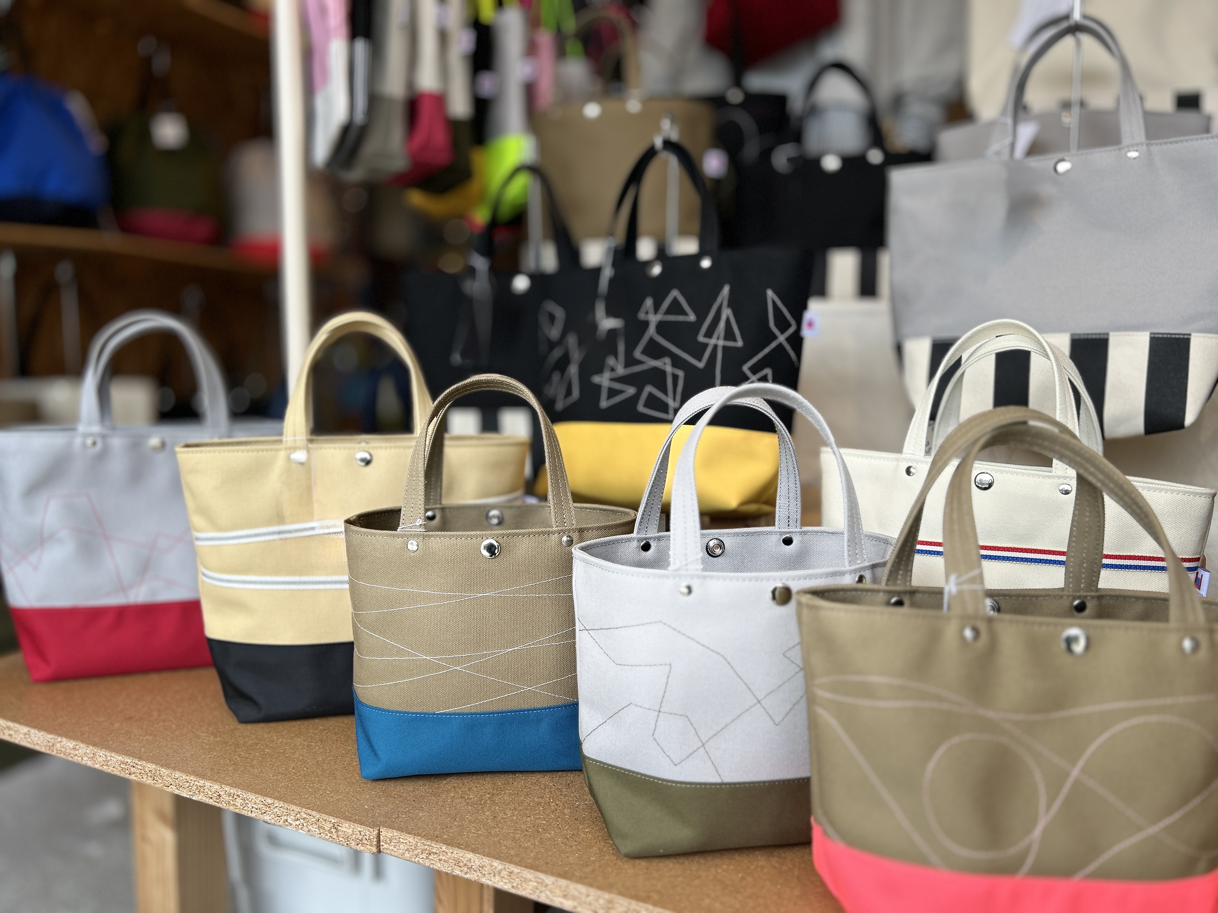 作業台には、昨日完成した色と形が多彩なバッグや、使用した端切れで作られた小物が所狭しと並んでいます。