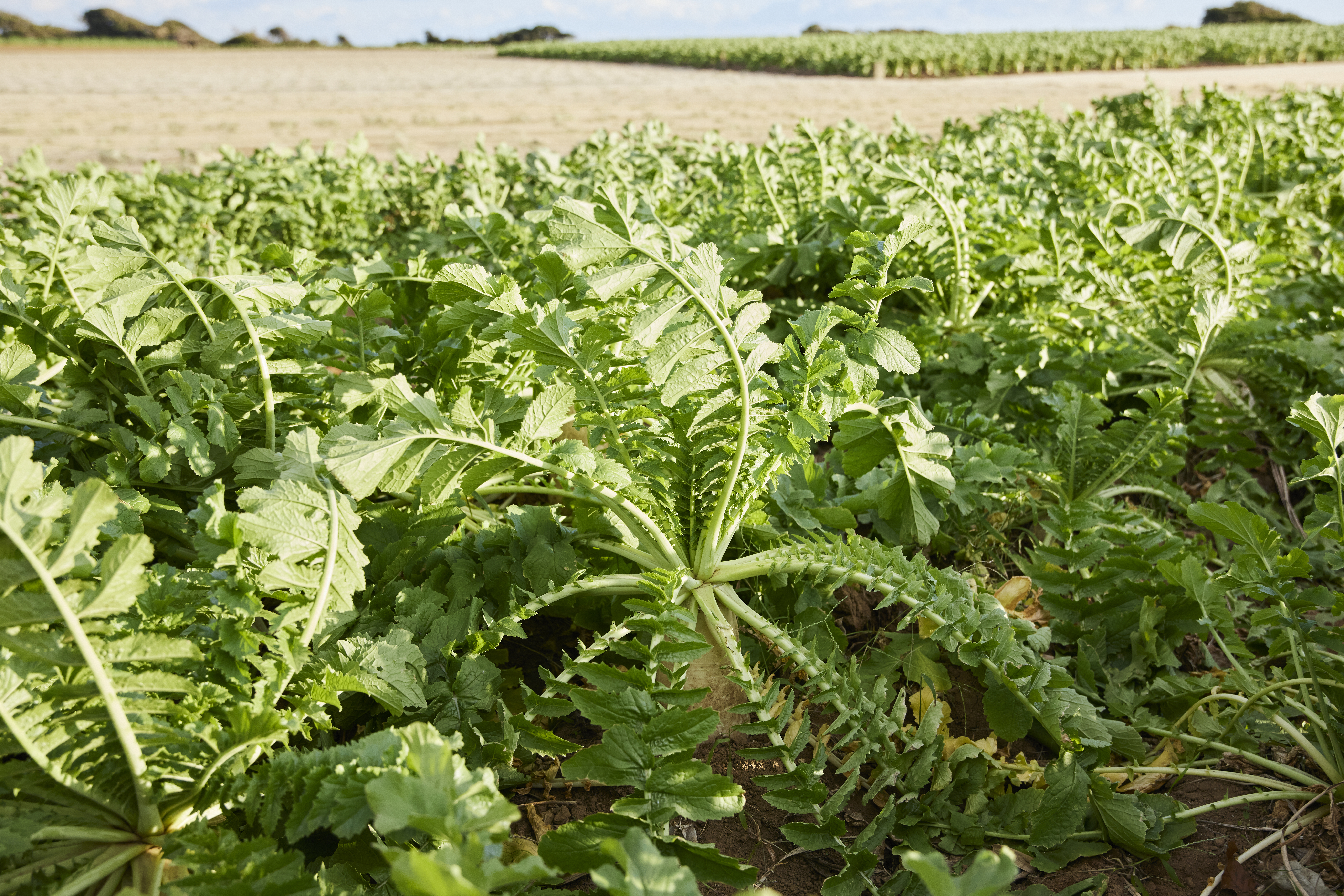 種まきからわずか2ヶ月。あんなに小さかった芽が、今ではトゲトゲとした葉を勢いよく縦にも横にも広げ、畑一面を緑色に覆い尽くしています。その足元を見ると、白い大根の首がしっかりと顔をのぞかせていました。