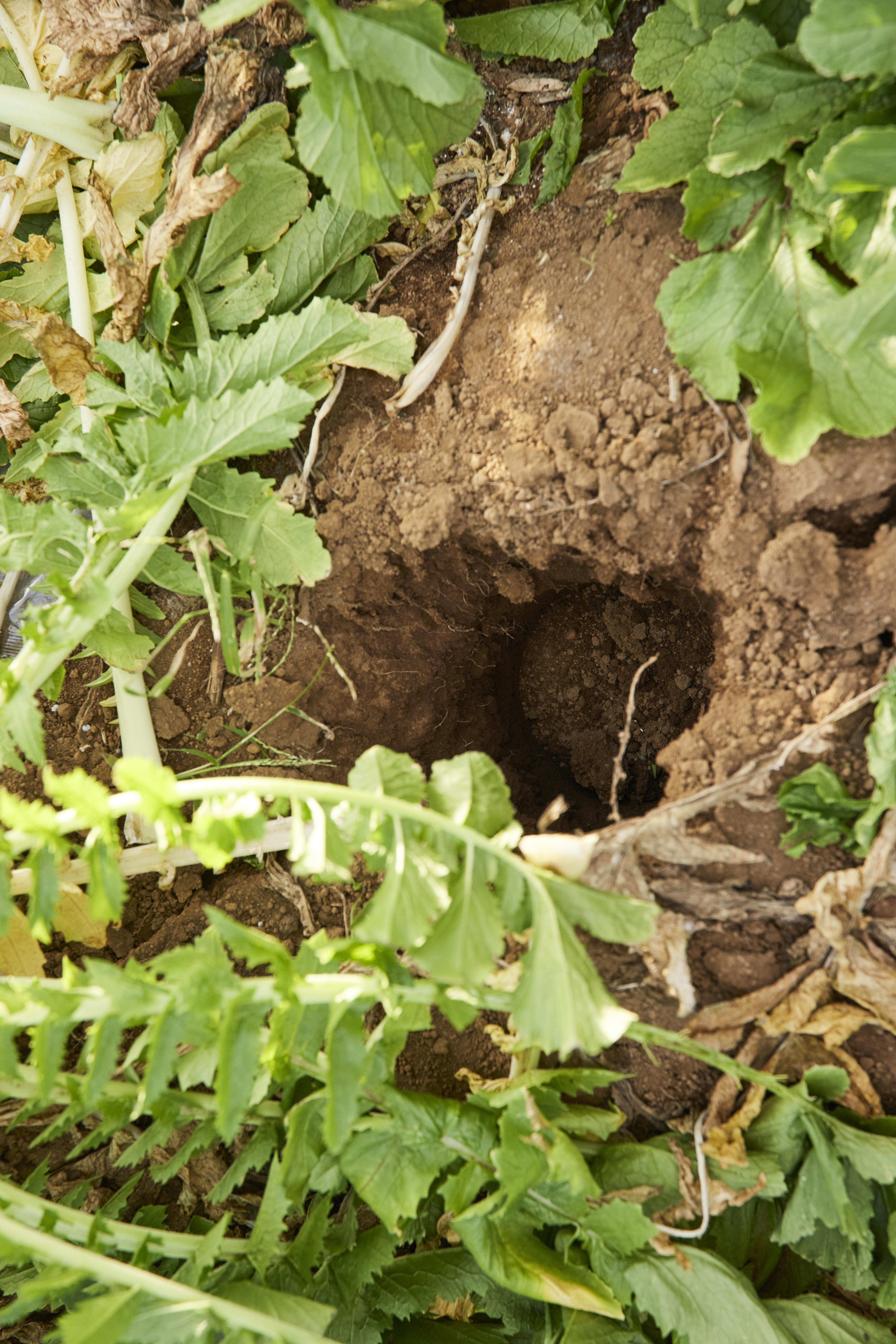抜けた後の地面を見ると、深い穴がぽっかり。この深さが、地中深くまっすぐに伸びる三浦大根の証です。