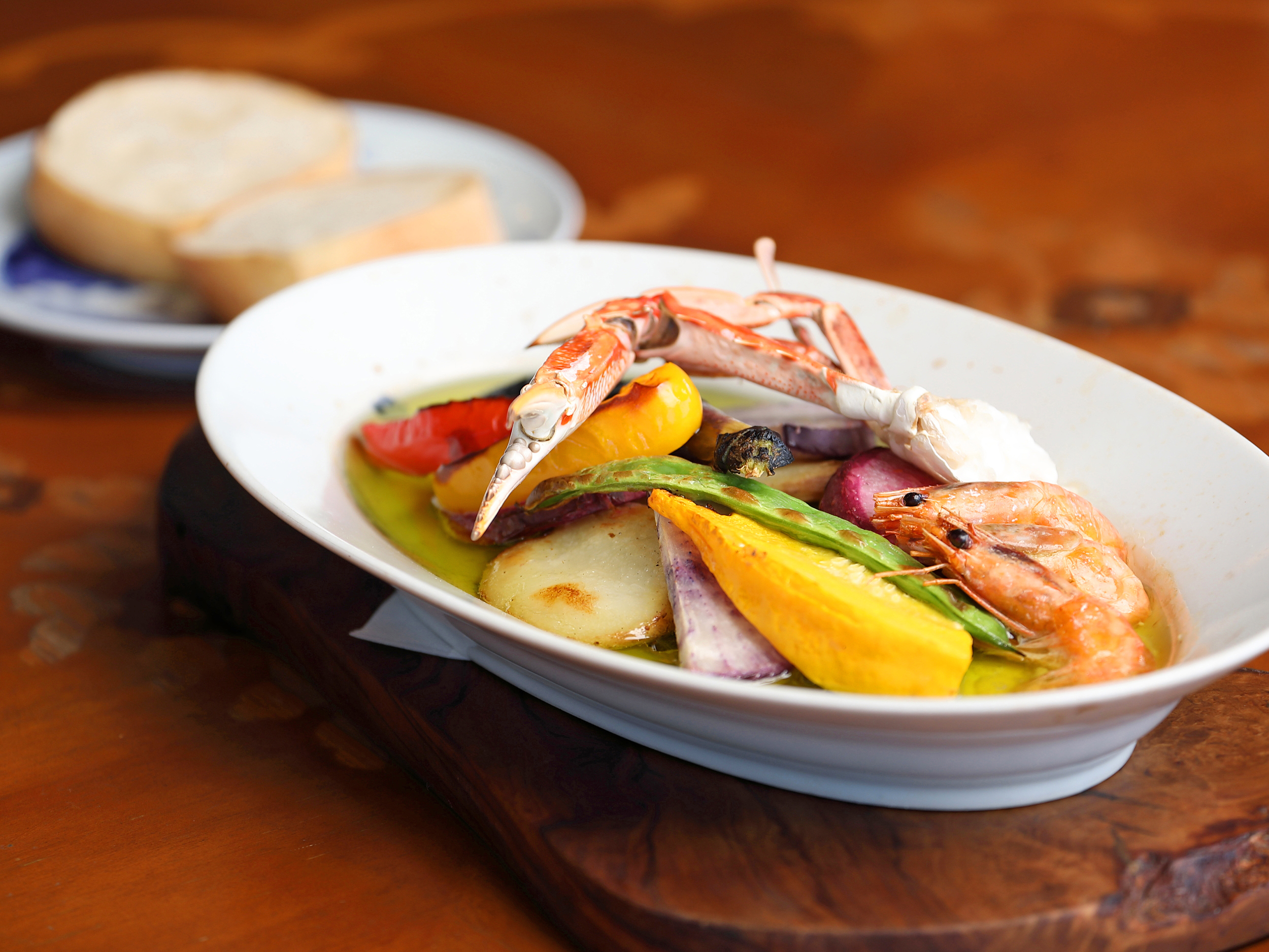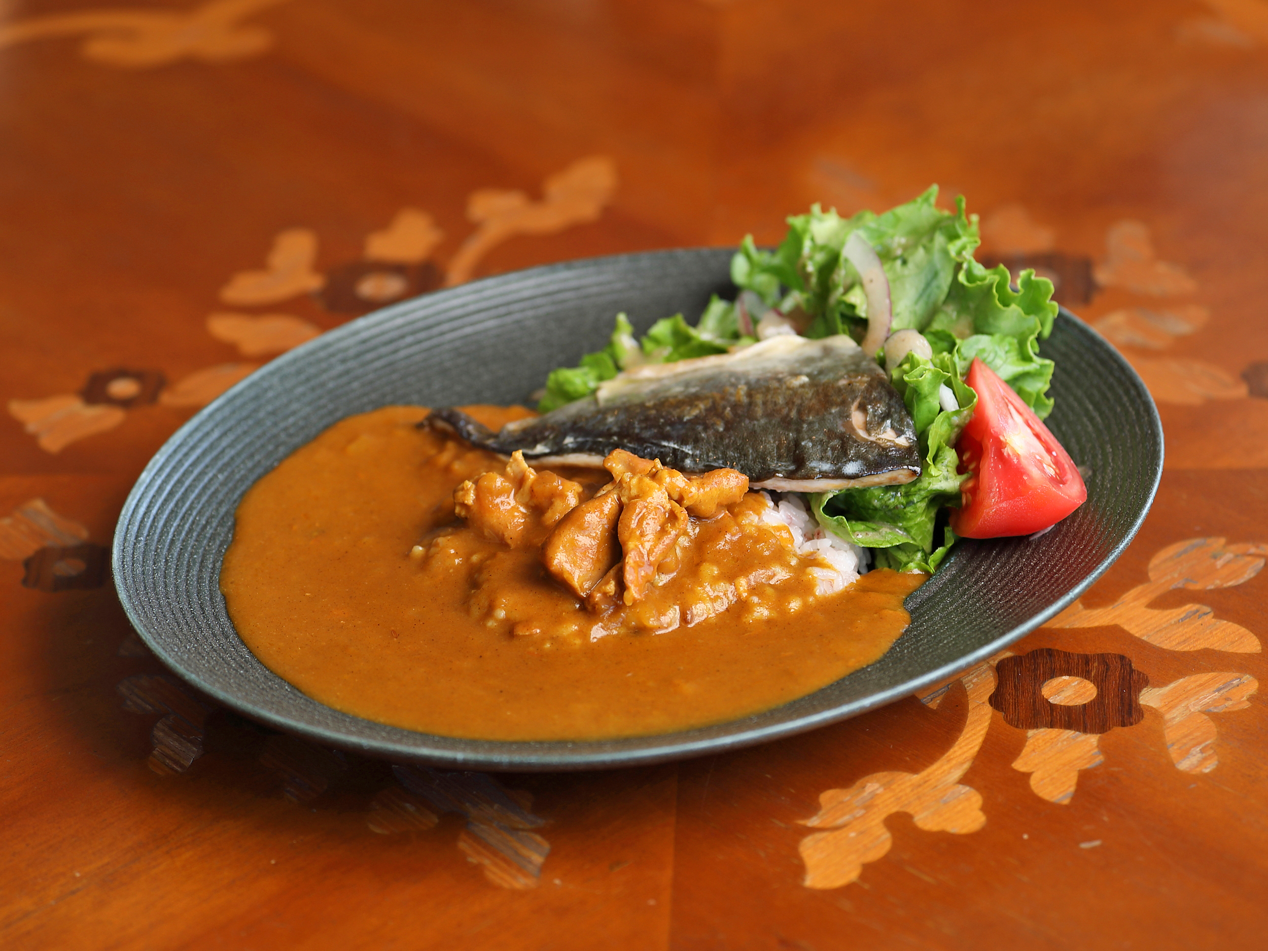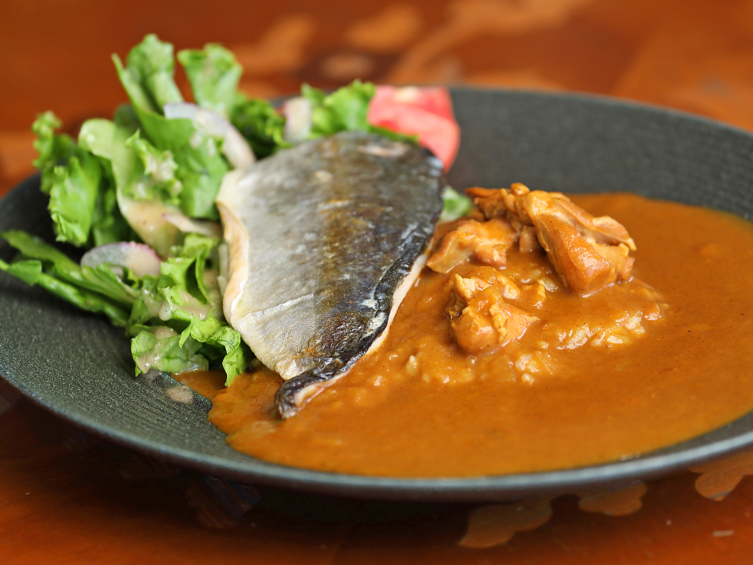 まずはカレーを一口。スパイスが効いていますが、辛くはありません。カレーには魚介の和風出汁を加えてあるので、地魚と一緒に食べると魚の旨みを前面に感じられます。