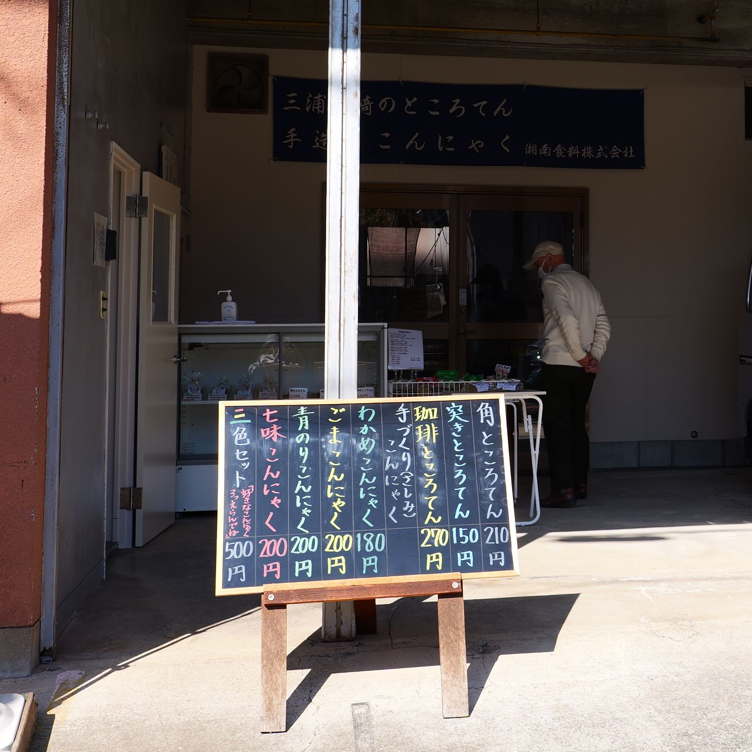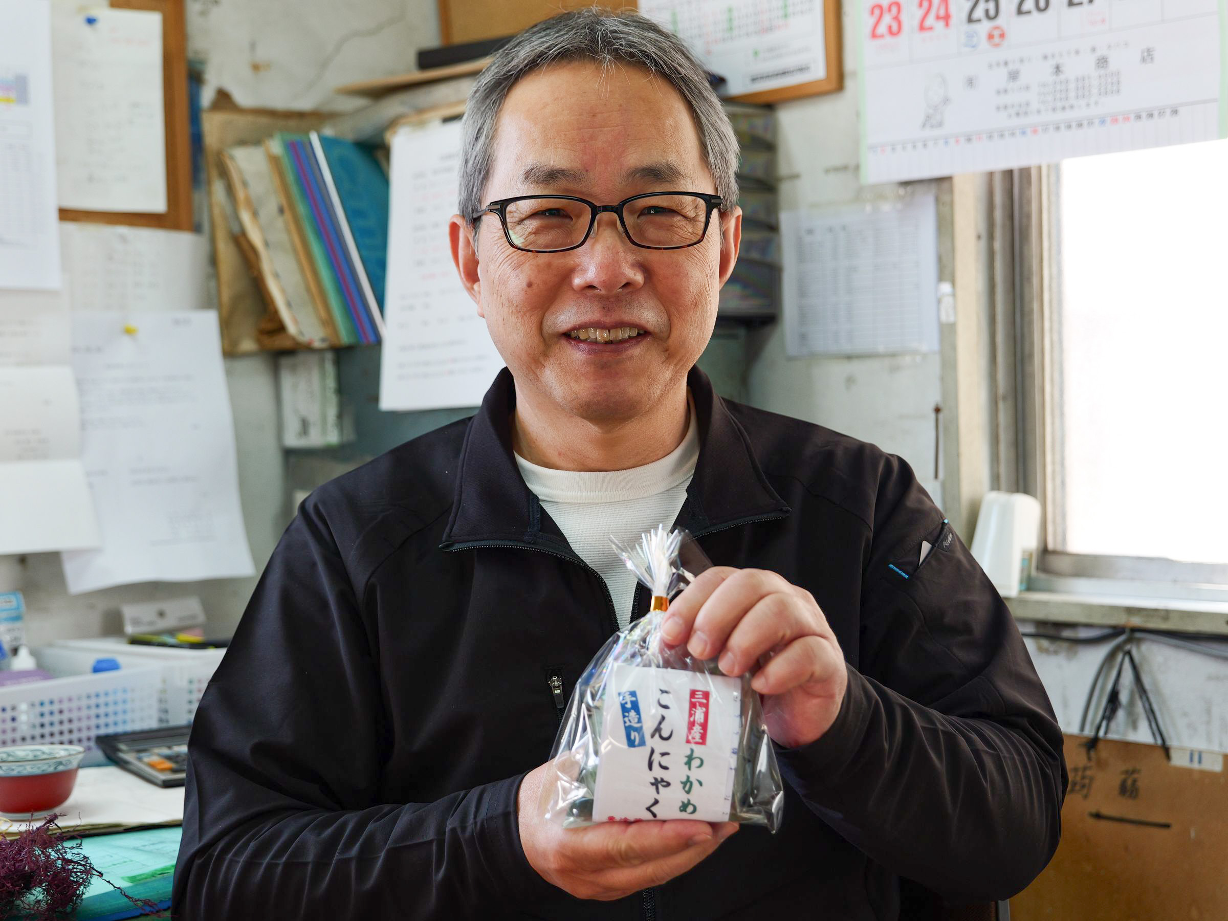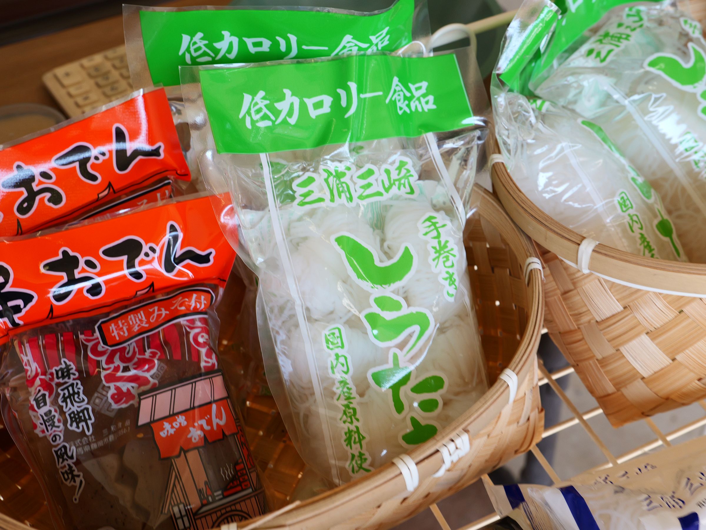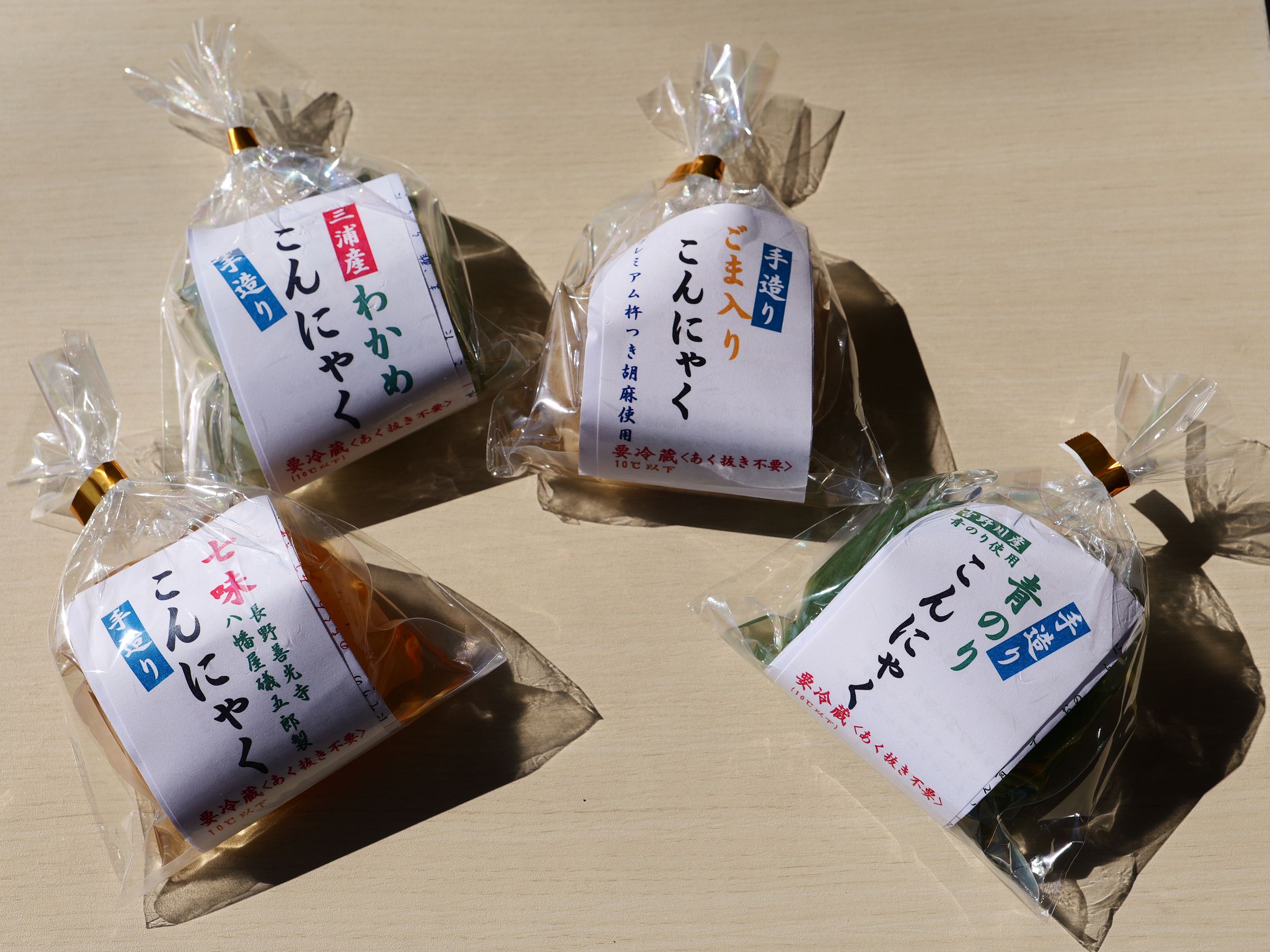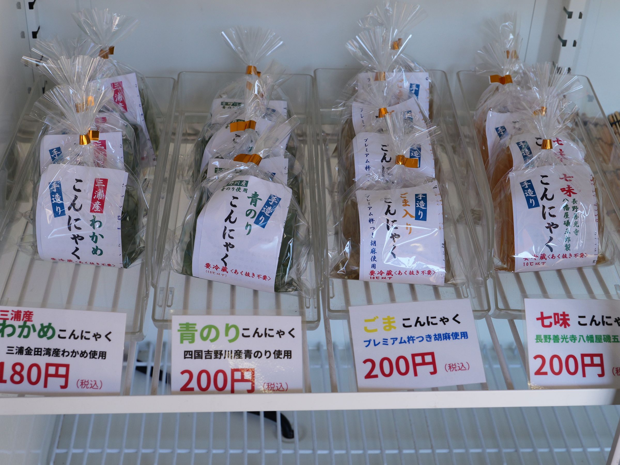 湘南食料株式会社の「手造りこんにゃく」(180~200円)は、国内産こんにゃく粉を100%使用しており個性が異なる4種類の味が並びます。三崎のお土産としてもおすすめなのが、三浦金田湾産のワカメをたっぷり使用した「わかめ」(180円)。