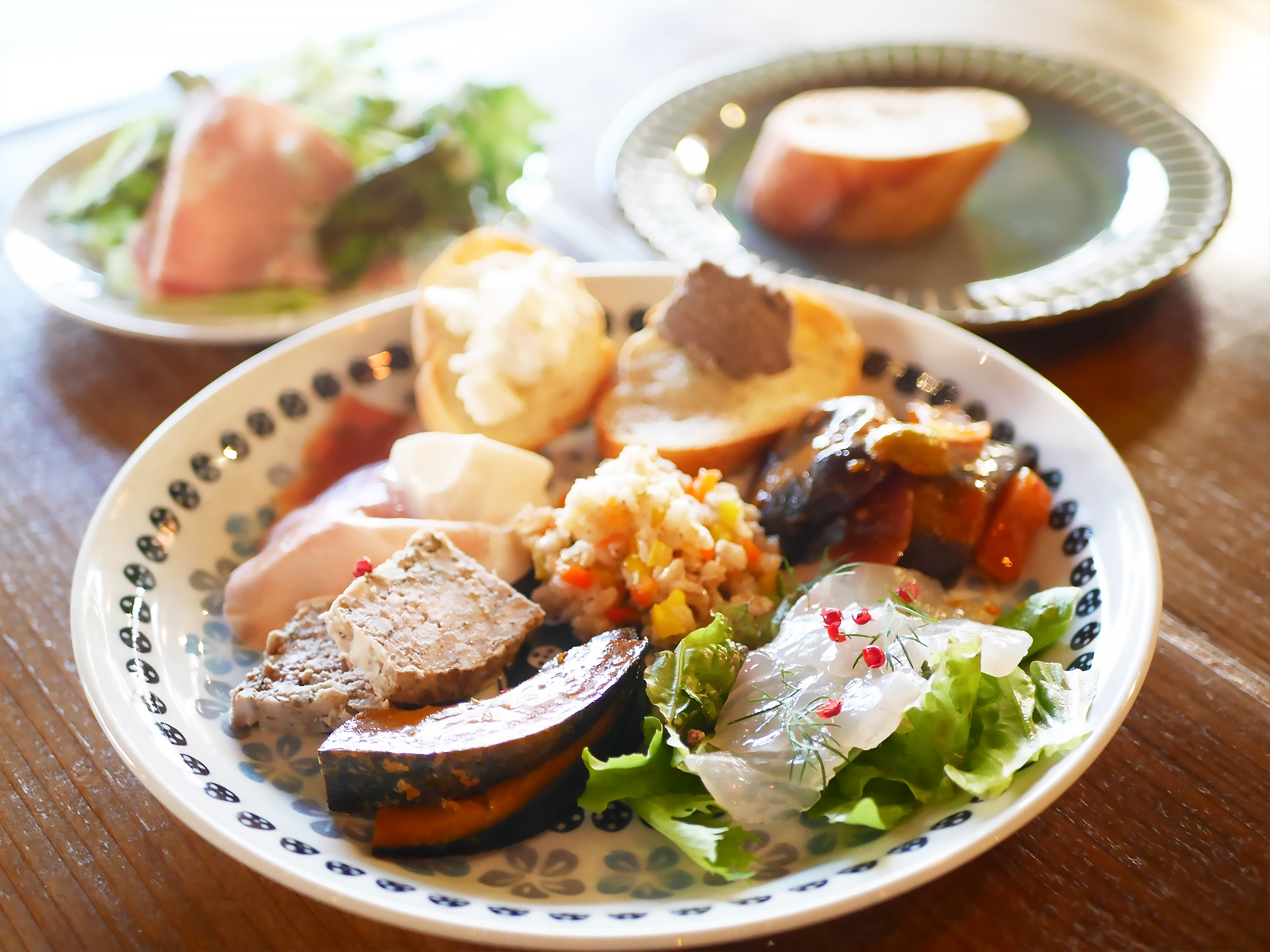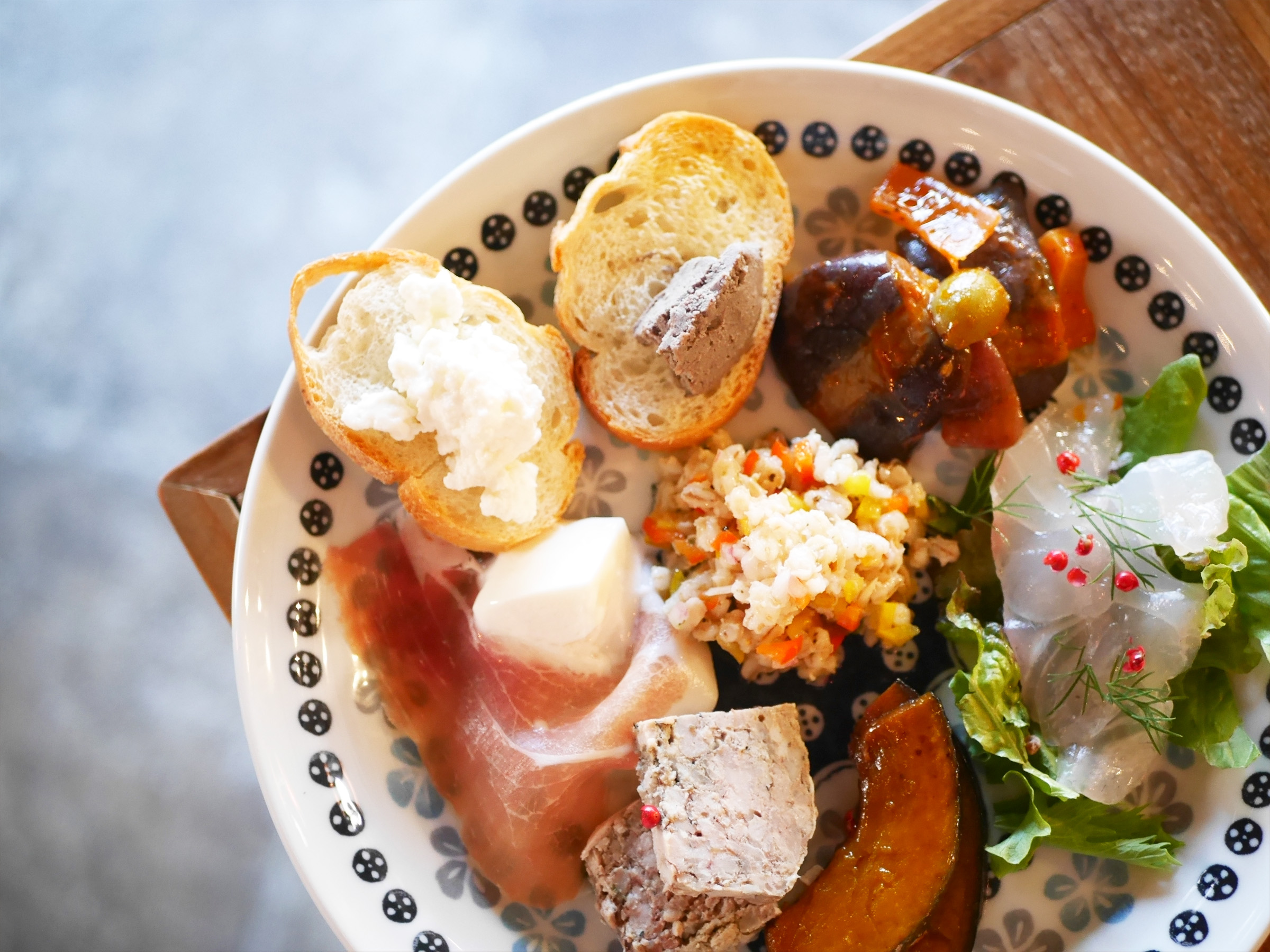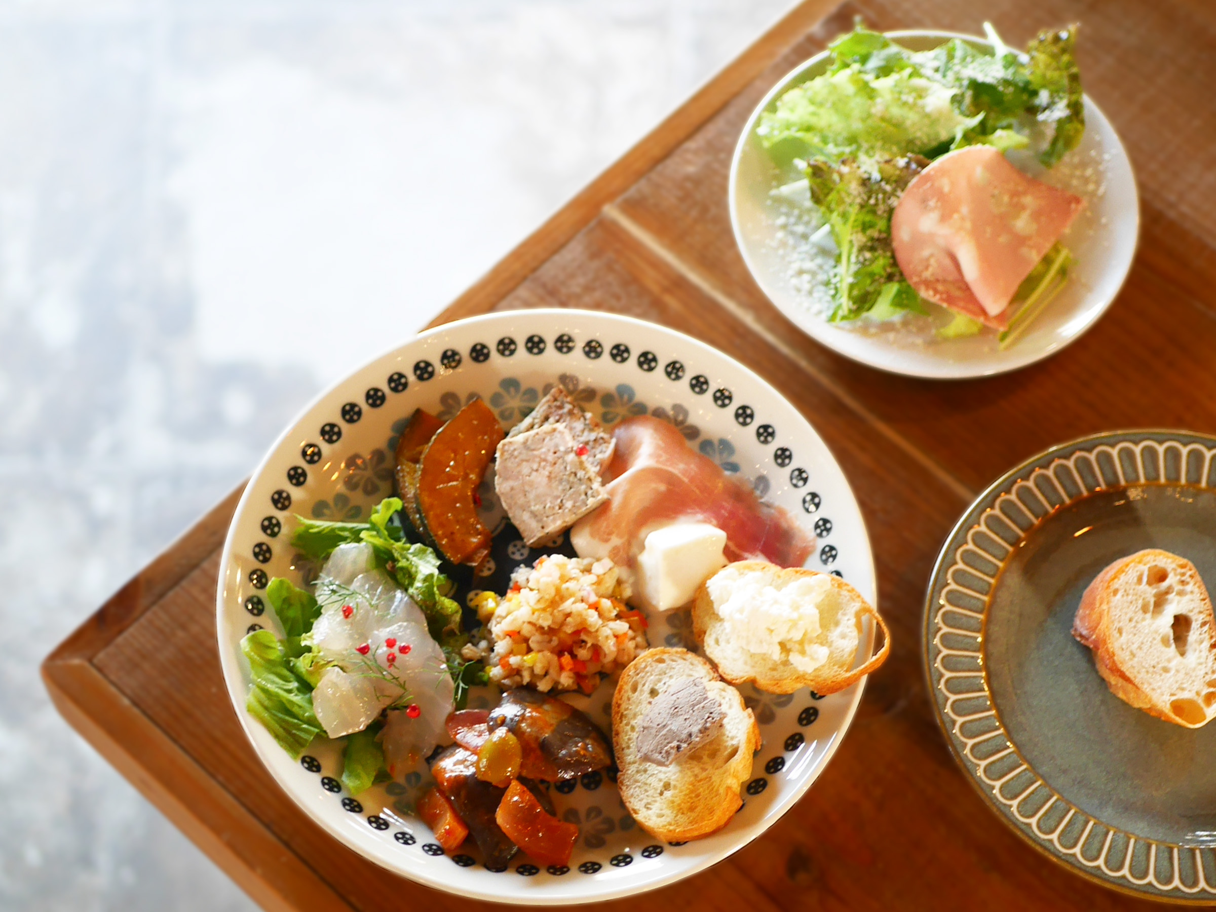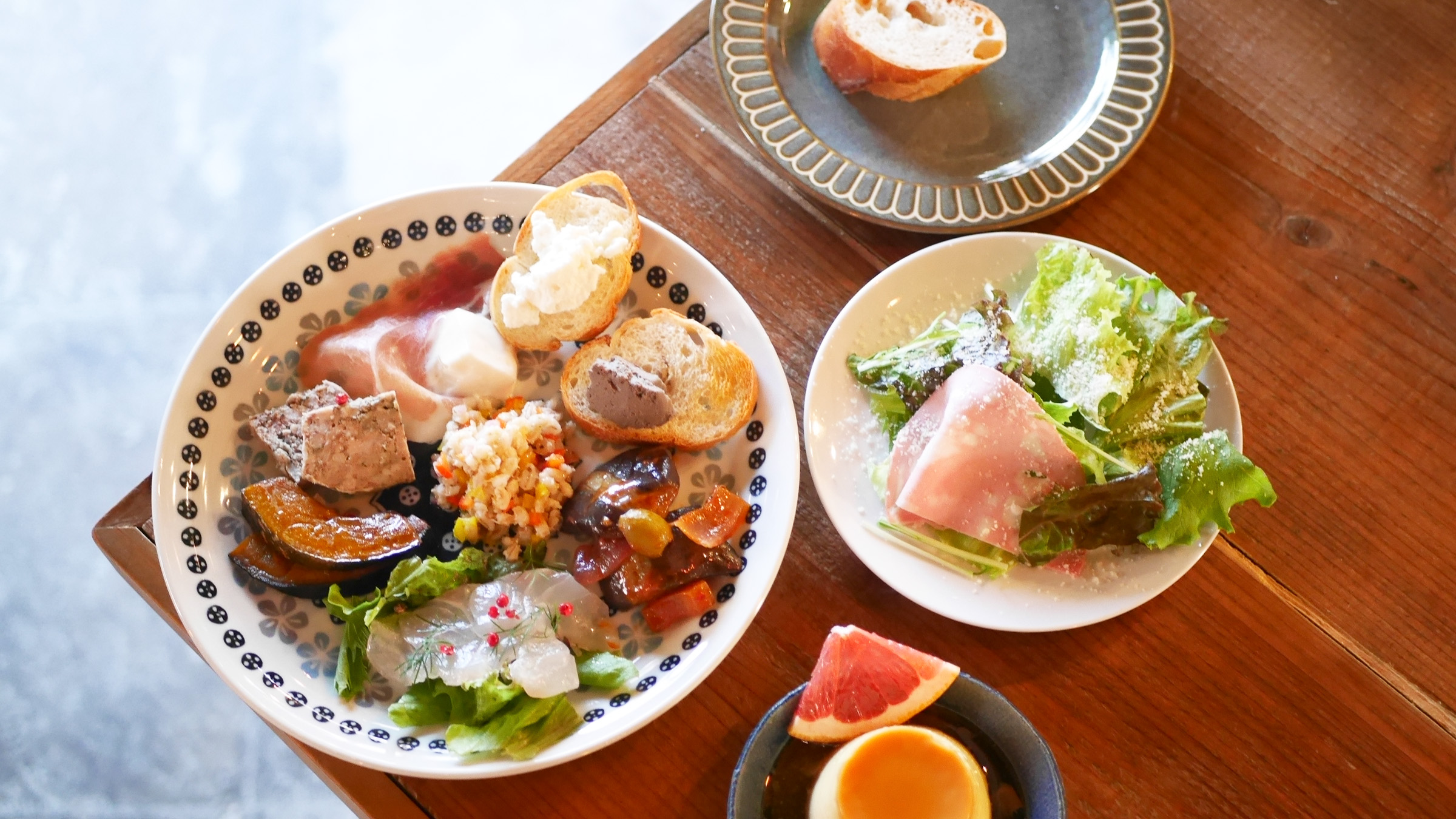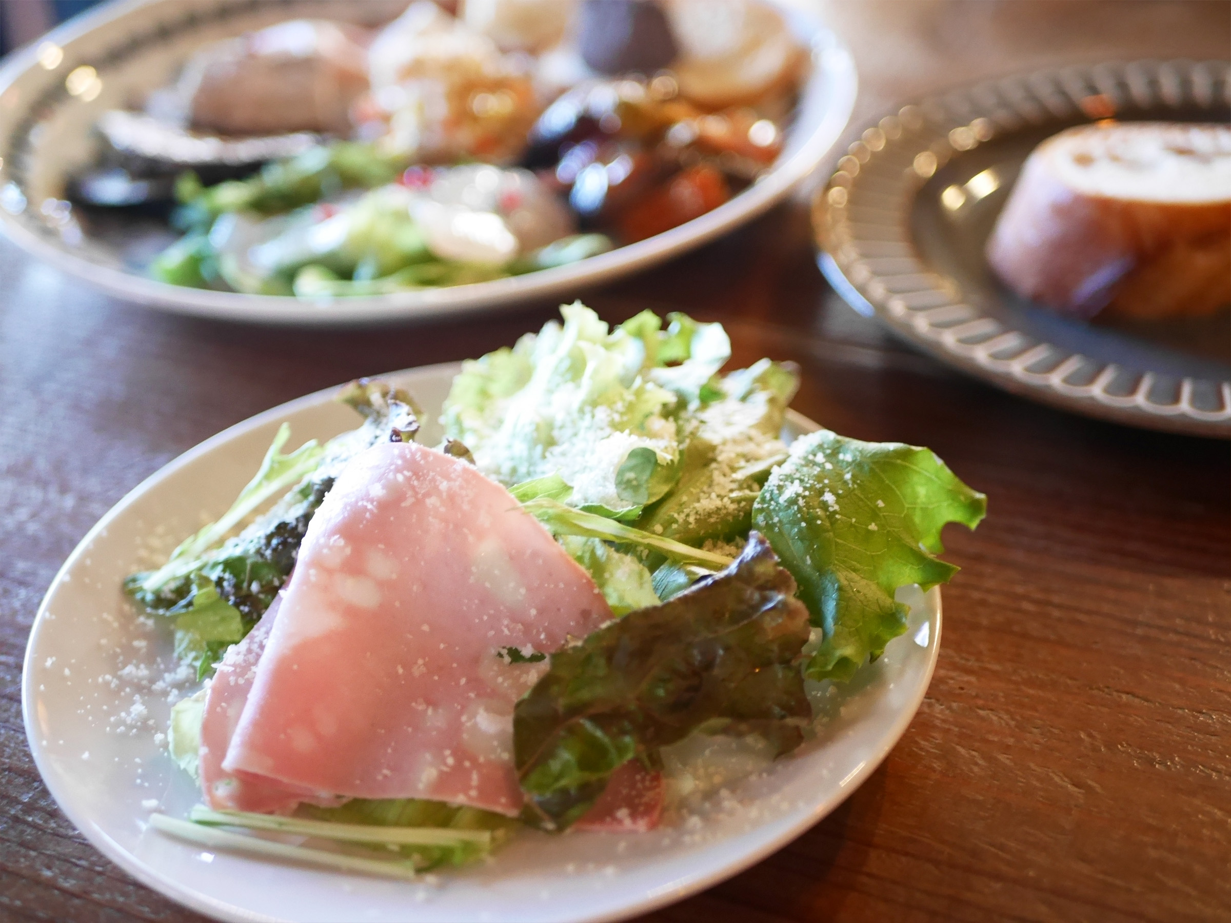 ランチセットは、生ハムのサラダに加え、自家製チーズを含む前菜8種、バゲット、デザート付き。見た目も華やかでボリューム満点です。