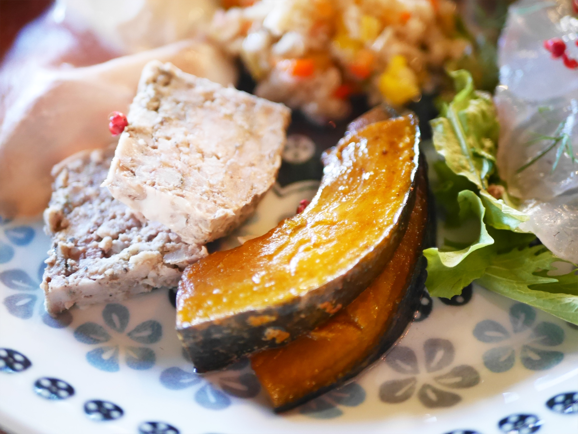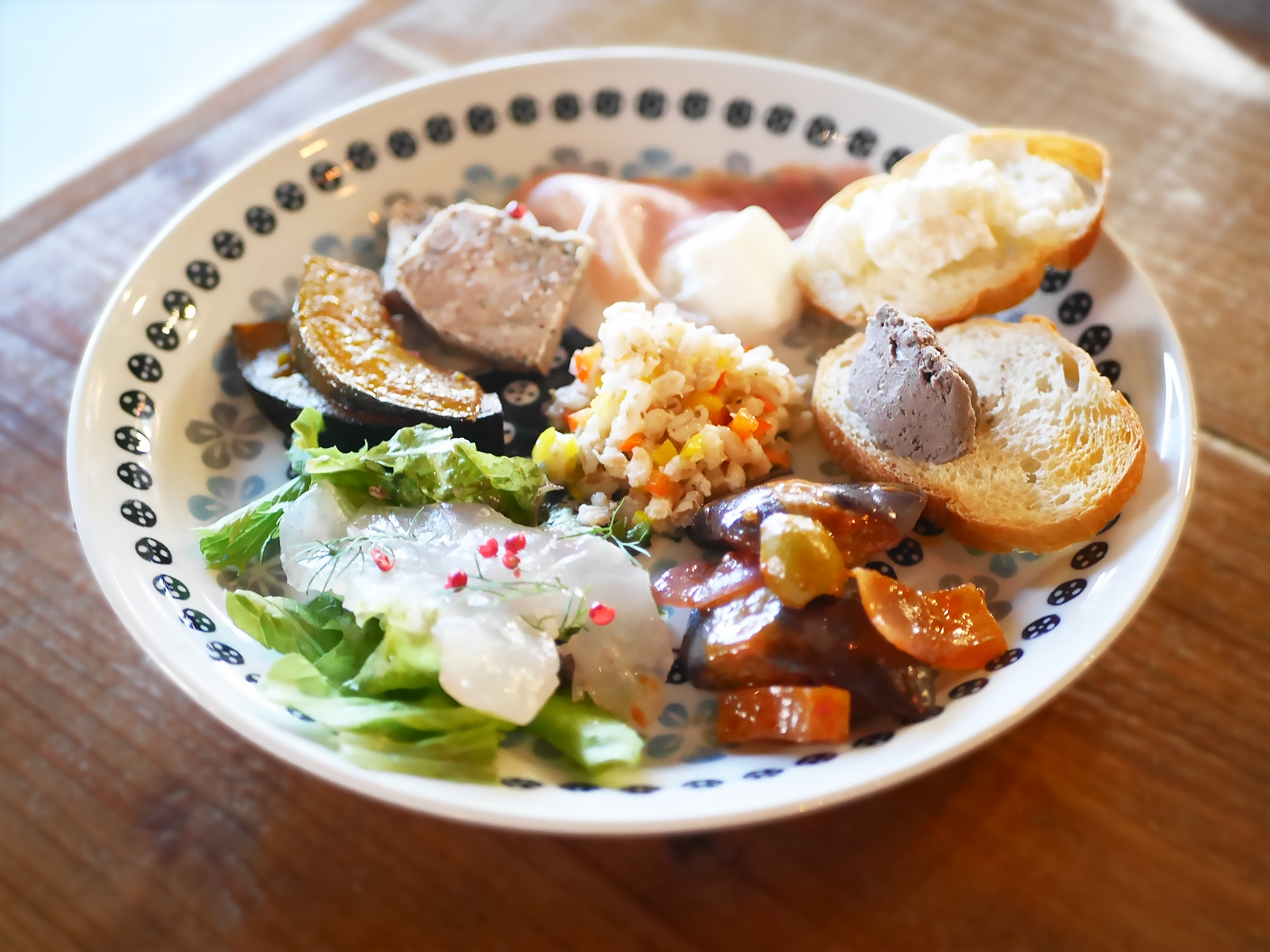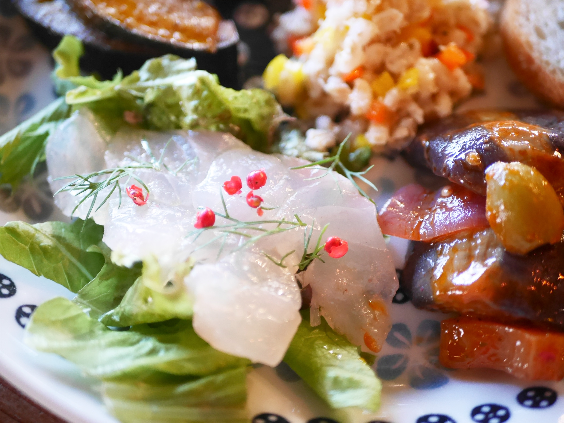 さらに魚介カルパッチョの繊細な旨み、濃厚なレバーパテ、粗挽きの肉感あふれるパテ・ド・カンパーニュ、甘酸っぱく煮込まれたナスのカポナータ、かぼちゃのアグロドルチェ、自家製ツナと大麦のサラダ…。8種それぞれが丁寧に仕込まれ、異なる味わいと食感が楽しめます。一つ一つの美味しさに頬が緩みます。