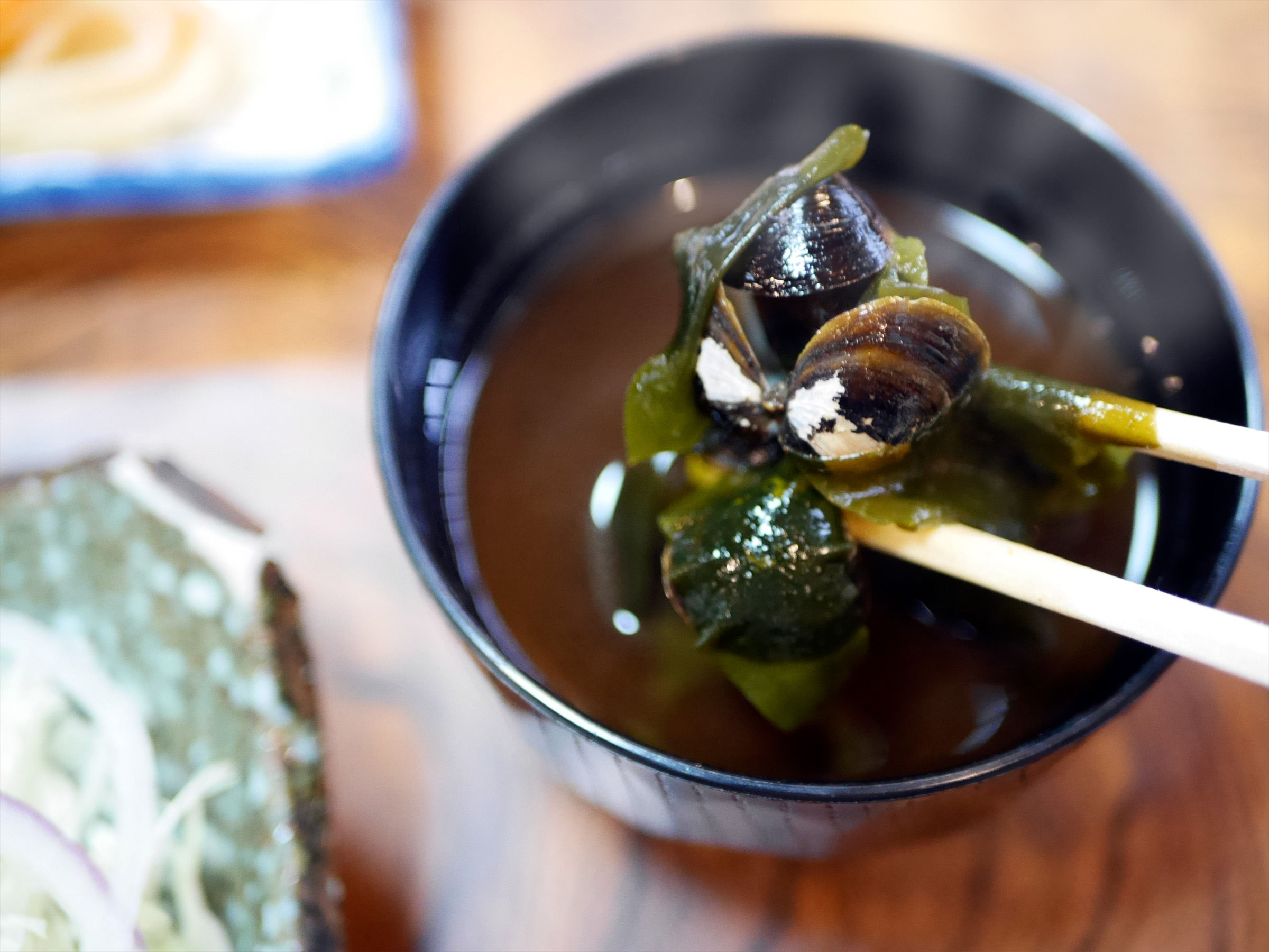 味噌汁は横浜「日本味噌」の豆味噌を使った赤だしで、しじみとワカメの旨みが広がります。