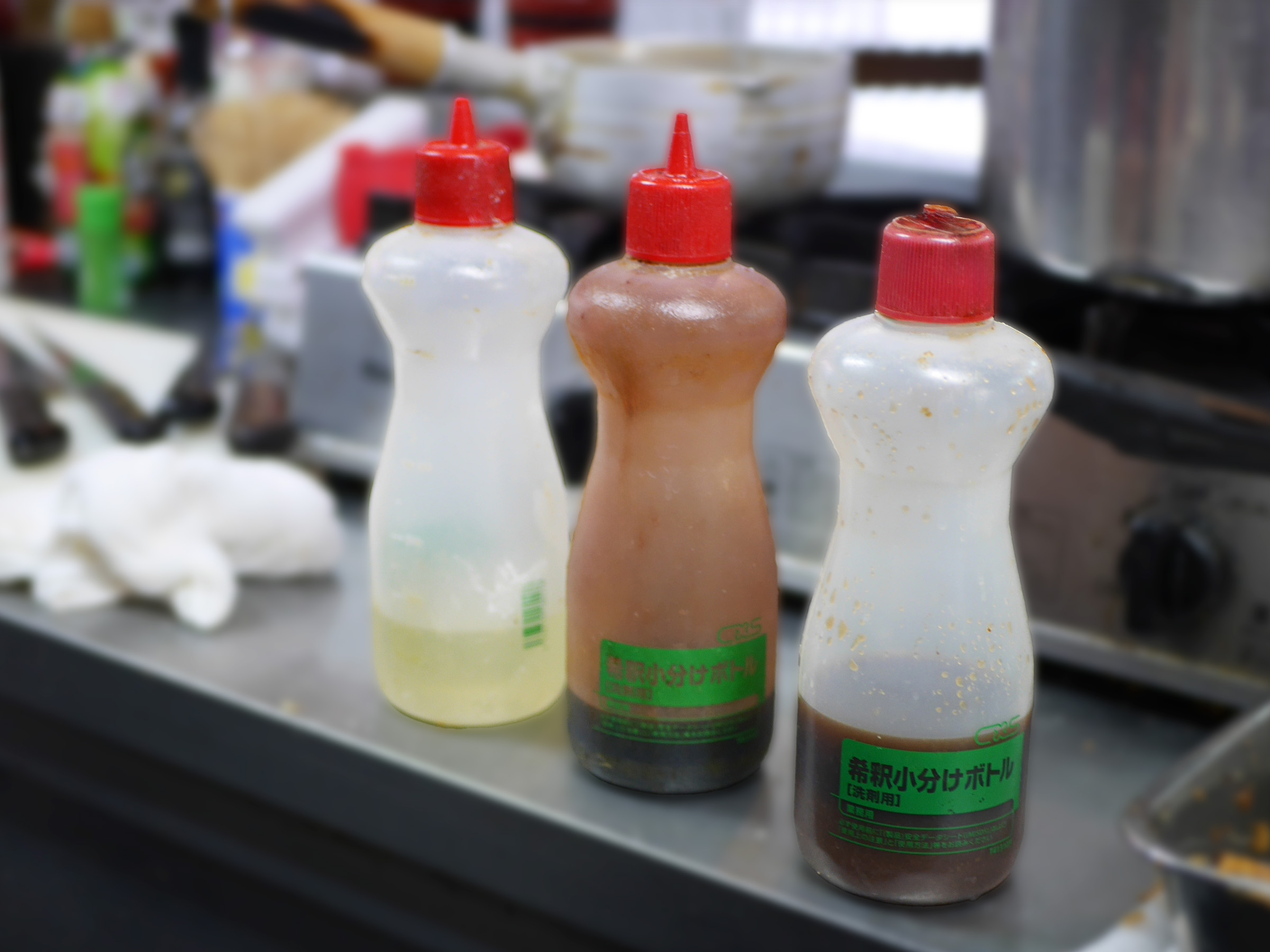 サラダ油・赤ワイン・特製ダレを3本のボトルで使い分けるのも職人の技。火の状態を見極めながら加えることで、外は香ばしく中はジューシーに焼き上ています。