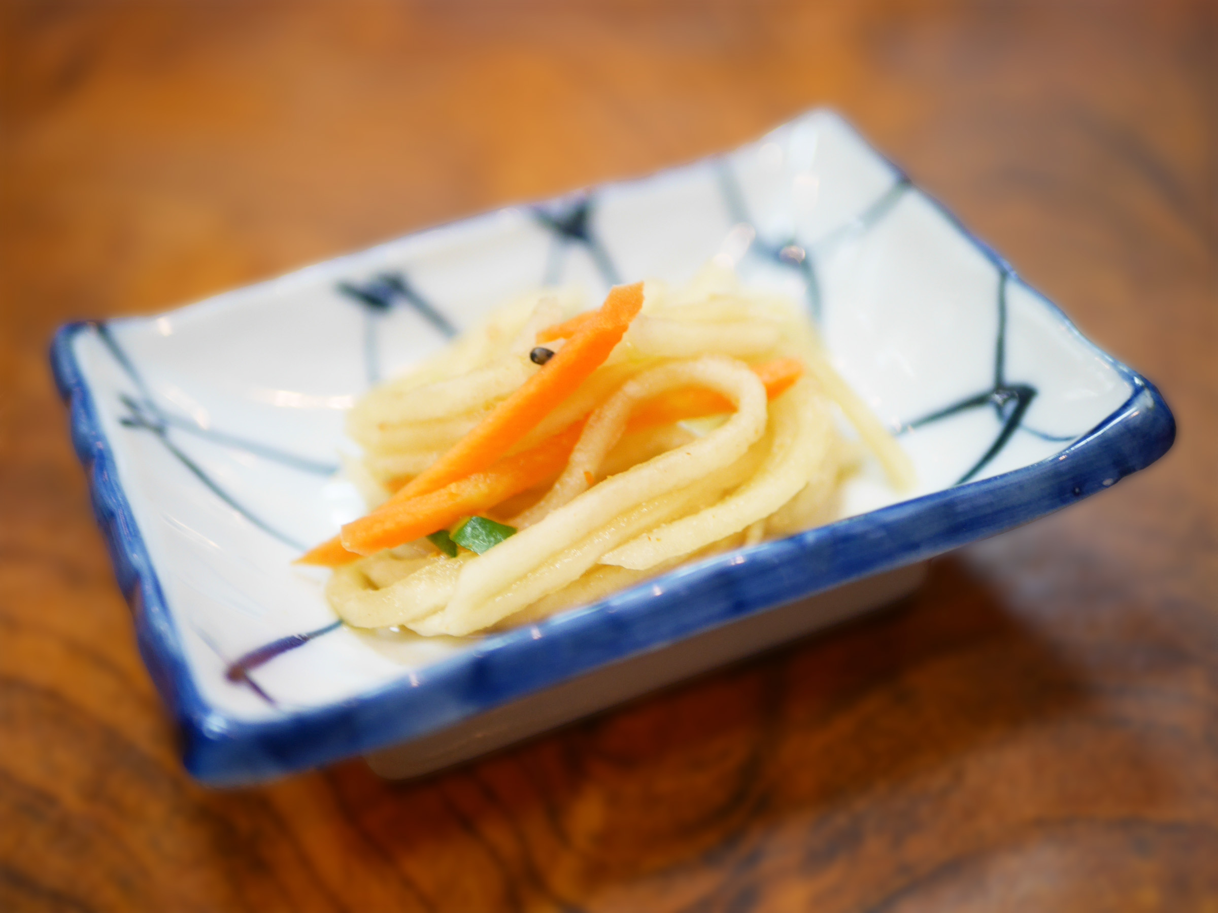 ふわふわの千切りキャベツ、マカロニサラダ、自家製の大根の漬けもの。ビーフコンソメで漬け込んだ大根は、ほんのりピリ辛で深みのある味わいが印象的です。