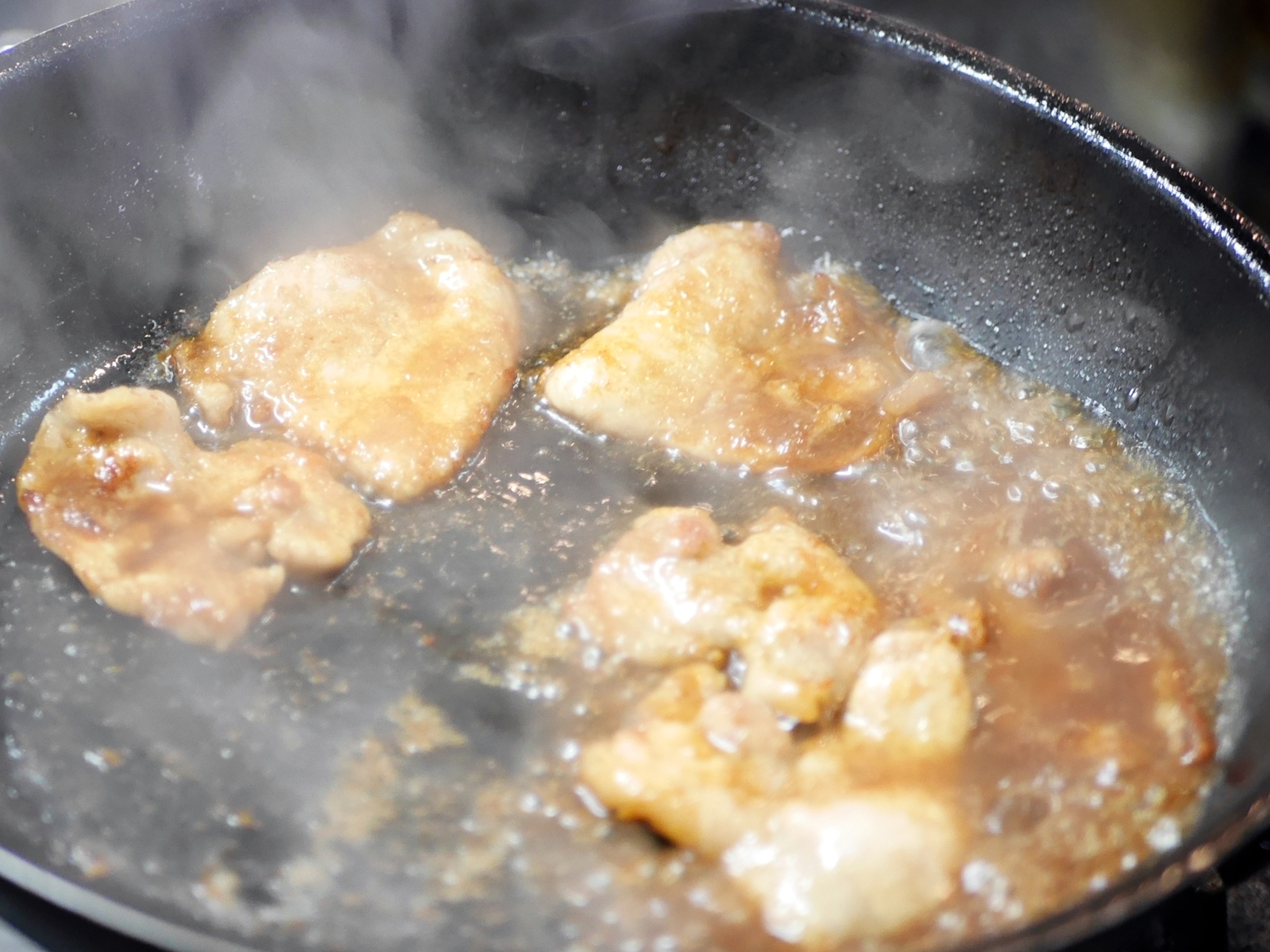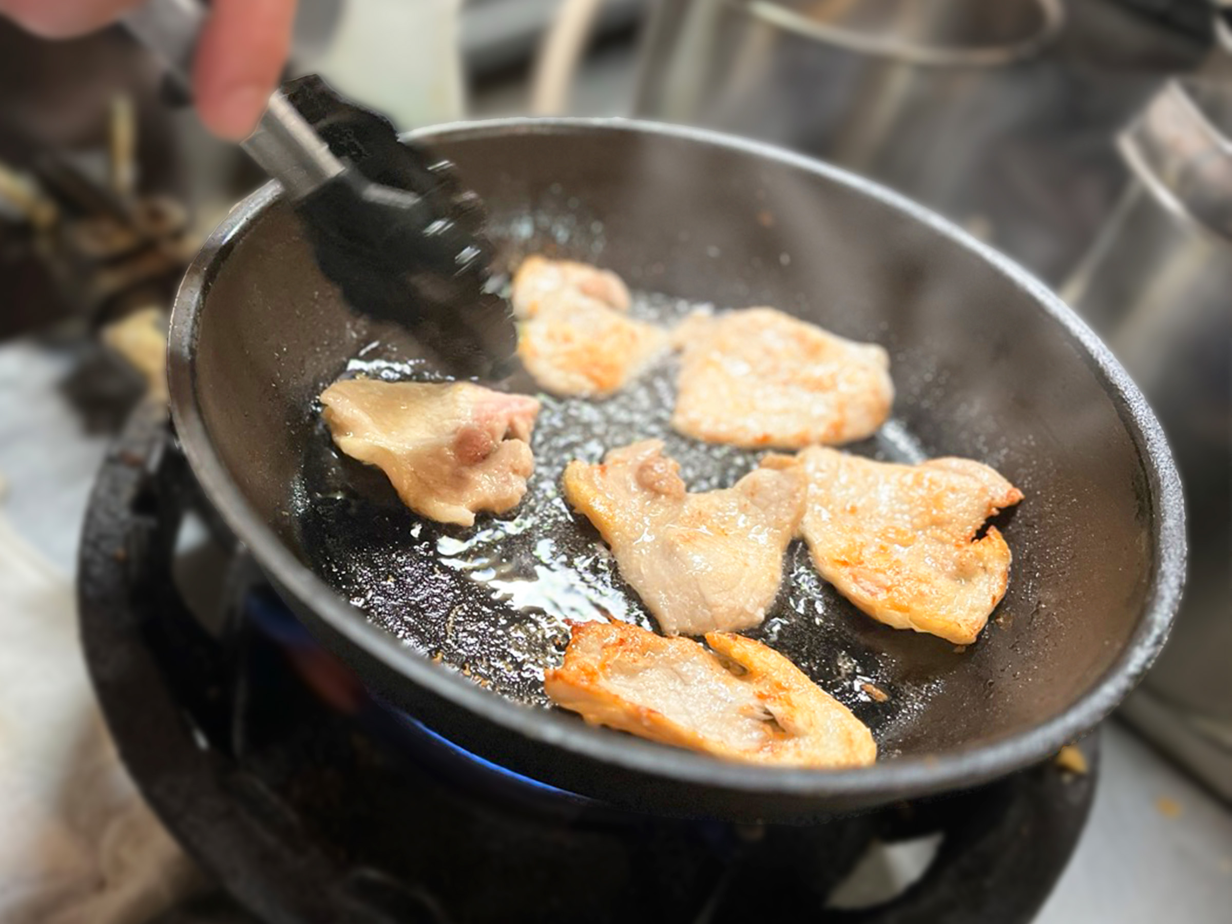 鉄フライパンに油を引き、赤ワインで豚の臭みを取り除きながら、肉の締まり具合に合わせて火加減を微調整します。仕上げに特製ダレを一気に絡めることで、香ばしさと深みが際立ちます。