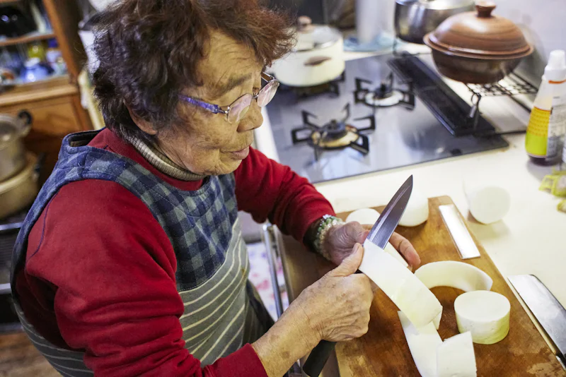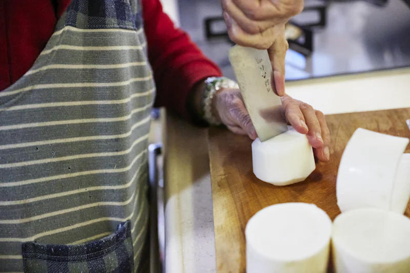 三浦海岸駅から徒歩でもすぐ、元茅葺だったという大きな家で待っていてくださったのは、三浦大根でフルコース料理を提案するなど、83歳の今も生産者として美味しく食べてもらう工夫を発信を続ける、吉田和子(ともこ)さんです。家族の食事を作り、畑にも出て、大根の加工品を作り、直売所「ヤマサ園」にも立つという、超のつく働き者ですが「三浦には21歳の時に静岡の山側からお見合いに来たんだけど、駅に降り立った瞬間、目の前に広がる海に一目ぼれして決めちゃったの。まだ相手に会ってないのに!」と、自ら運転する車の中で話して下さいました。