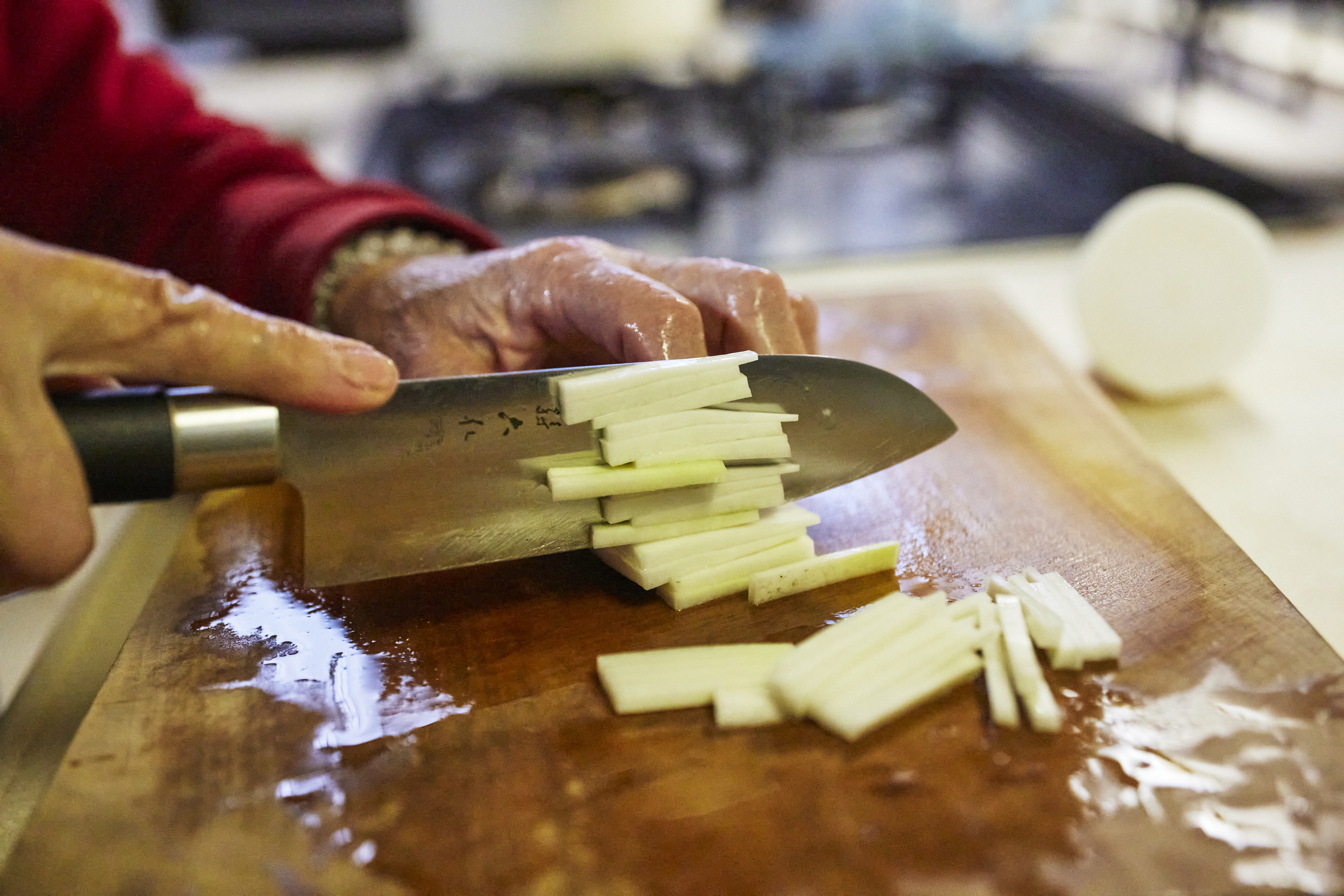 三浦海岸駅から徒歩でもすぐ、元茅葺だったという大きな家で待っていてくださったのは、三浦大根でフルコース料理を提案するなど、83歳の今も生産者として美味しく食べてもらう工夫を発信を続ける、吉田和子(ともこ)さんです。家族の食事を作り、畑にも出て、大根の加工品を作り、直売所「ヤマサ園」にも立つという、超のつく働き者ですが「三浦には21歳の時に静岡の山側からお見合いに来たんだけど、駅に降り立った瞬間、目の前に広がる海に一目ぼれして決めちゃったの。まだ相手に会ってないのに!」と、自ら運転する車の中で話して下さいました。