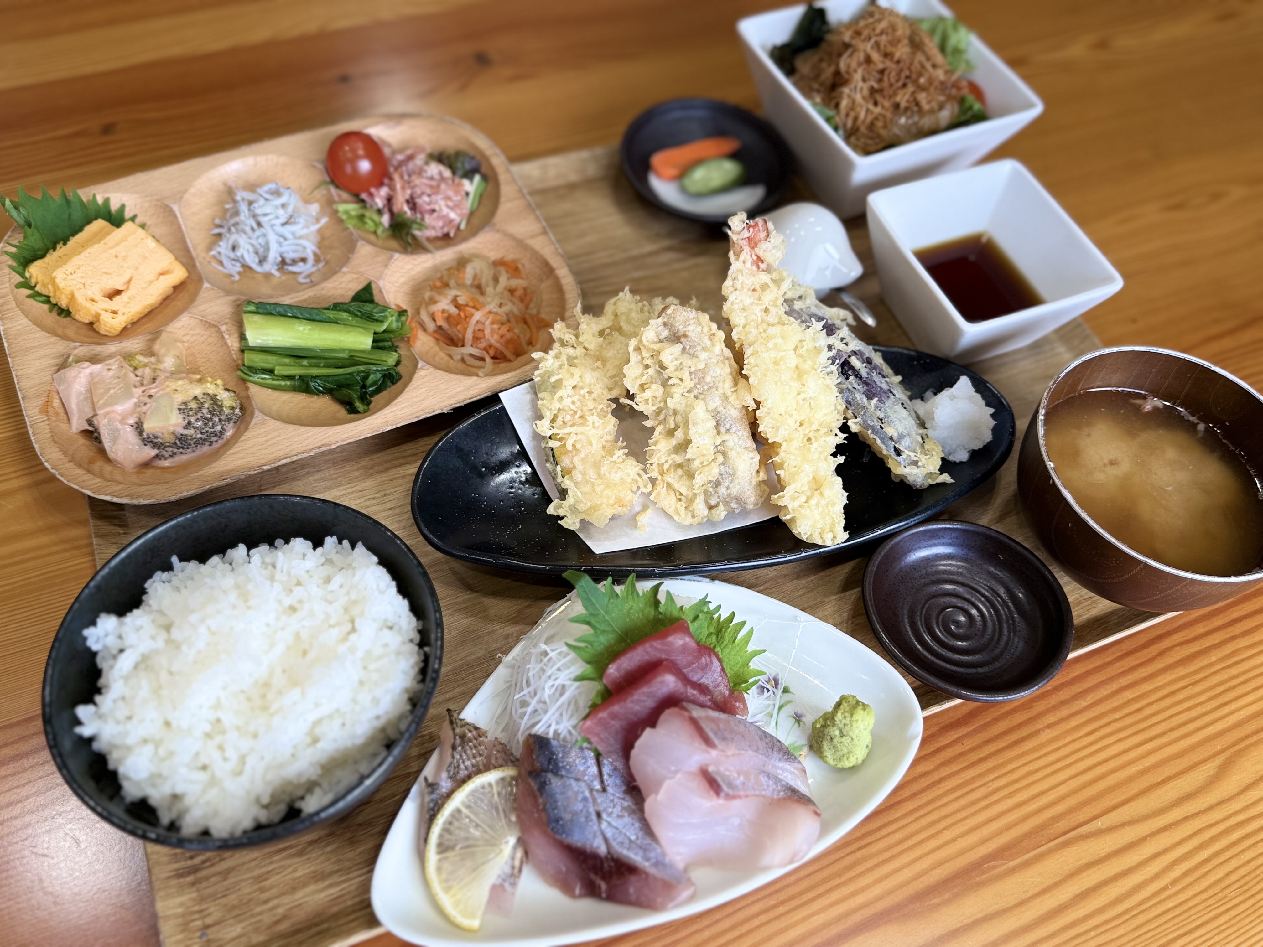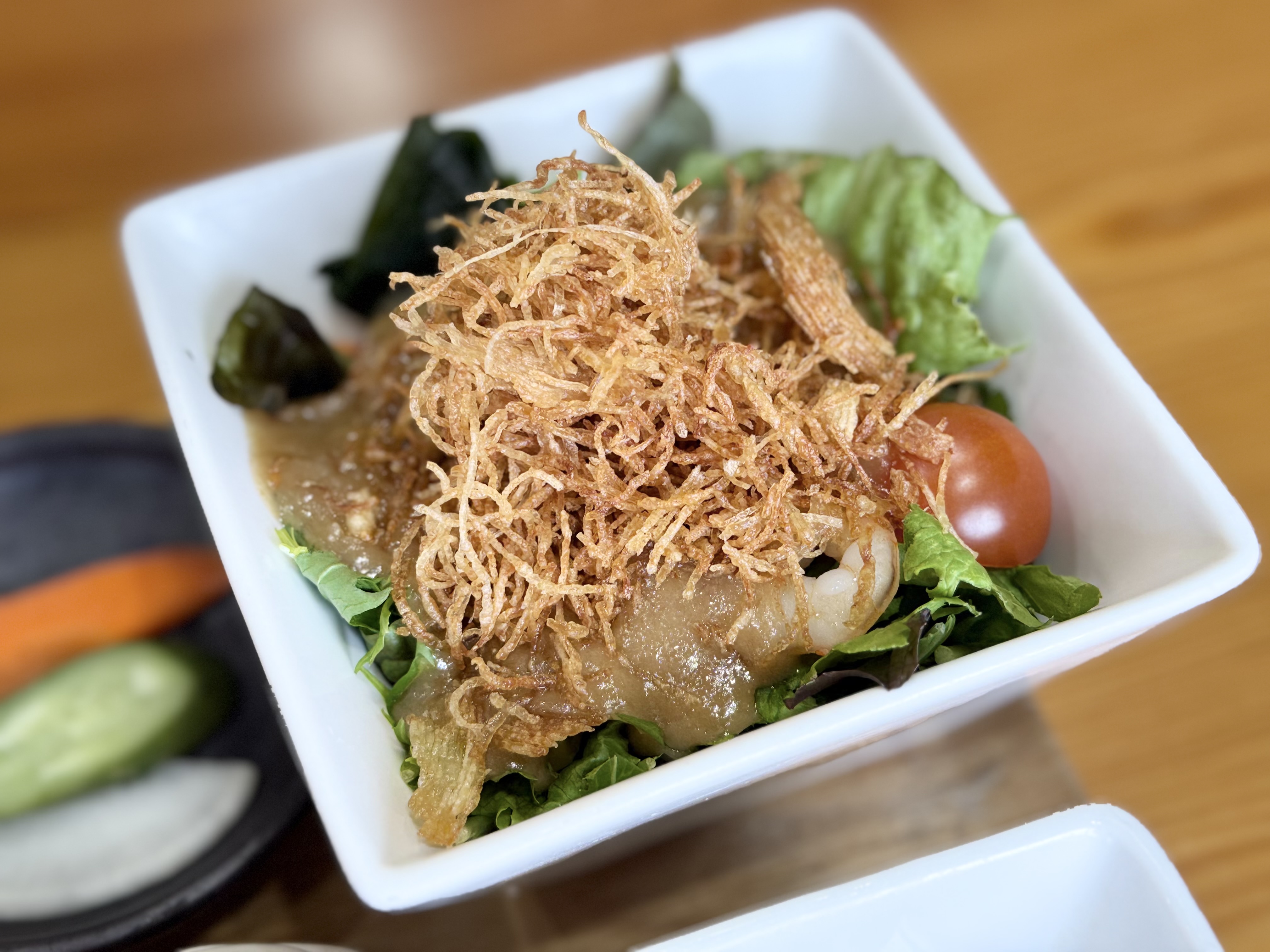 定食に添えられるサラダにかけられているのは、「横須賀野菜ドレッシング 特濃たまねぎ」です。ひと口食べると、まず玉ねぎのやさしい甘みがふわっと広がります。焦がし玉ねぎのコクに、みそのまろやかさが重なり、酸味は控えめ。野菜本来の味をそっと引き立ててくれるので、気づけば箸が止まらなくなります。玉ねぎをふんだんに使い、味噌やアンチョビを加えた自社製ドレッシングは、サラダはもちろん、しゃぶしゃぶや魚料理とも相性抜群。「かける」だけでなく「つける」楽しみ方ができるのも魅力です。店内のほか、「YOKOSUKA PRIDE MARKET」や横須賀市内の土産物店でも購入できます。