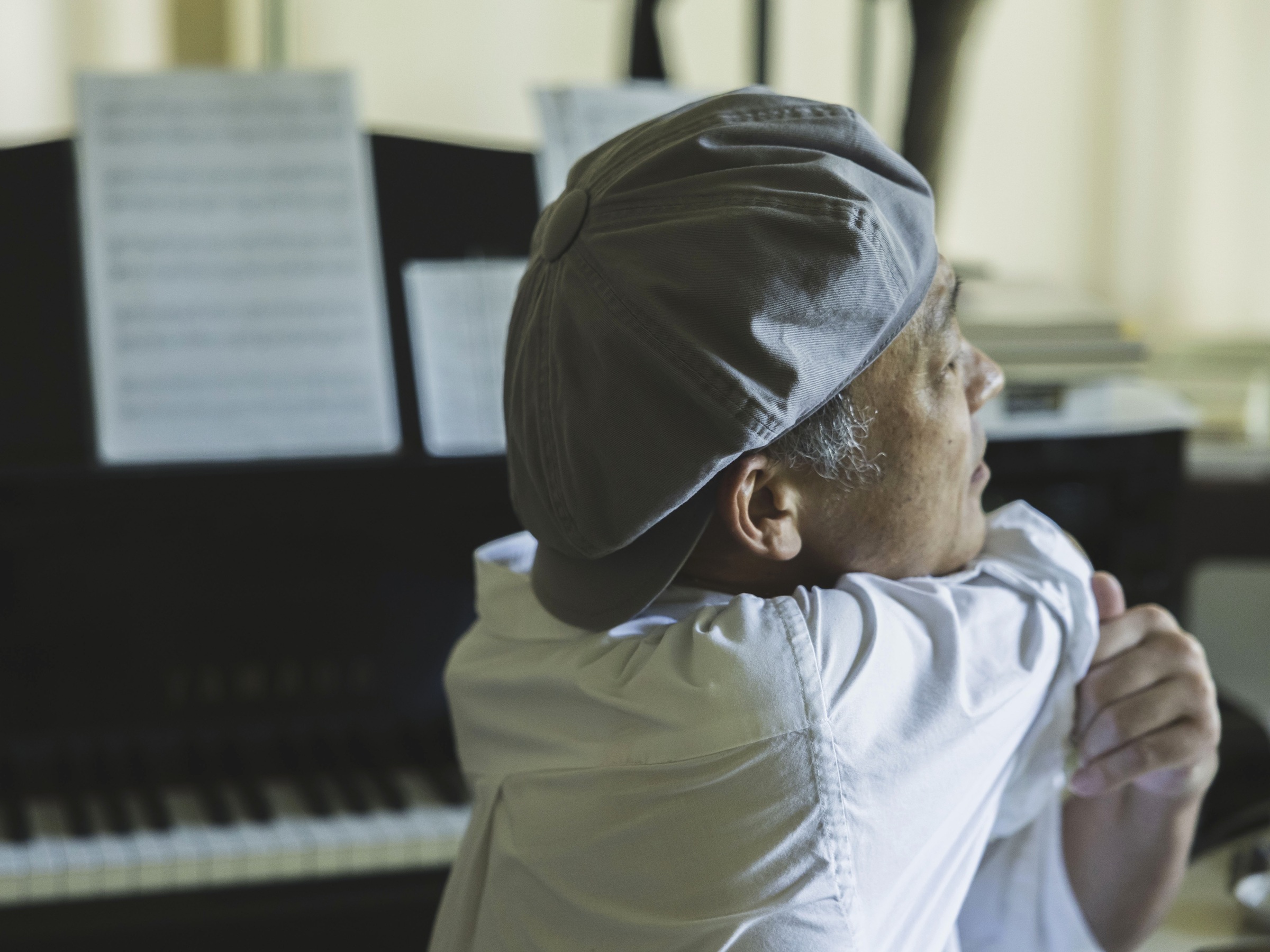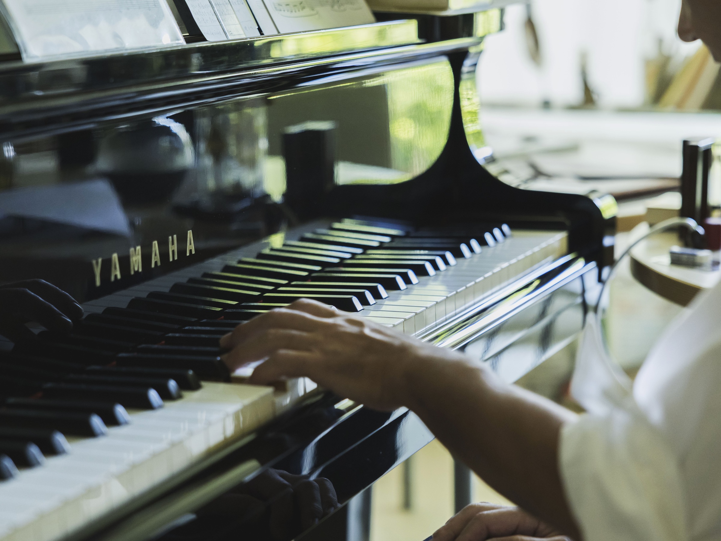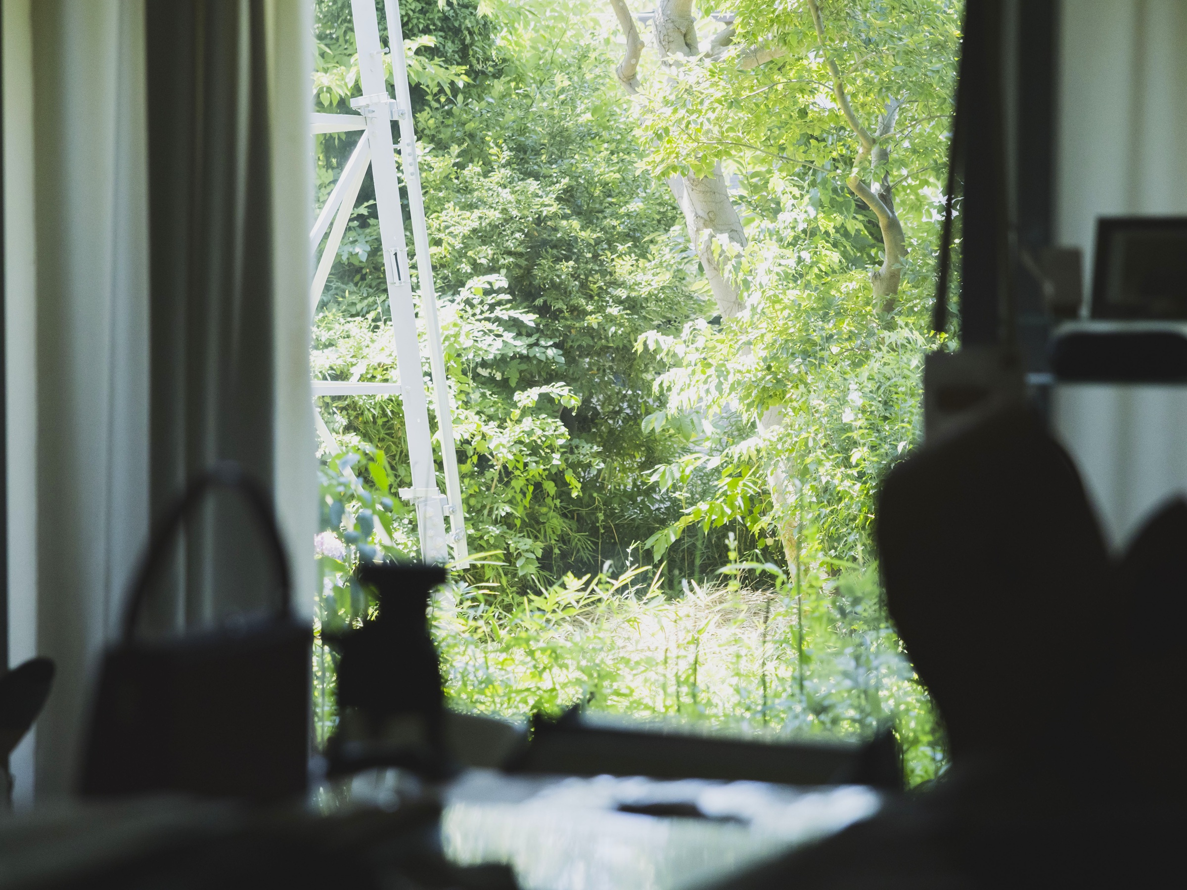 万緑の中に佇むアトリエのカーテンの隙間から見えるのは、生い茂った木々とその隙間から注ぐ陽の光。シダータさんがこのアトリエを建てる際に大切にしたのは「革仕事とピアノが共存できる空間」と「大島桜を残すこと」でした。