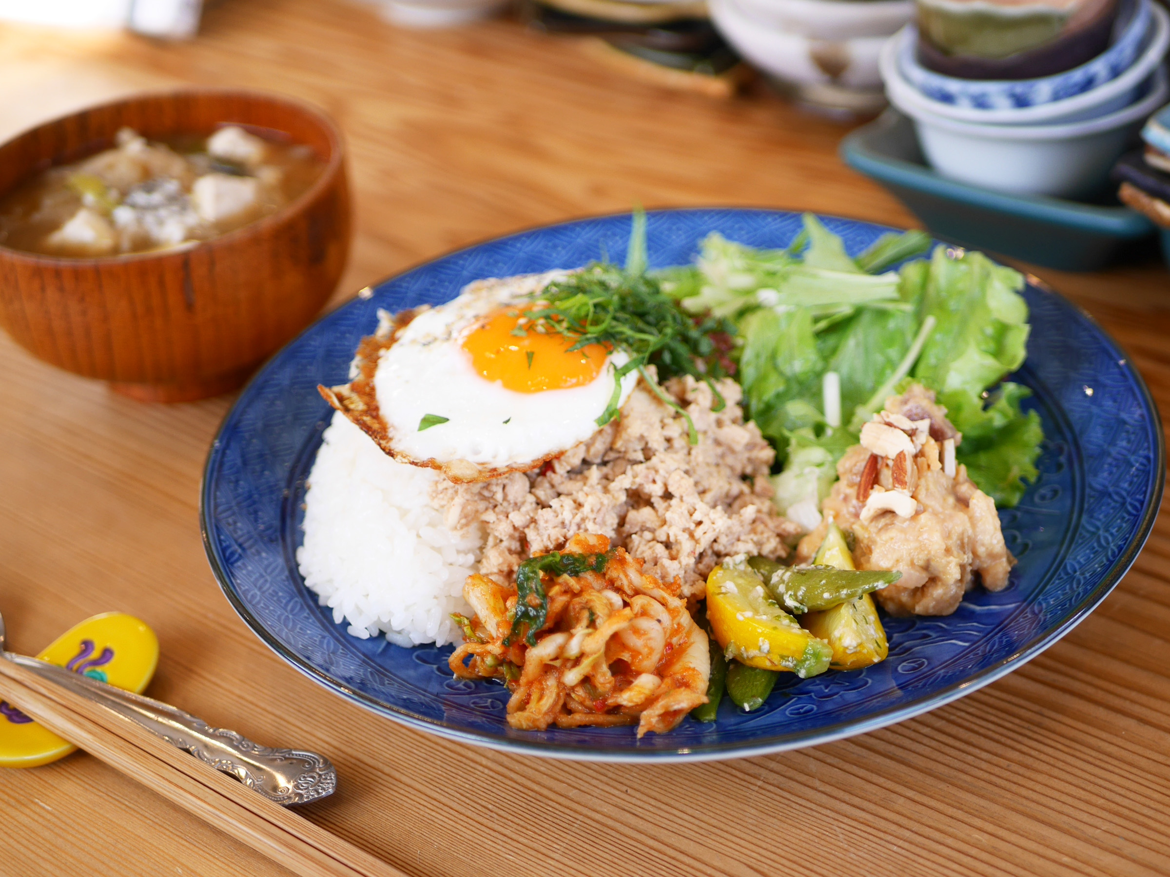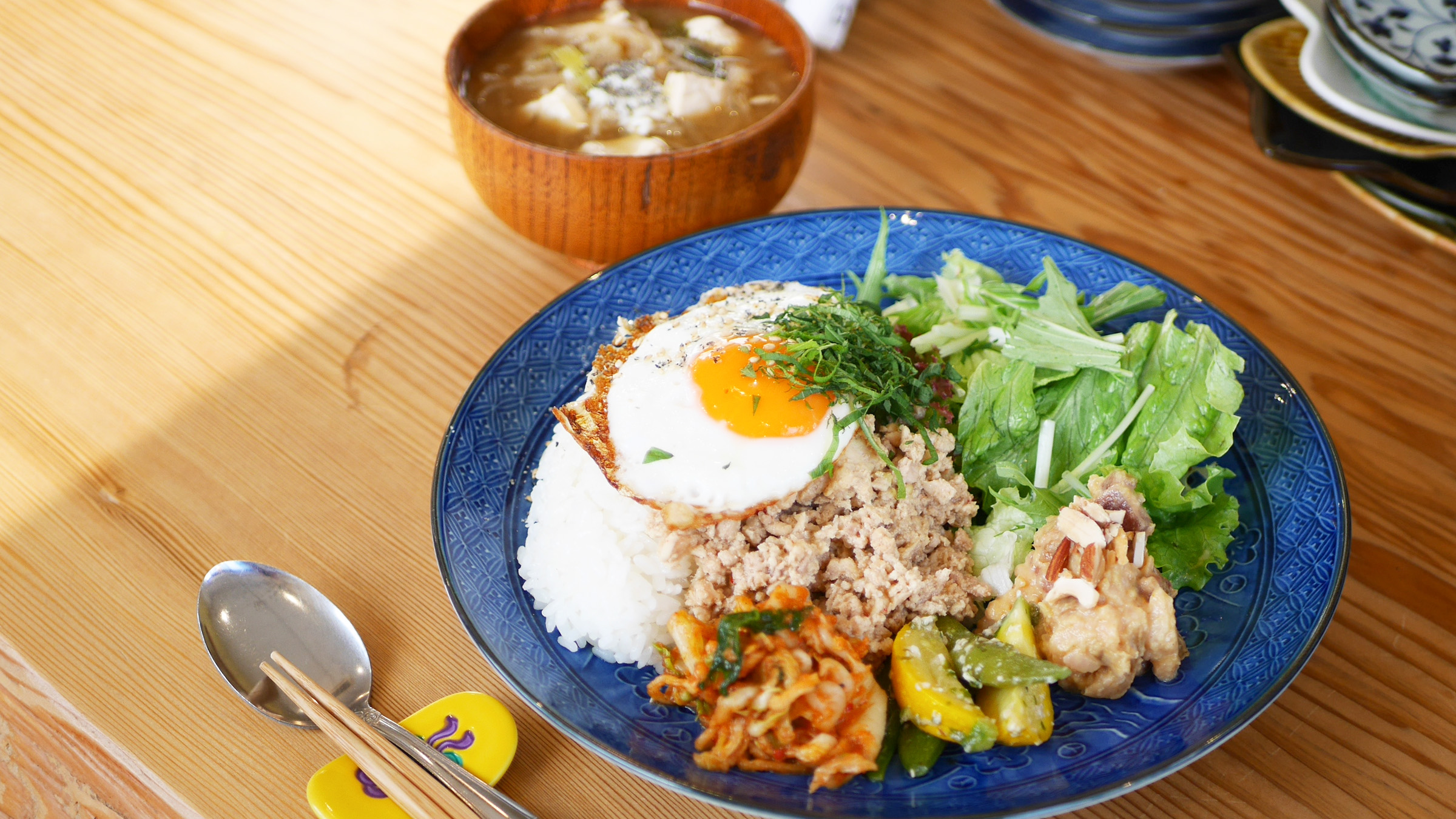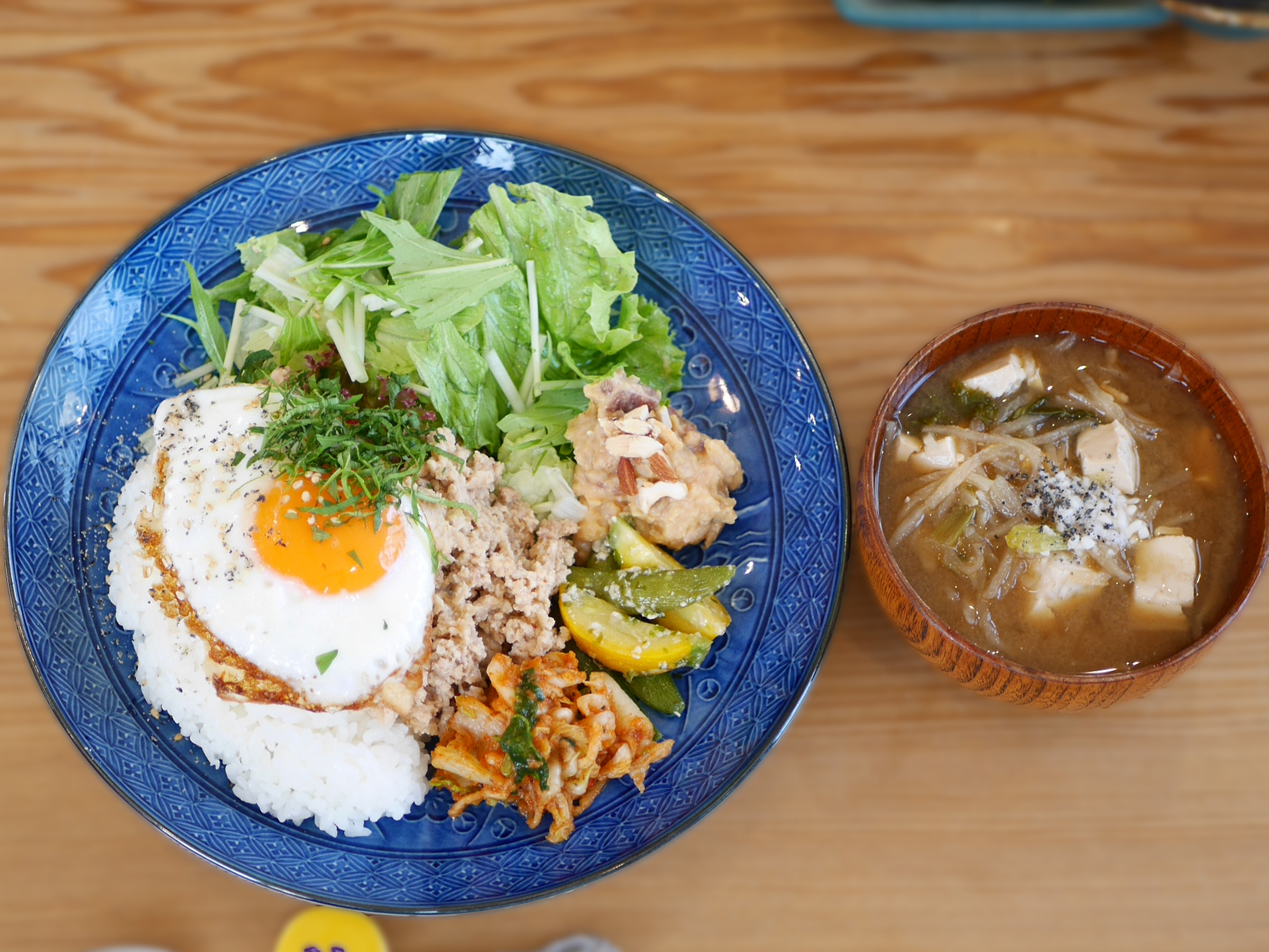 週替わりの腸活ランチは、すべてに和風出汁と塩麹をベースに使用し、栄養面も徹底配慮。人気の「和風ガパオライス(1300円税込)」は、たっぷりのお肉とご飯に目玉焼きがのり、サラダと副菜3種が添えられた、ボリュームあるワンプレートスタイル。