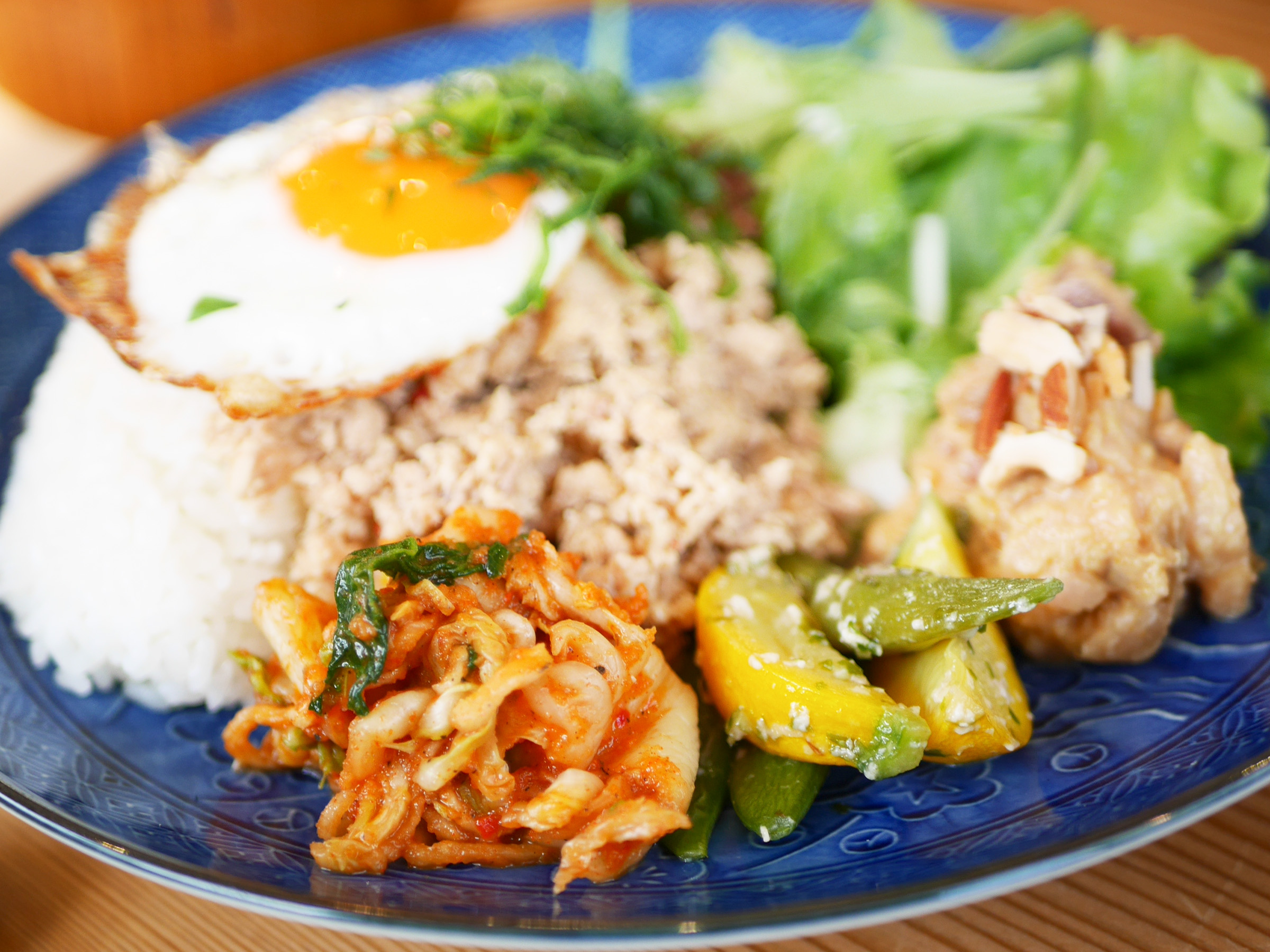 ふんわり立ちのぼるガパオの香りと、盛り付けられた3種の副菜が見た目も華やかで食欲をそそります。
