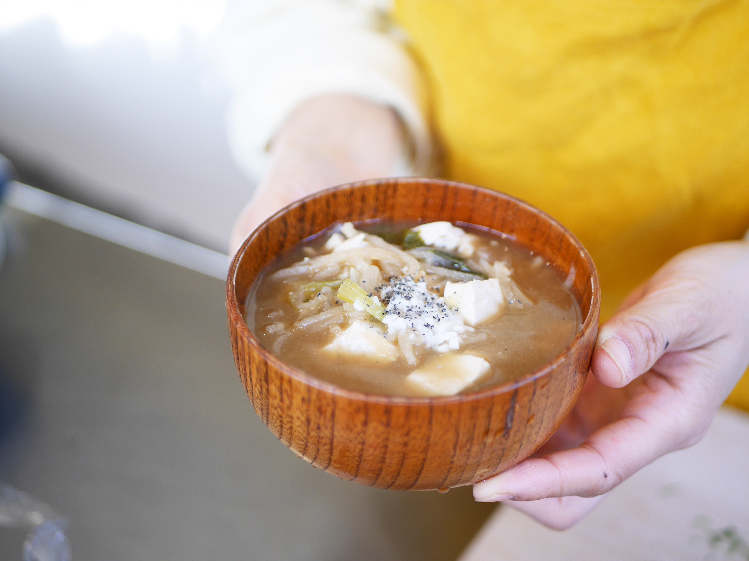 一緒に提供される「具沢山味噌汁」も見逃せません。切干大根の戻し汁と麹のやさしい甘さがじんわりと体にしみわたり、気持ちも体もゆるむような感覚になります。