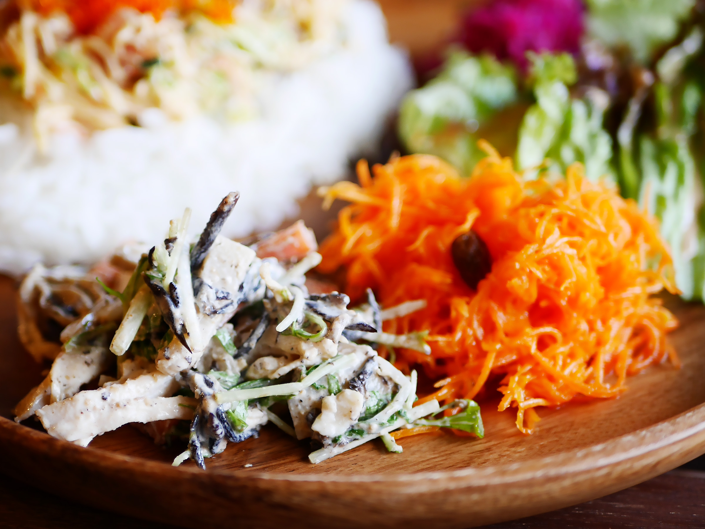 横須賀野菜のサラダに、キャロットラペ、三浦のひじきを使ったささみやレンコン、水菜などの副菜が添えられ、栄養バランスにも配慮。女性を中心に高い人気を得ているのも納得です。