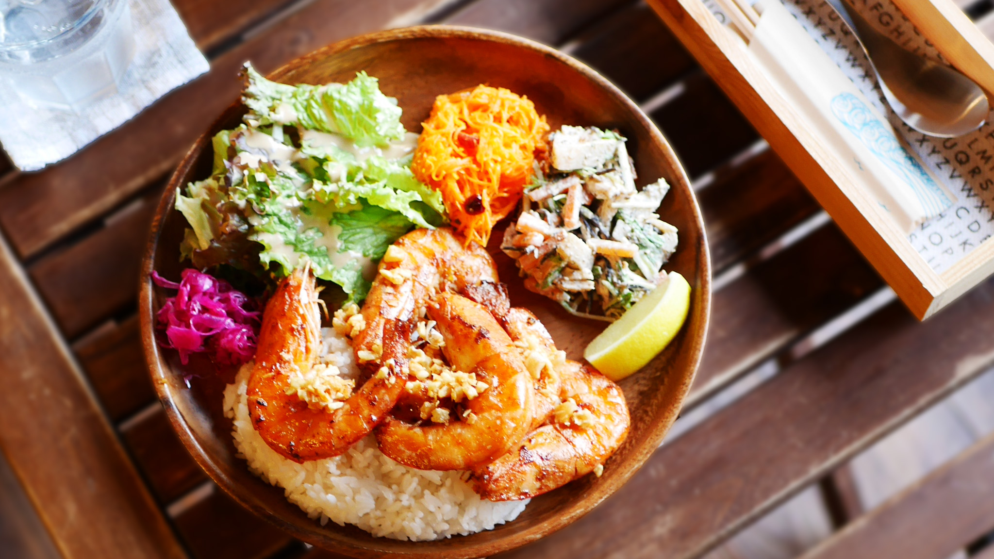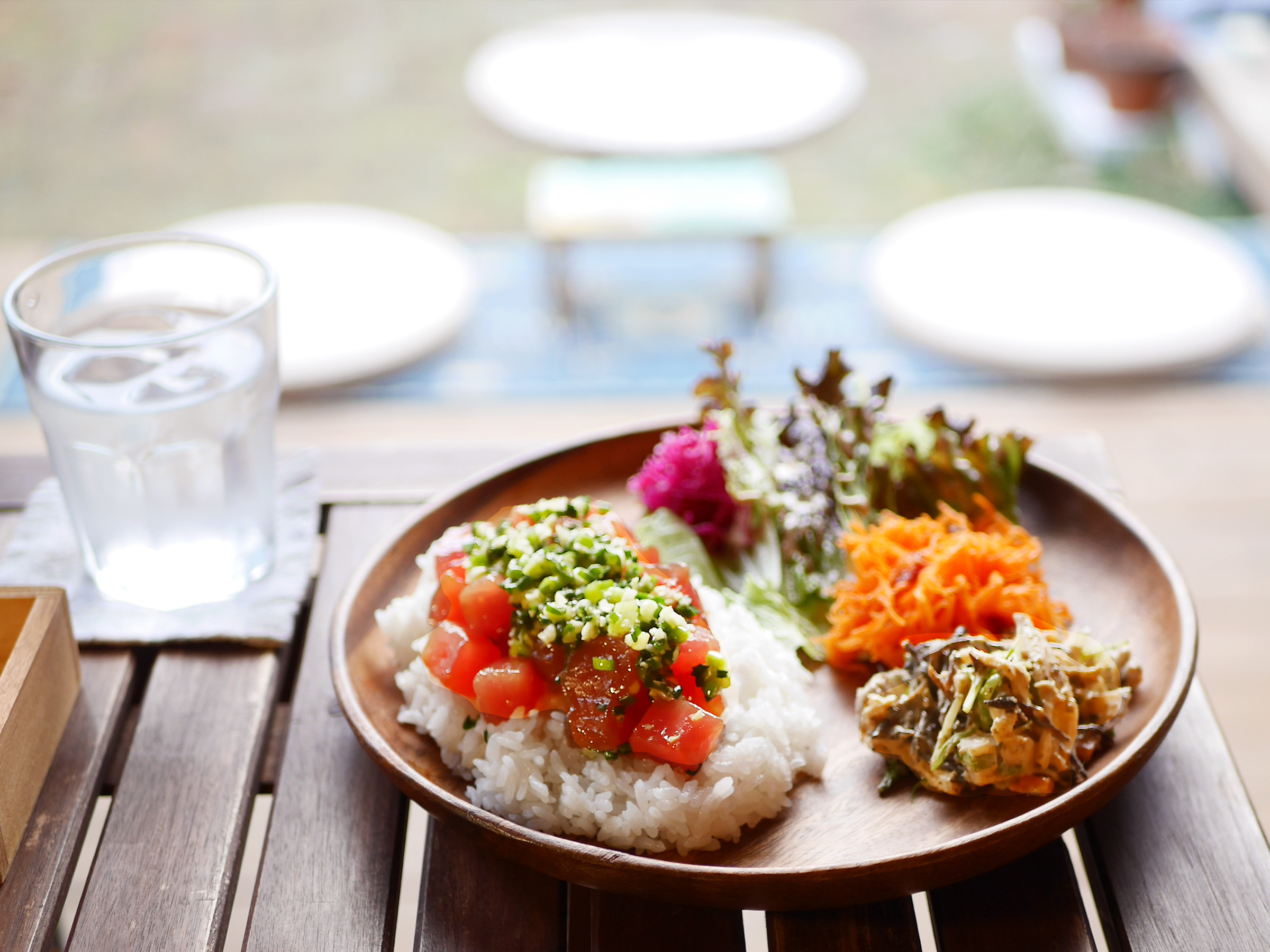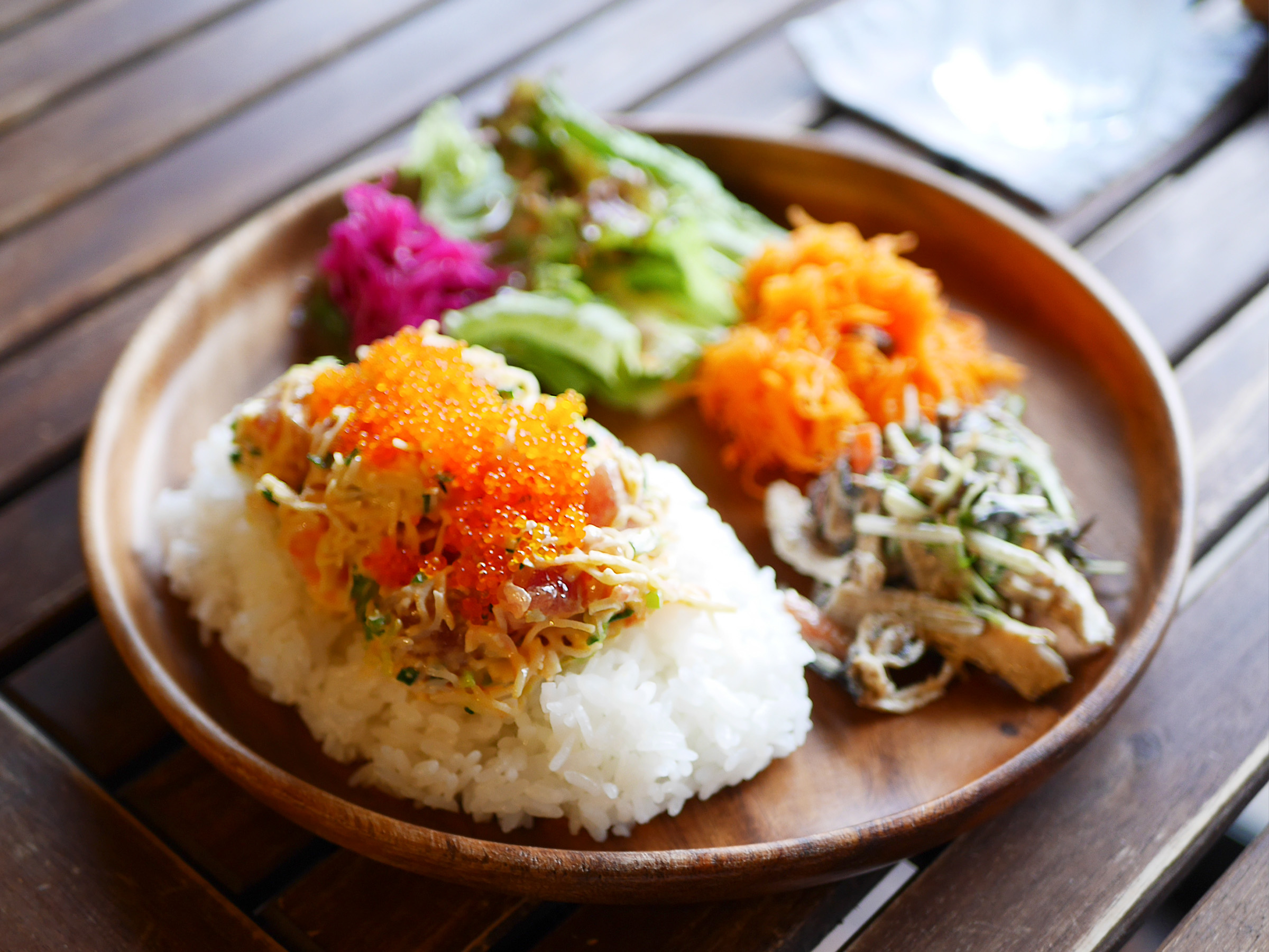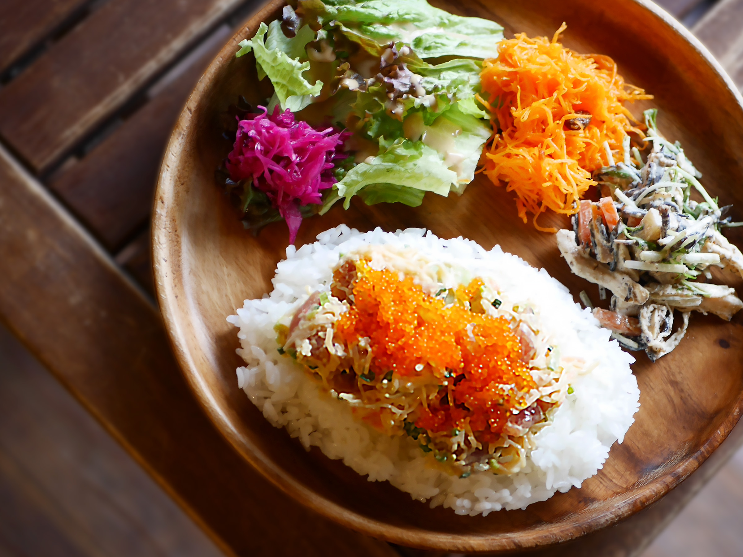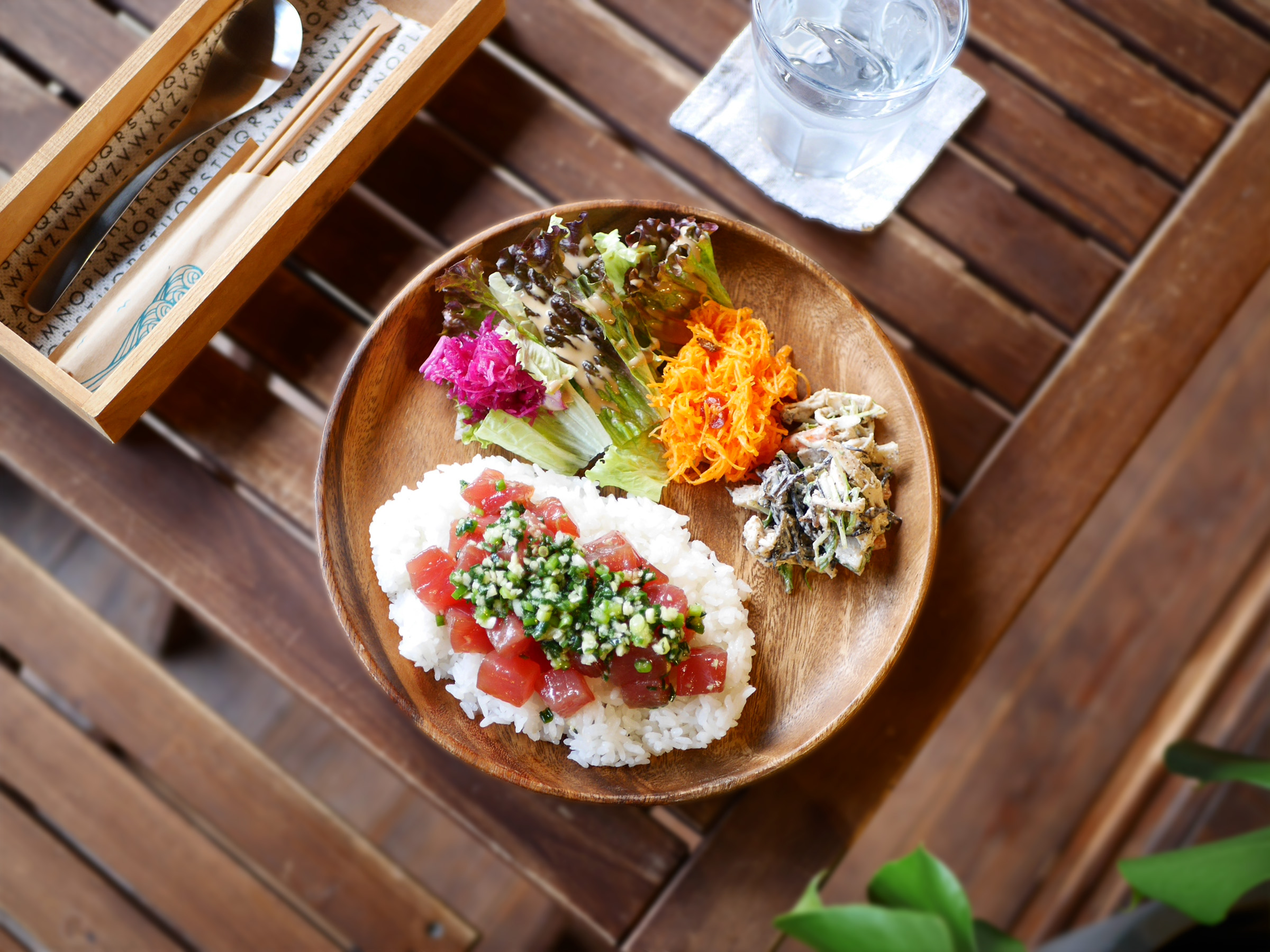 看板メニューの「スパイシー アヒポキプレート」は、康裕さんが特に愛していたハワイの人気フレーバー。マヨネーズとごま油、香味野菜を合わせた自家製スパイシーソースは、ヘルシーでありながら、こってりとしたコクに、後から穏やかなチリの辛みが追いかけてきます。