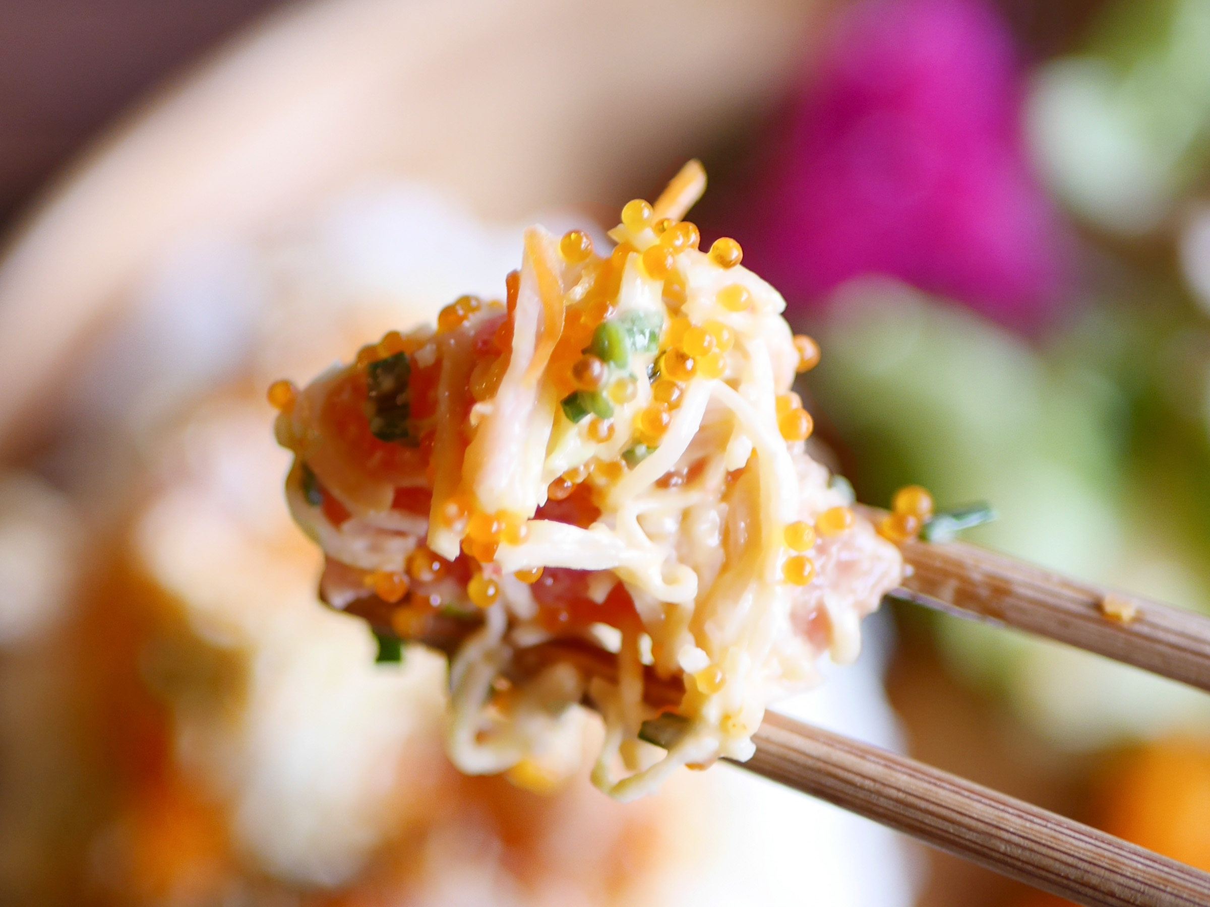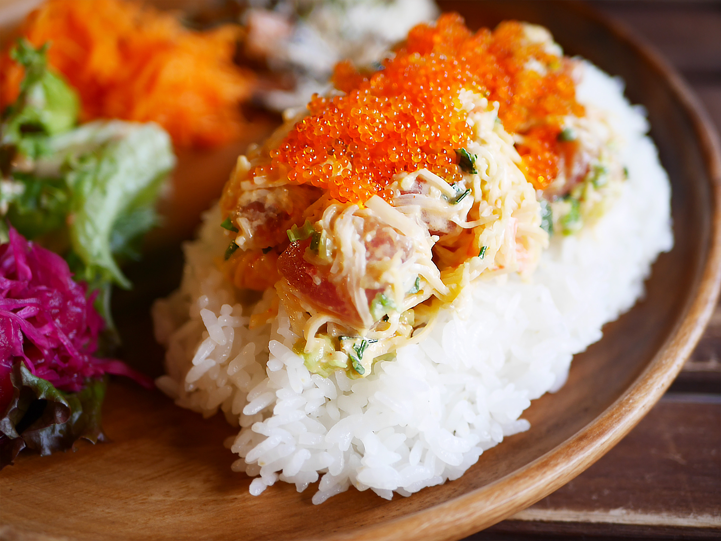 艶やかなマグロの角切りにマヨネーズベースのスパイシーソースが絡み、とびっこがたっぷりと重ねられ、周りにはサラダや副菜が並ぶワンプレート。その華やかな見た目に、思わず箸が伸びます。濃厚でコクがありながら後味は軽やか。ひと口ごとに食欲を刺激する、やみつき必至と評判の一皿です。