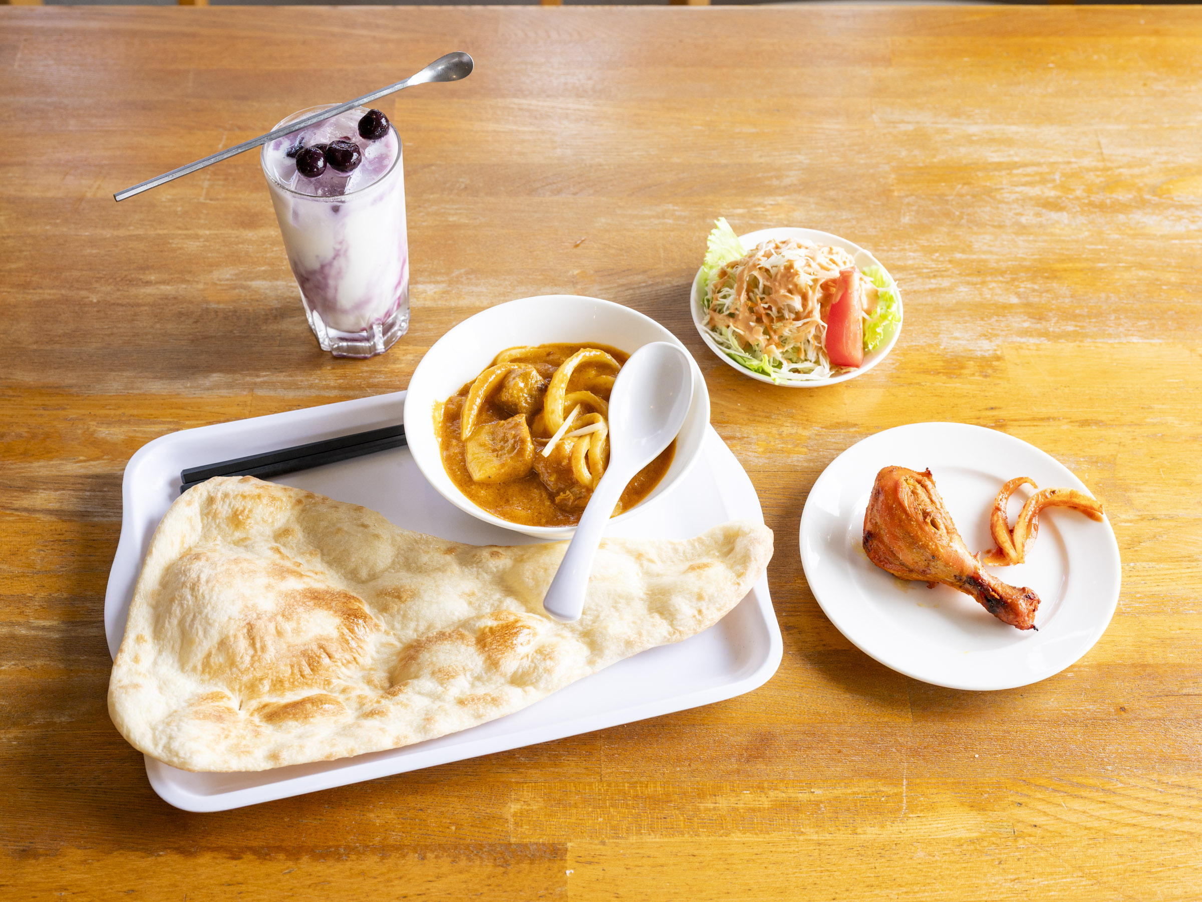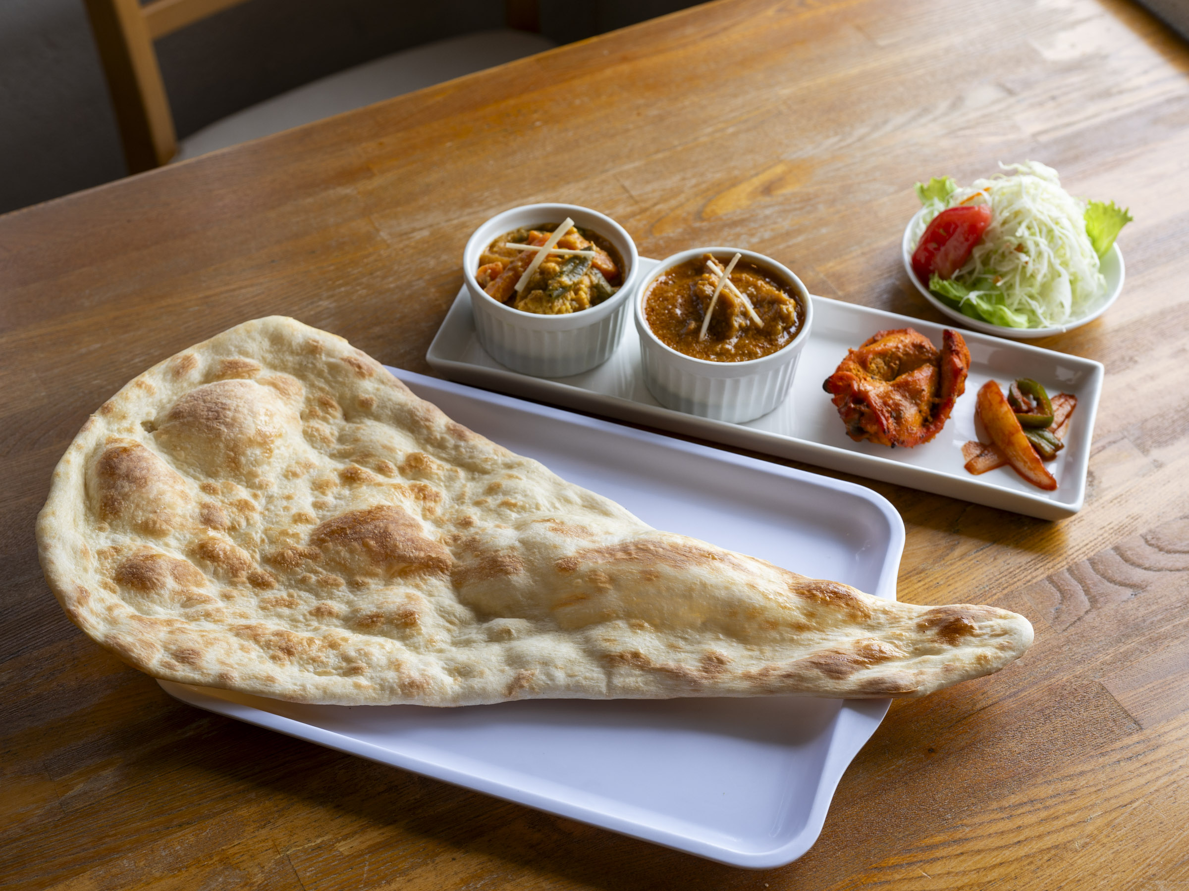 「カレーうどんセット」(1,200円)には、サラダやタンドリーチキンのほか、厨房のタンドールで焼いた美味しいナンもついてくる充実のメニューです。