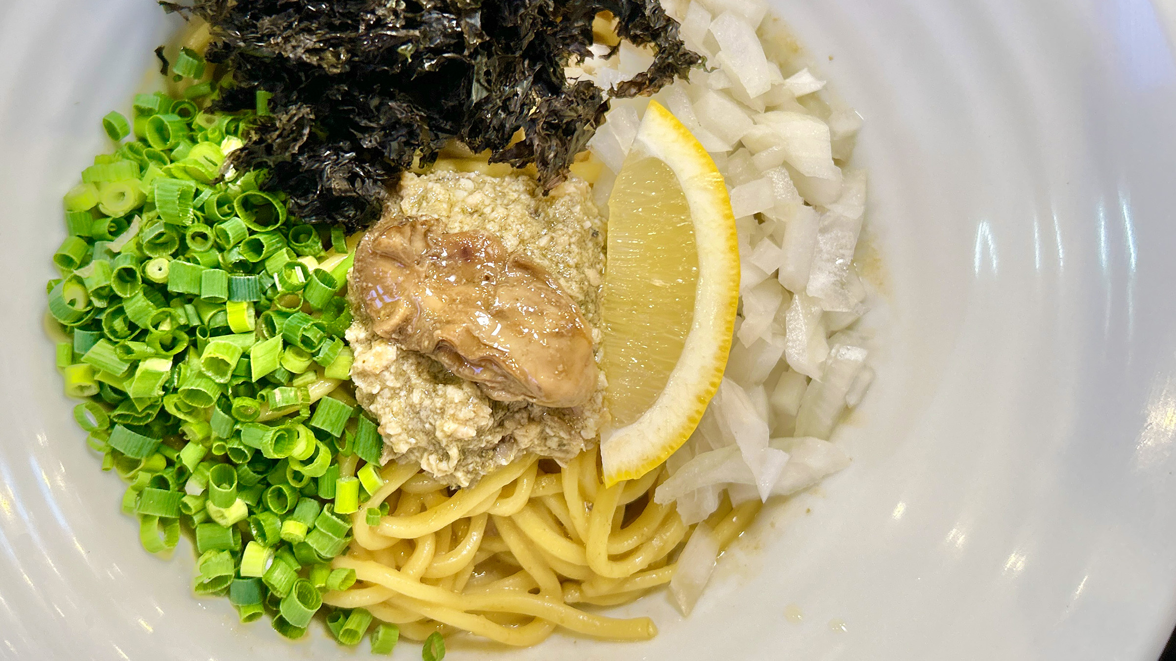 全て混ぜ合わせると、もちもちの中太麺に牡蠣ペーストが絡み、牡蠣や海苔、青ネギ、生玉ねぎと牡蠣オイル、全ての一体感と奥行きの深い味わいが絶妙です。