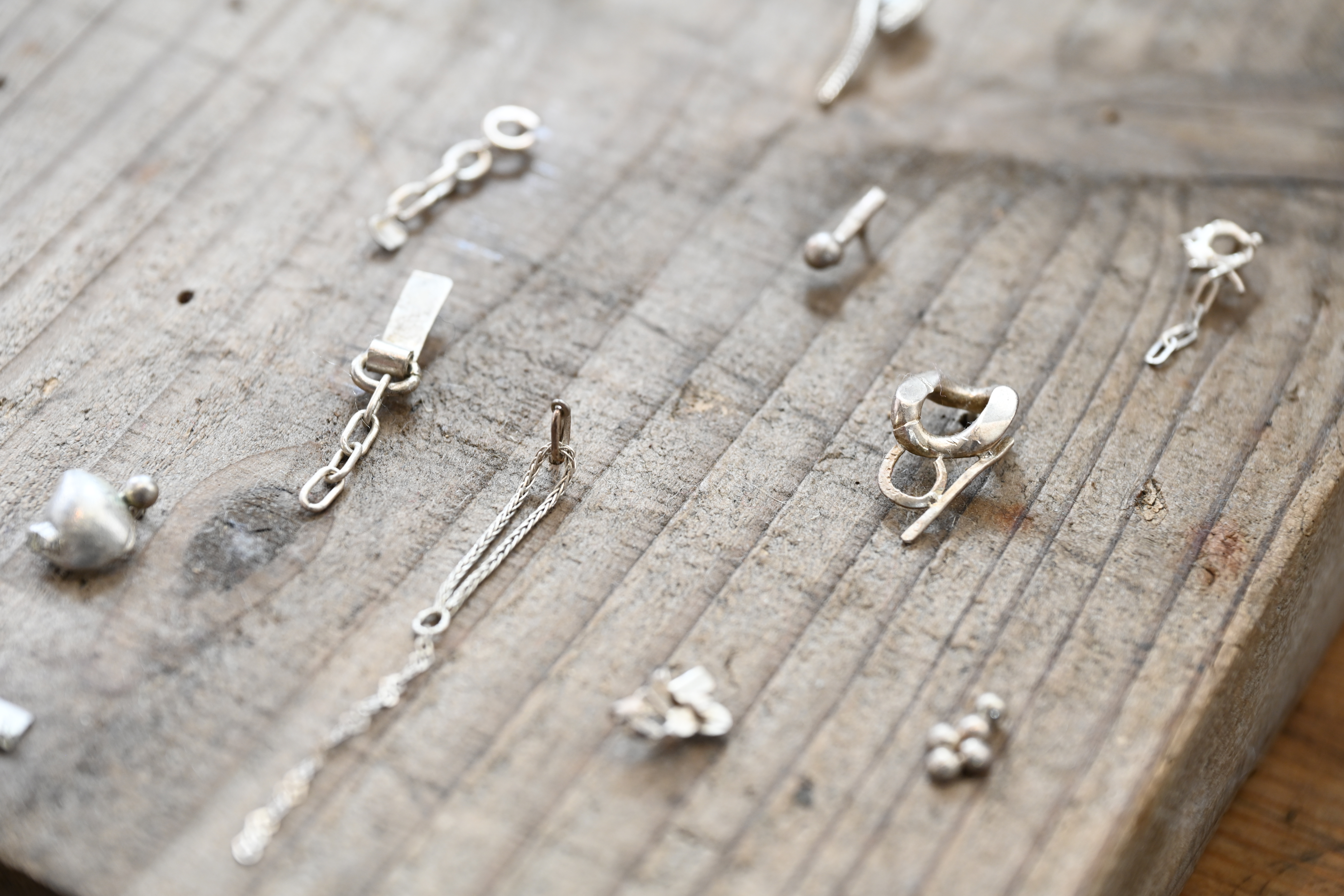 「逗子のアクセサリーブランド『ateilier heritage』。“heritage”はフランス語で“受け継ぐ”の意味で、一過性ではなく永く愛用できて次世代にも受け継げる普遍的で洗練されたデザインが特徴です。余ったフックやチェーンなど部品の端材を再構築したシルバーのピアスは左右別に組み合わせたり、別のアクセサリーと合わせたり。着ける人の感性で自由な楽しみ方ができるのが魅力です」