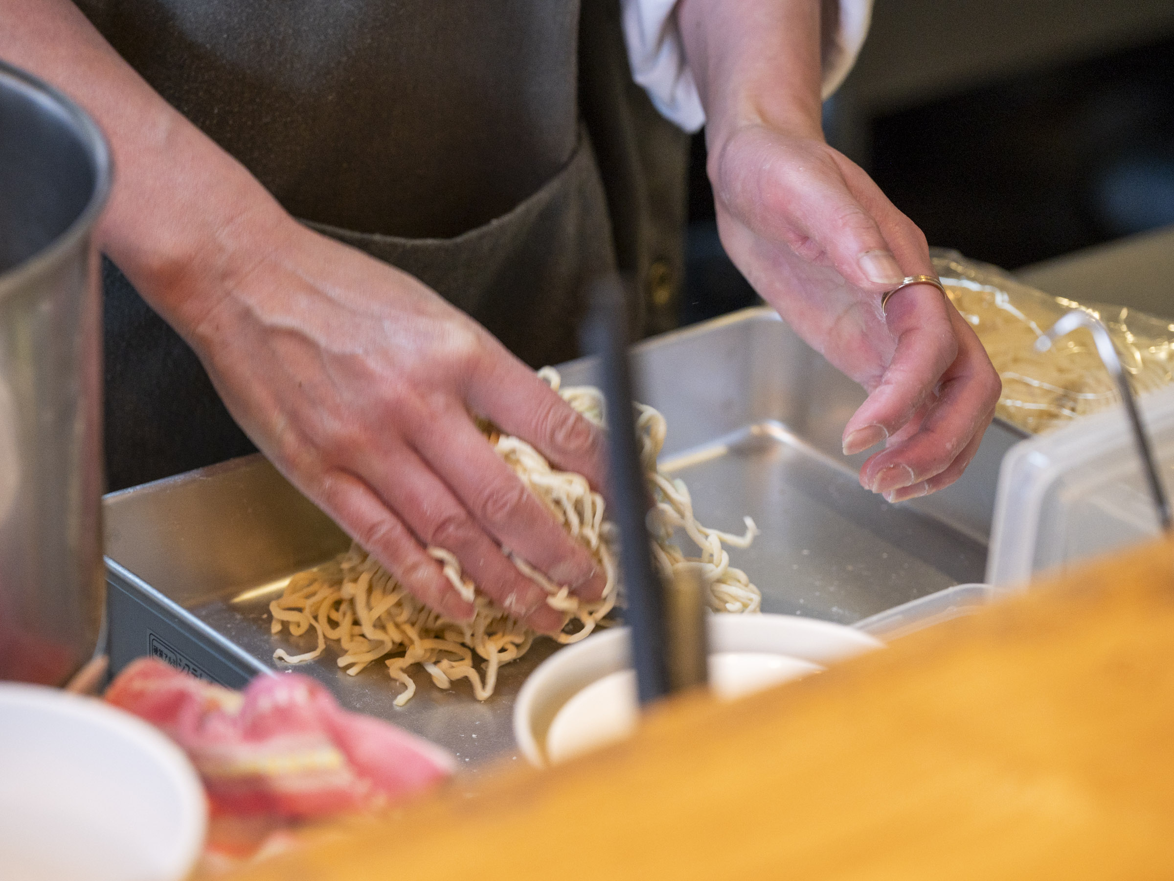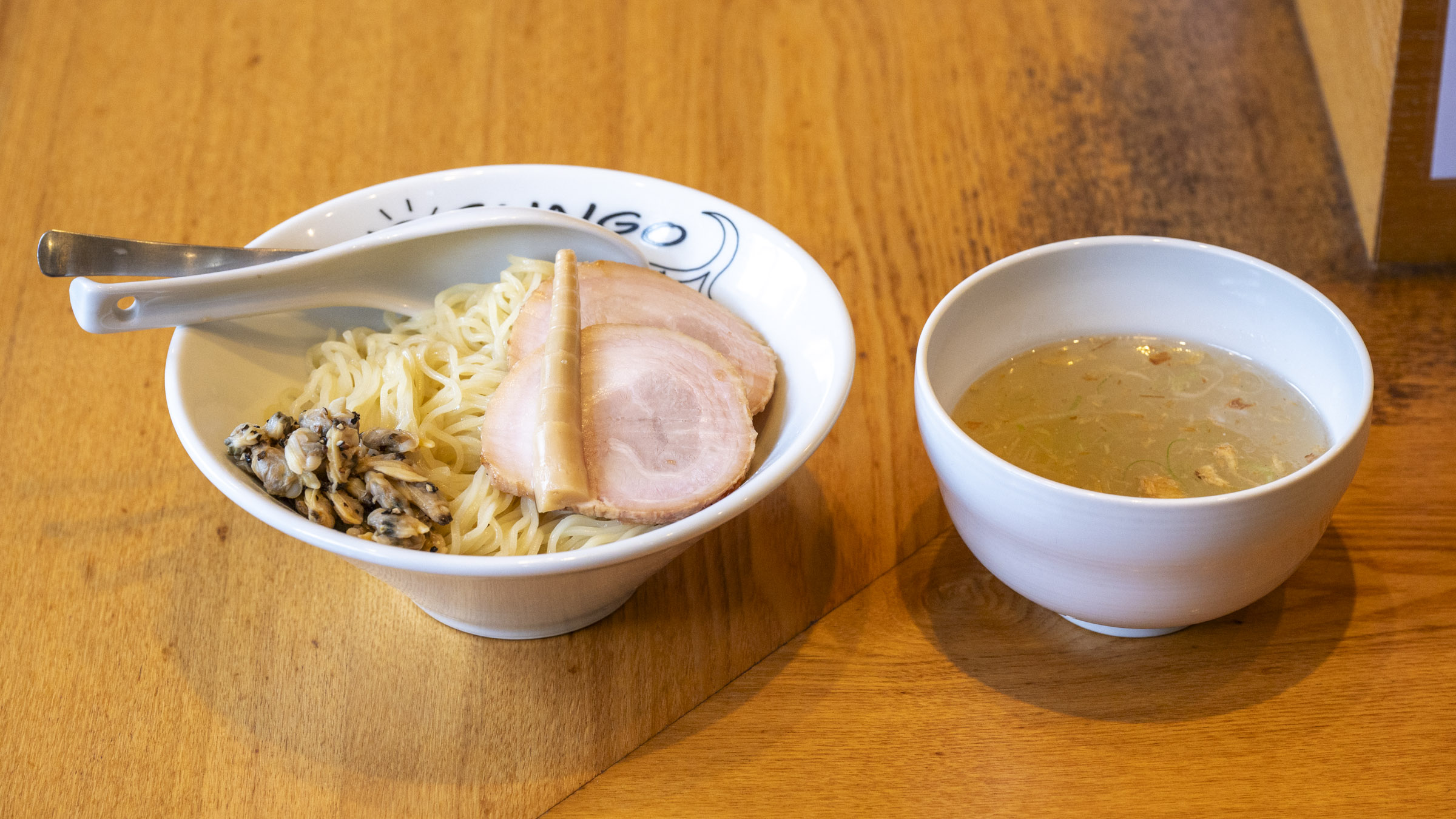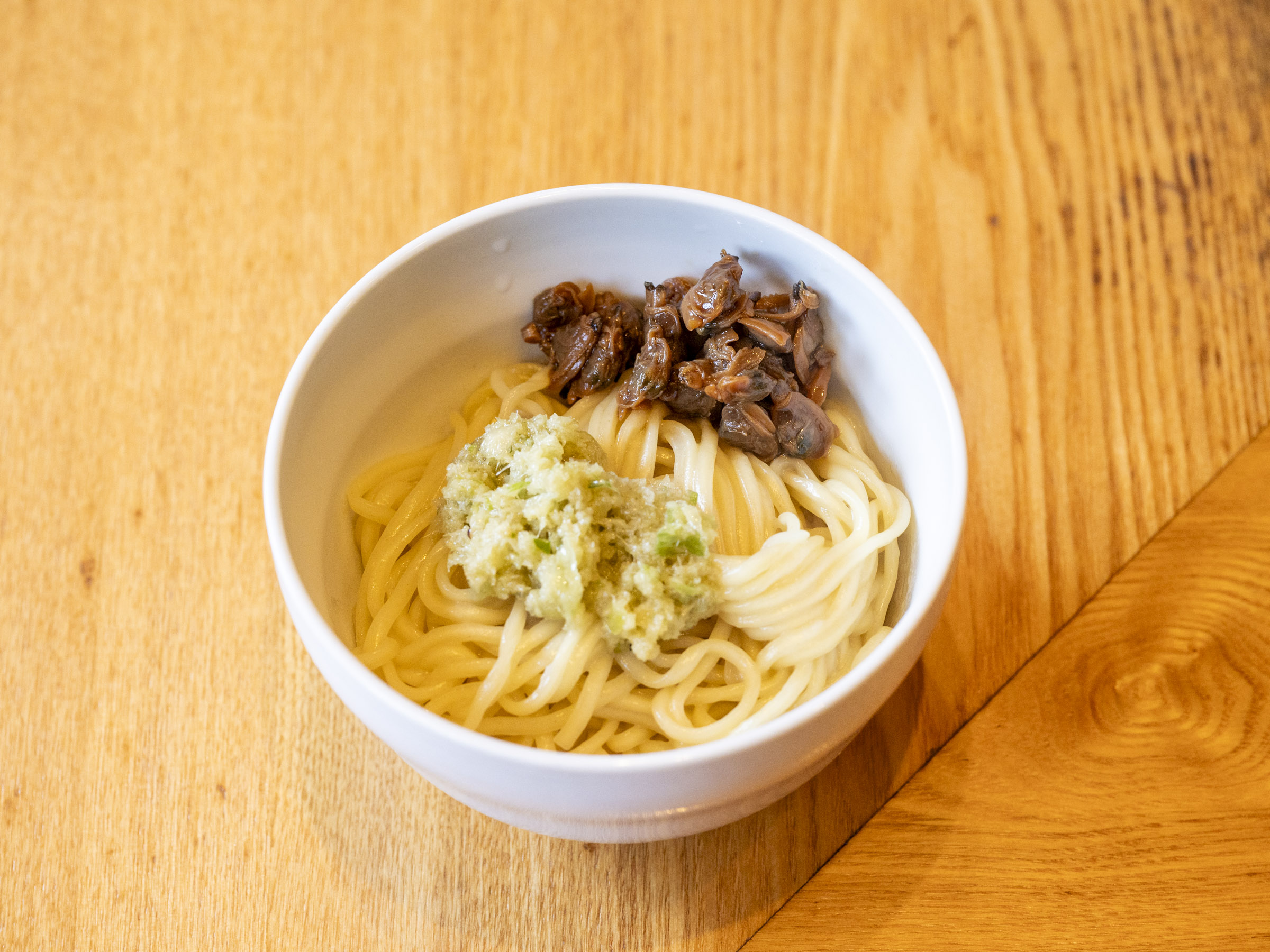 ギュッと濃厚なアサリと牛骨の出汁を喉越しの良いツルッとした細麺でいただく一杯。