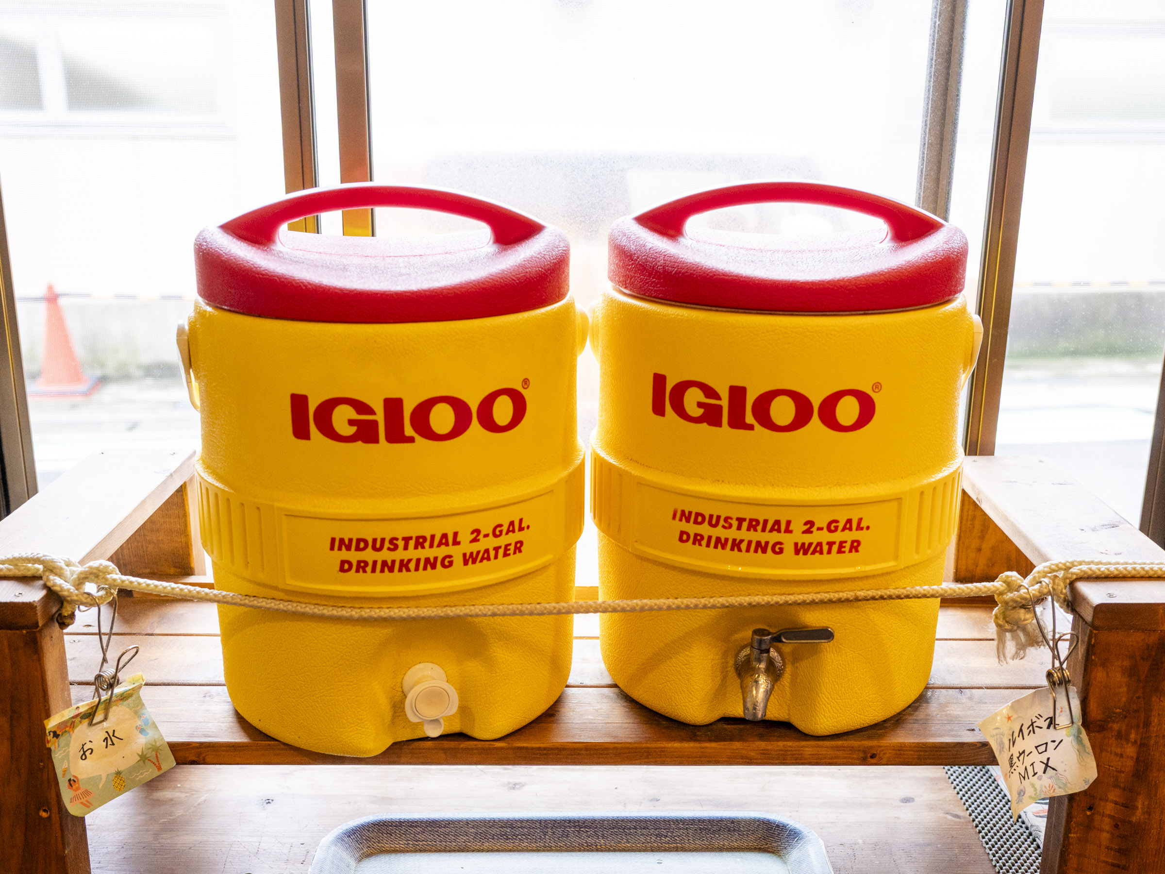 海辺のカフェのような店内には店長の下里広美さんの工夫が随所に光っています。なかでも注目がセルフサービスの水です。ウォーターサーバーからお客さんが自由にお水を注ぐスタイルですが、このサーバーが2種類あります。