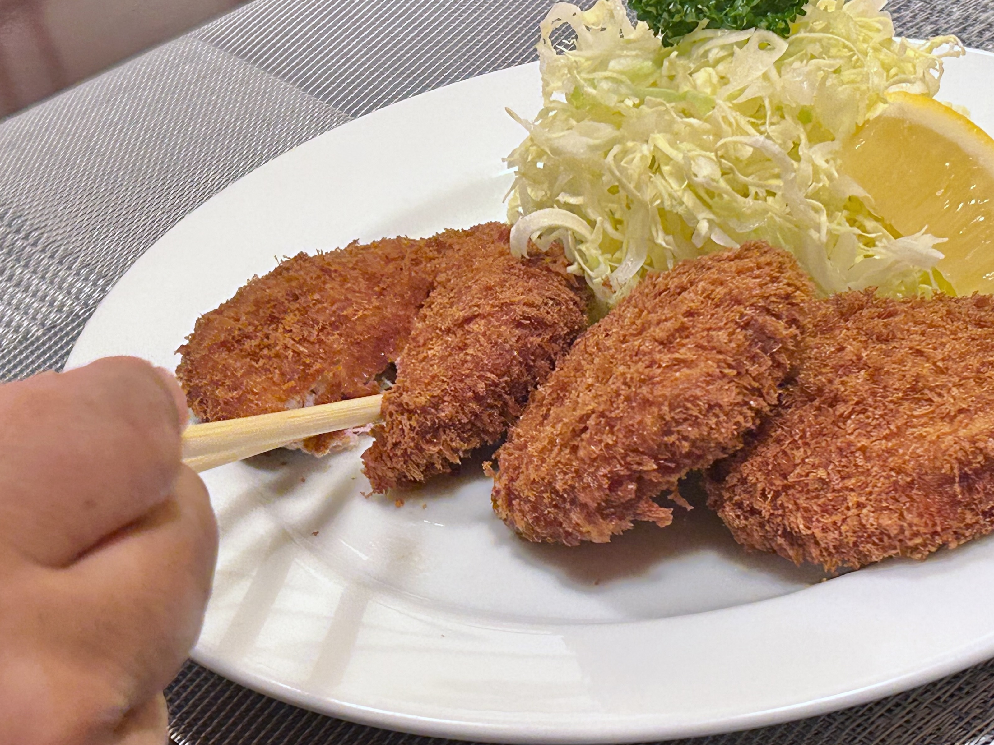 ふんわりとしたキャベツを皿に盛り、その上に揚げたてのひれカツを乗せると、まさに完成の瞬間。目の前に広がる美味しそうなヒレカツの姿に、思わず笑みがこぼれます。