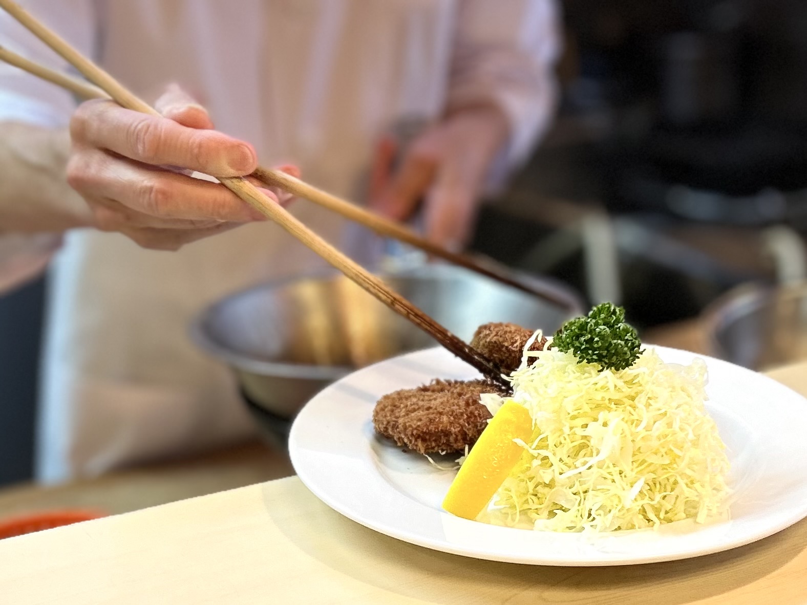 丁寧に開いたヒレ肉の筋を細かく切り、驚くほどの柔らかさを実現。衣には牛乳を加えてほんのりとした甘みを引き出した溶き卵と、生パン粉を使用。