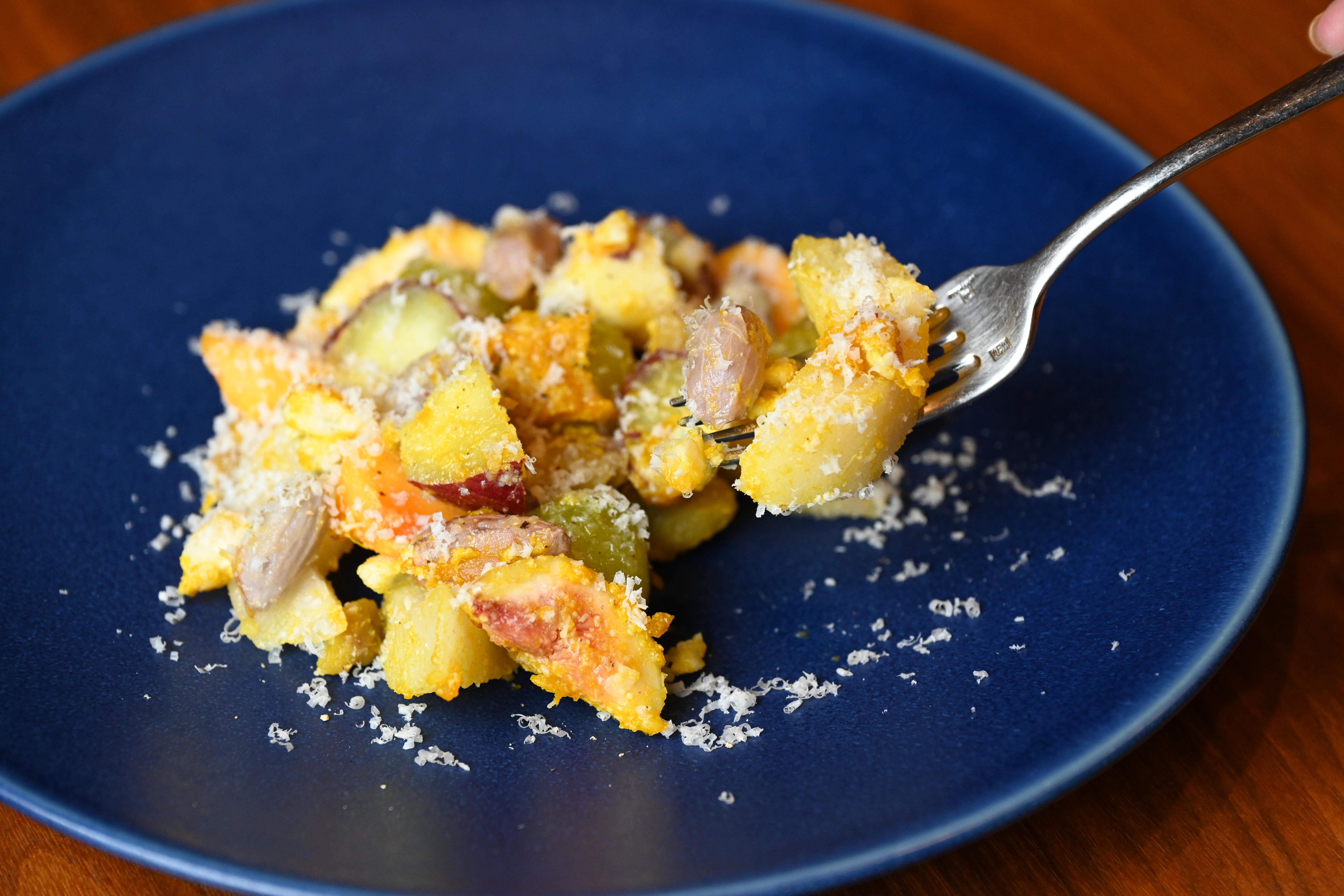 秋の味覚と相性のいいゴルゴンゾーラとカボチャのピューレで食材をつないで、マリネ仕立てに。栗は土井さんの奥様の実家から送られてきたものを、店で熟成させて甘みを引き上げています。素材の甘みとチーズの塩みのコントラストが楽しく、ゴルゴンゾーラのこっくりとした味わいが絶品。