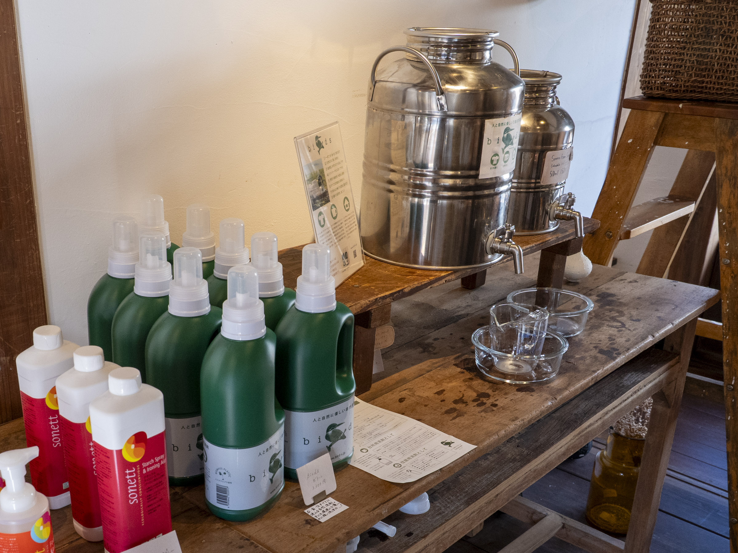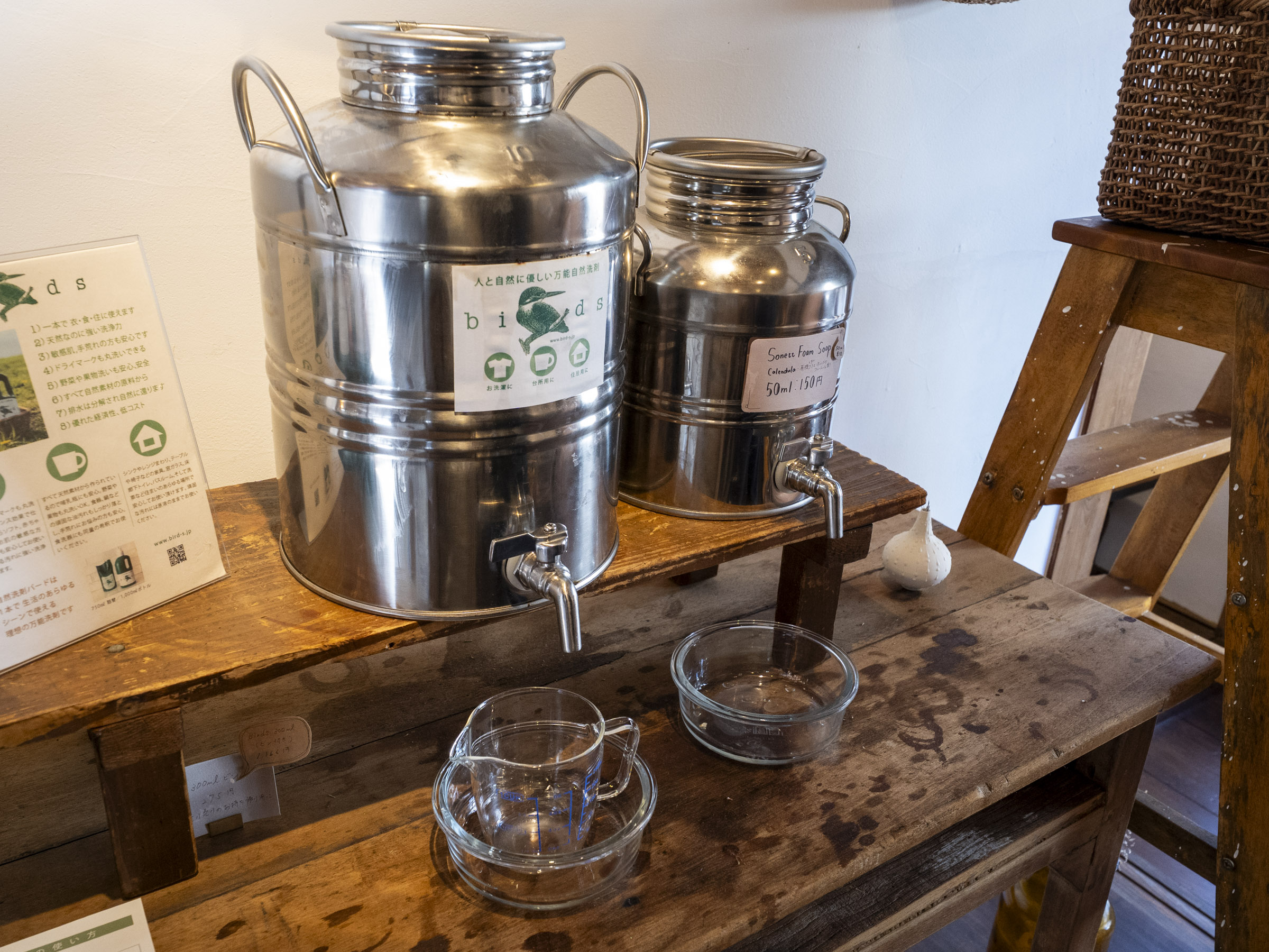 特にリピーターが多いアイテムの一つに自然洗剤があります。排水の93%以上を洗剤中の微生物が食べ、水と炭酸ガスに分解してくれる「 birds(バード)ボトル」(3,300円 1,000ml)です。一本で 衣・食・住のすべてに使え、量り売りであることも人気の秘訣です。