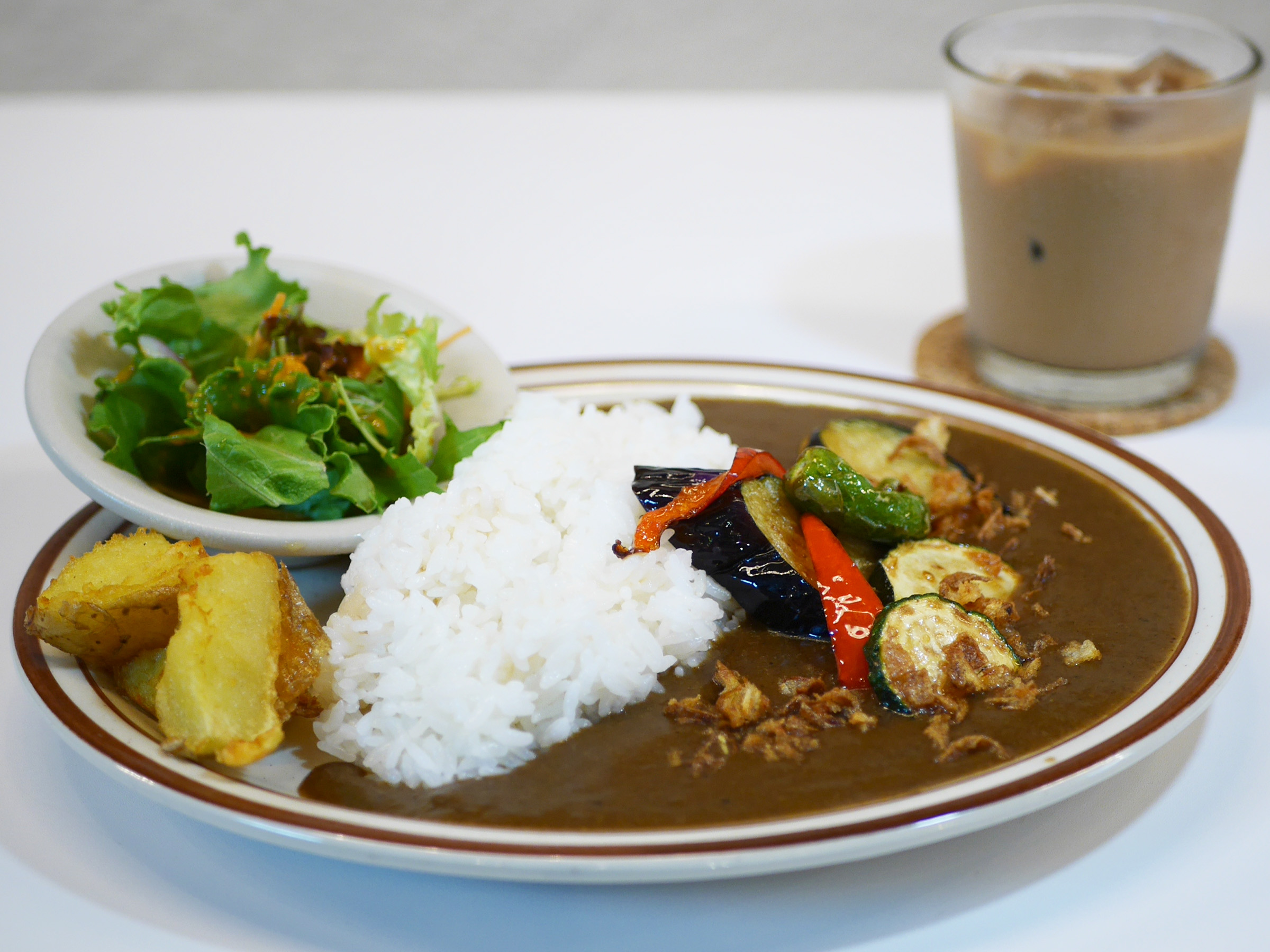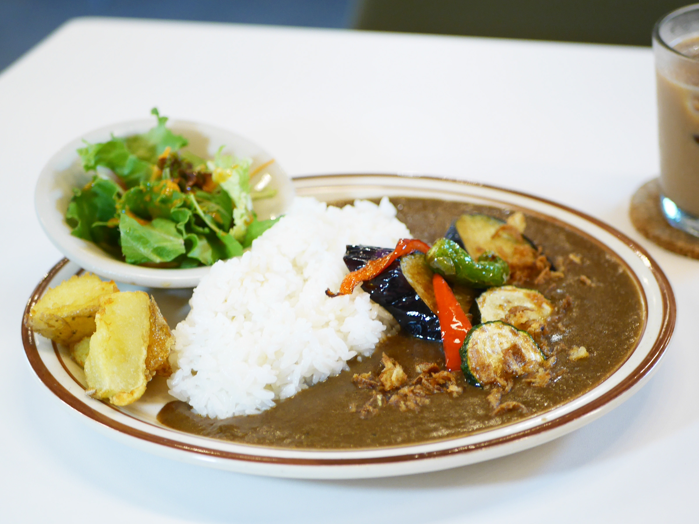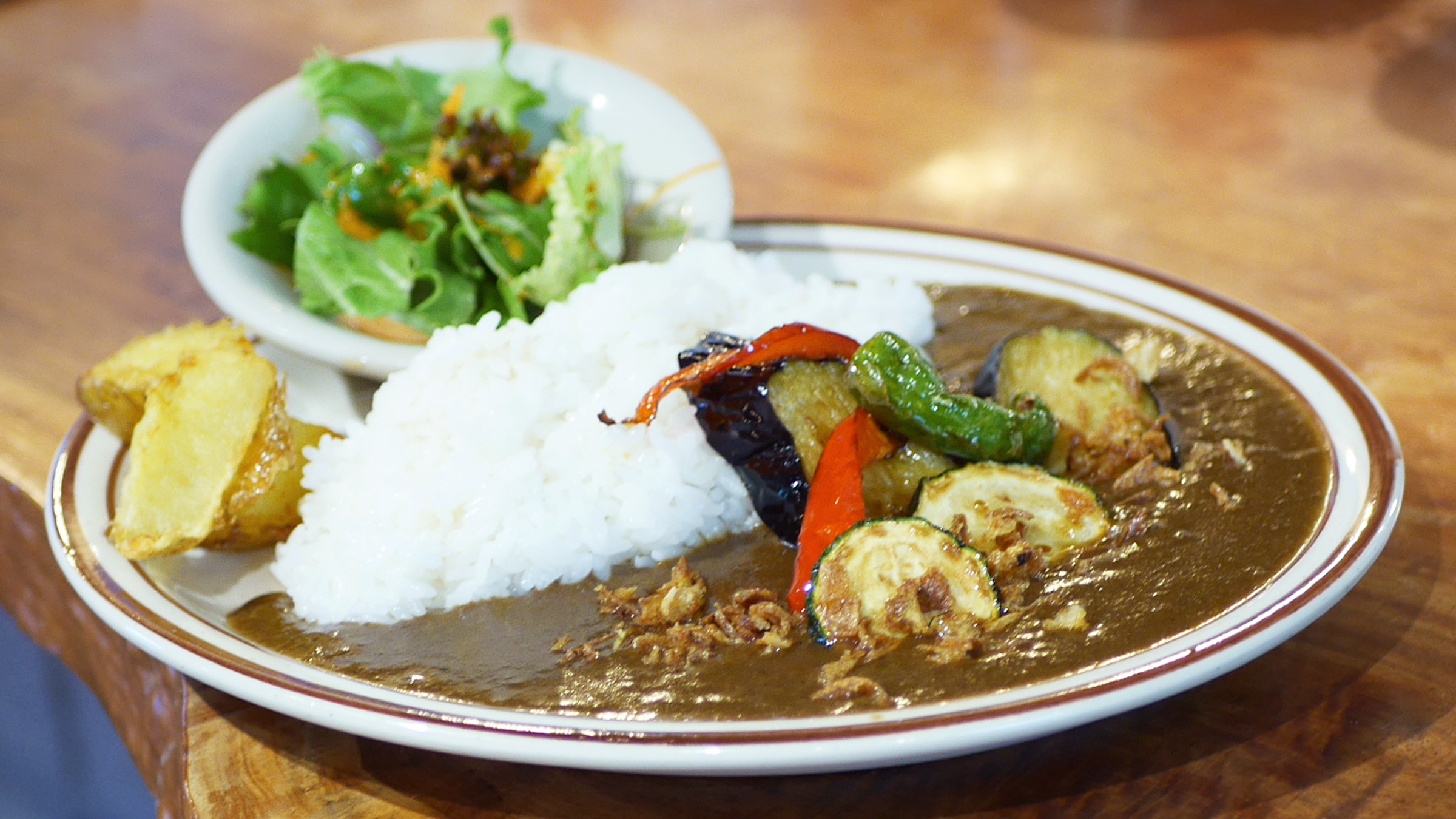 今では人気メニューのひとつである「季節野菜のたっぷりベジカレー(1200円税込)」。サラダ・ポテト・ドリンク付きのセットで提供されます。