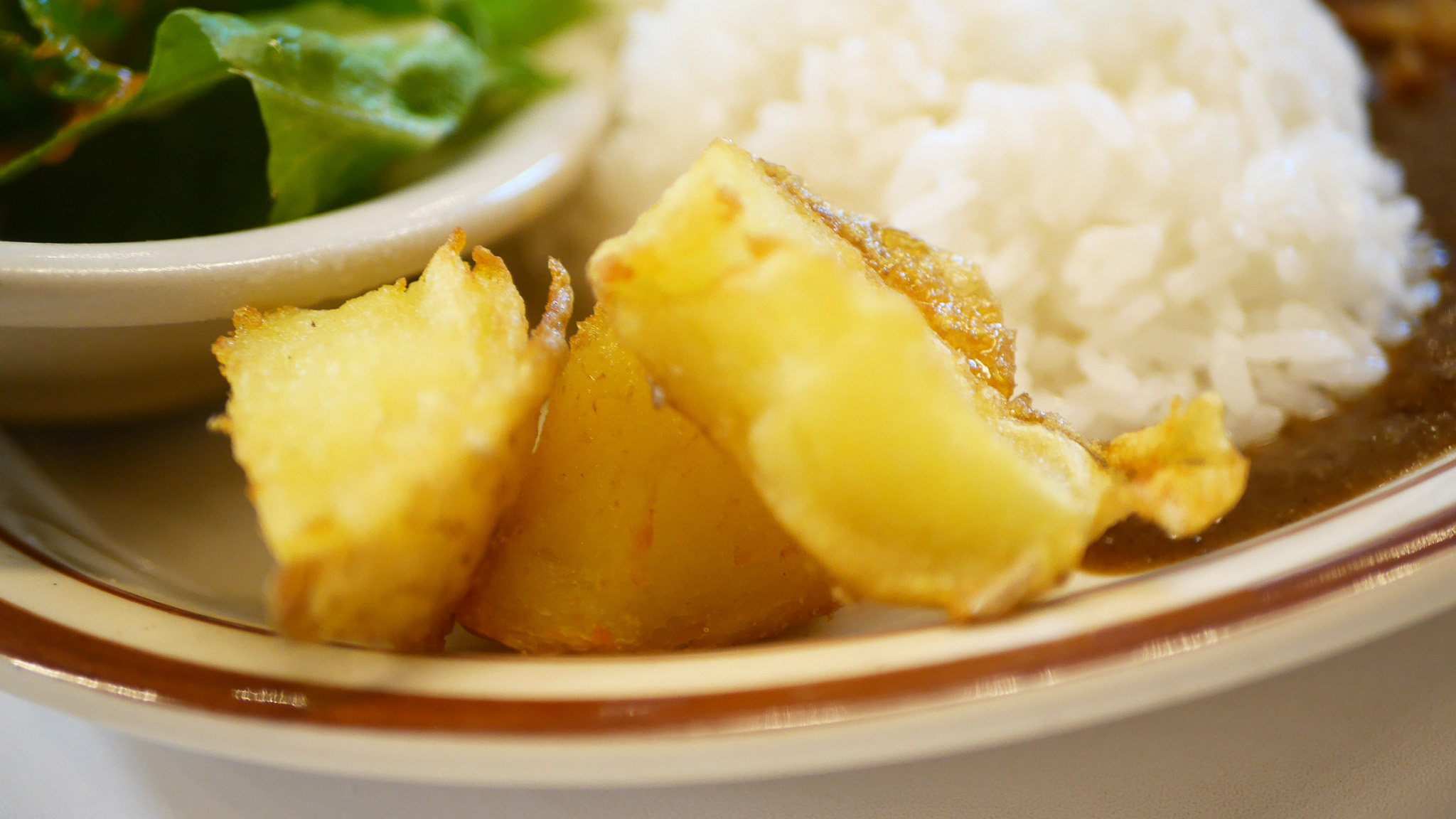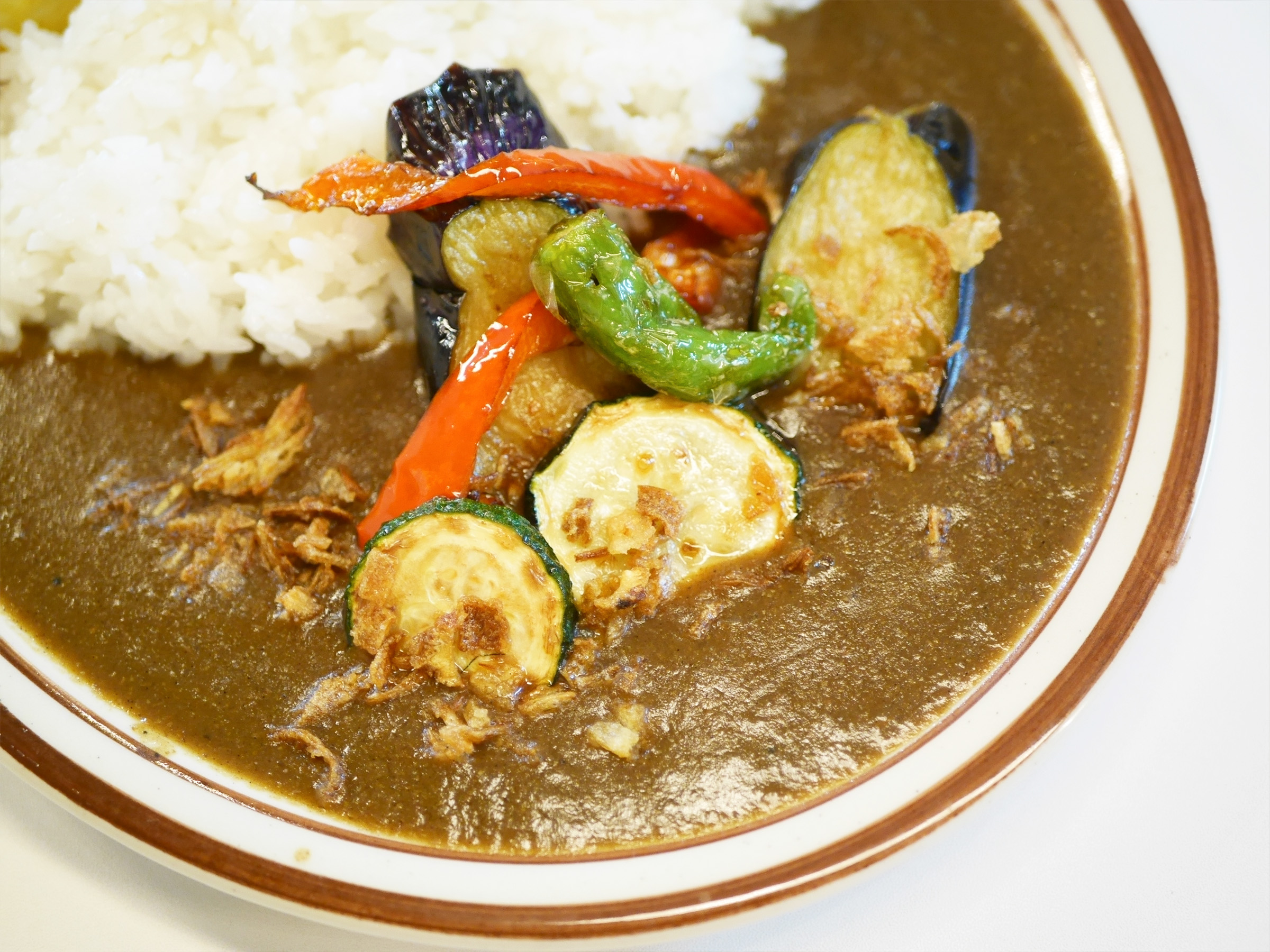 4種の素揚げ野菜は、色鮮やかで、外はカリッと香ばしく、中はジューシー。野菜本来の甘みが際立ち、牛すじブイヨンのきいたスパイシーなカレーと絶妙にマッチします。