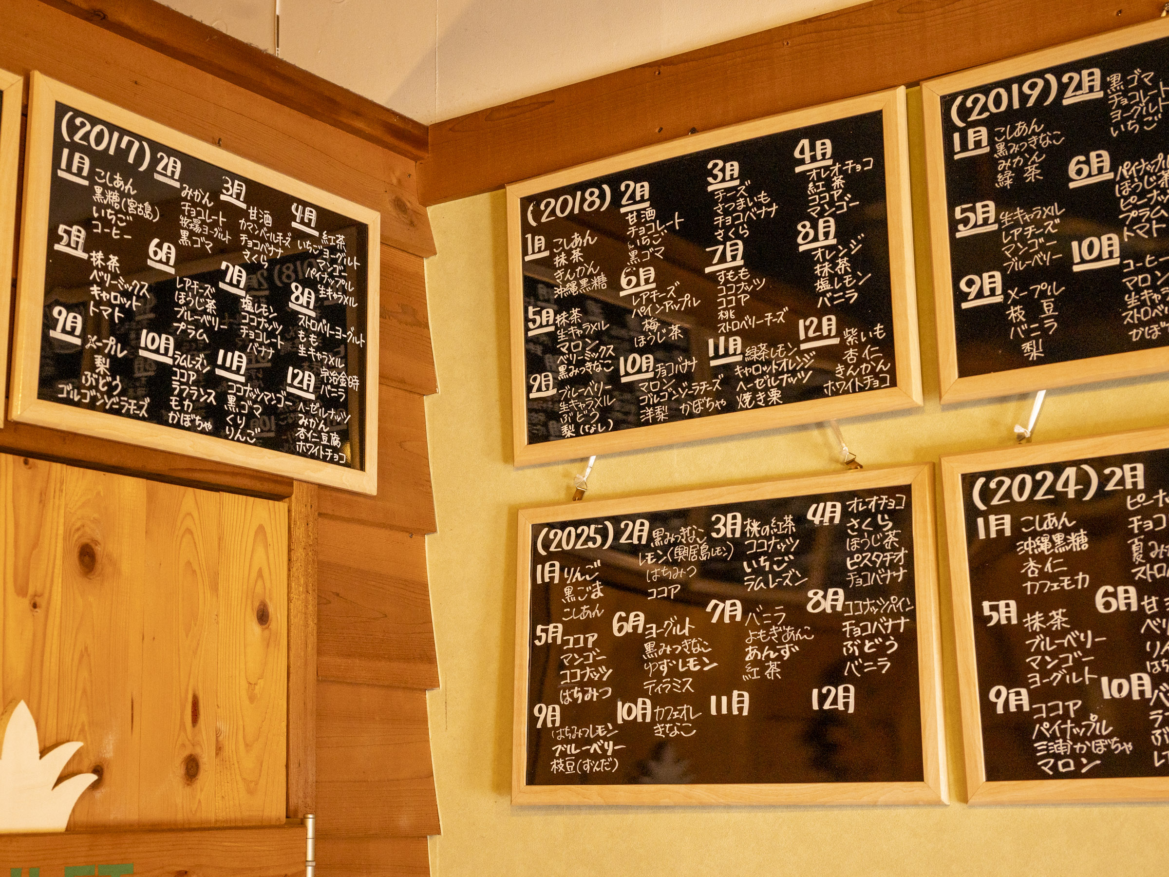 店内の壁には、これまでの「今週の味」がずらりと記録されています。その数、100種類以上! 岡田さんに印象に残っている味を伺うと、「う~ん」と悩みつつ「いちご」「ラムレーズン」「チョコバナナ」を挙げてくれました。
