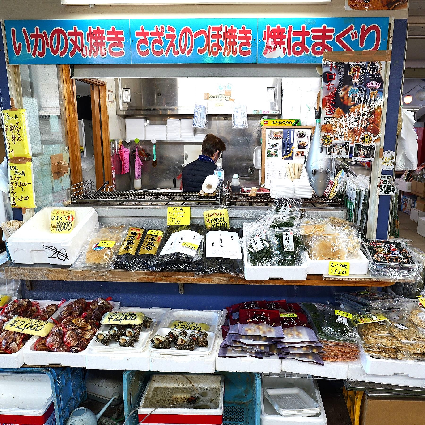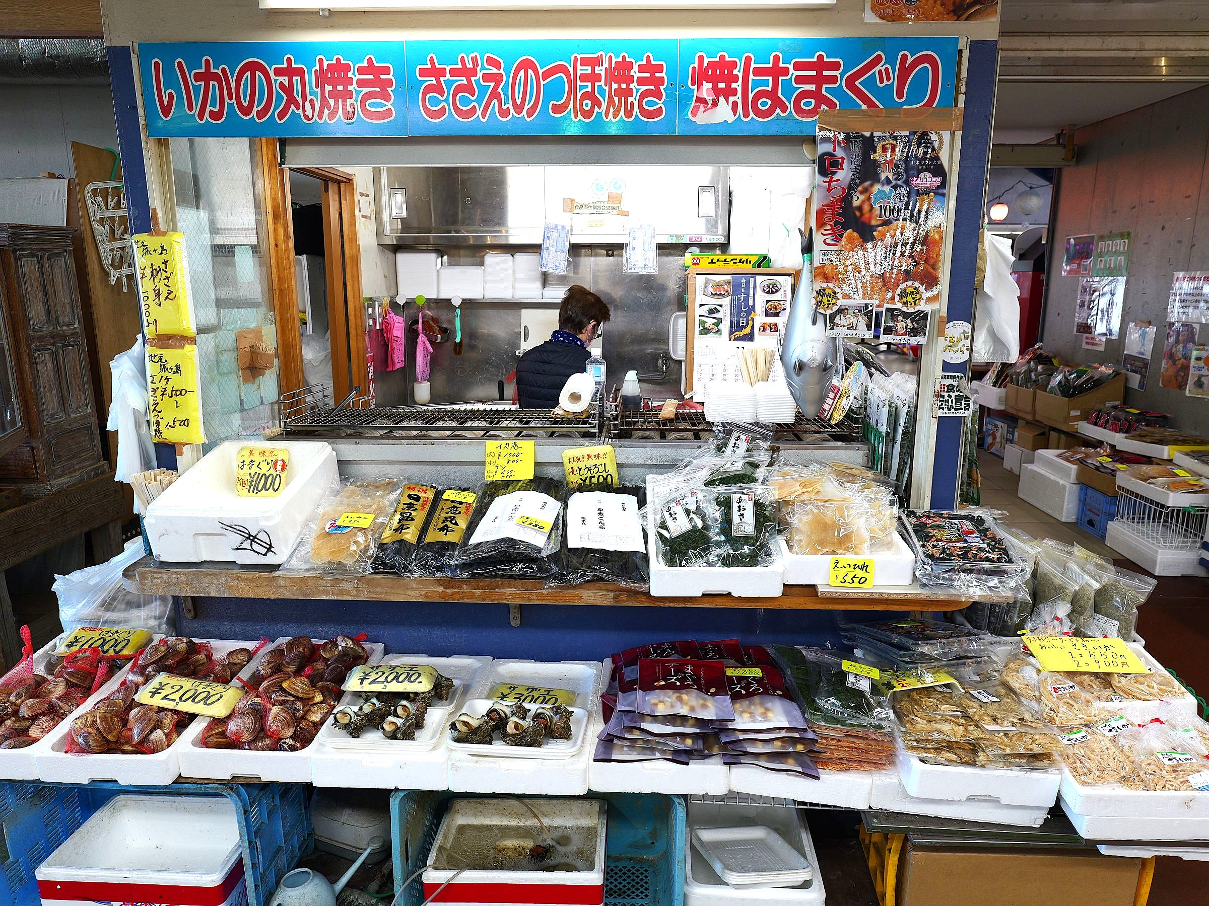 店内には網焼きコーナーがあり、土日祝限定で、サザエ、はまぐり、イカ、伊勢エビなどを目の前で焼いてくれます(サザエ600円、はまぐり1,000円 ※取材時)。