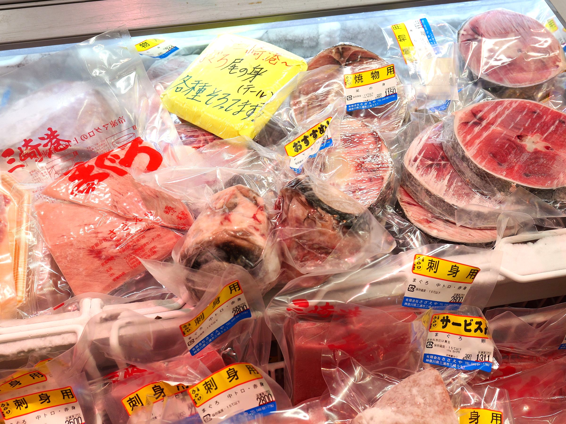 サザエだけでなく、三崎の名物マグロもお店自慢の商品。しかも、頬肉、脳天、尾の身、目玉、卵など、都内のスーパーではあまり売っていない部位がズラリと並びます。
