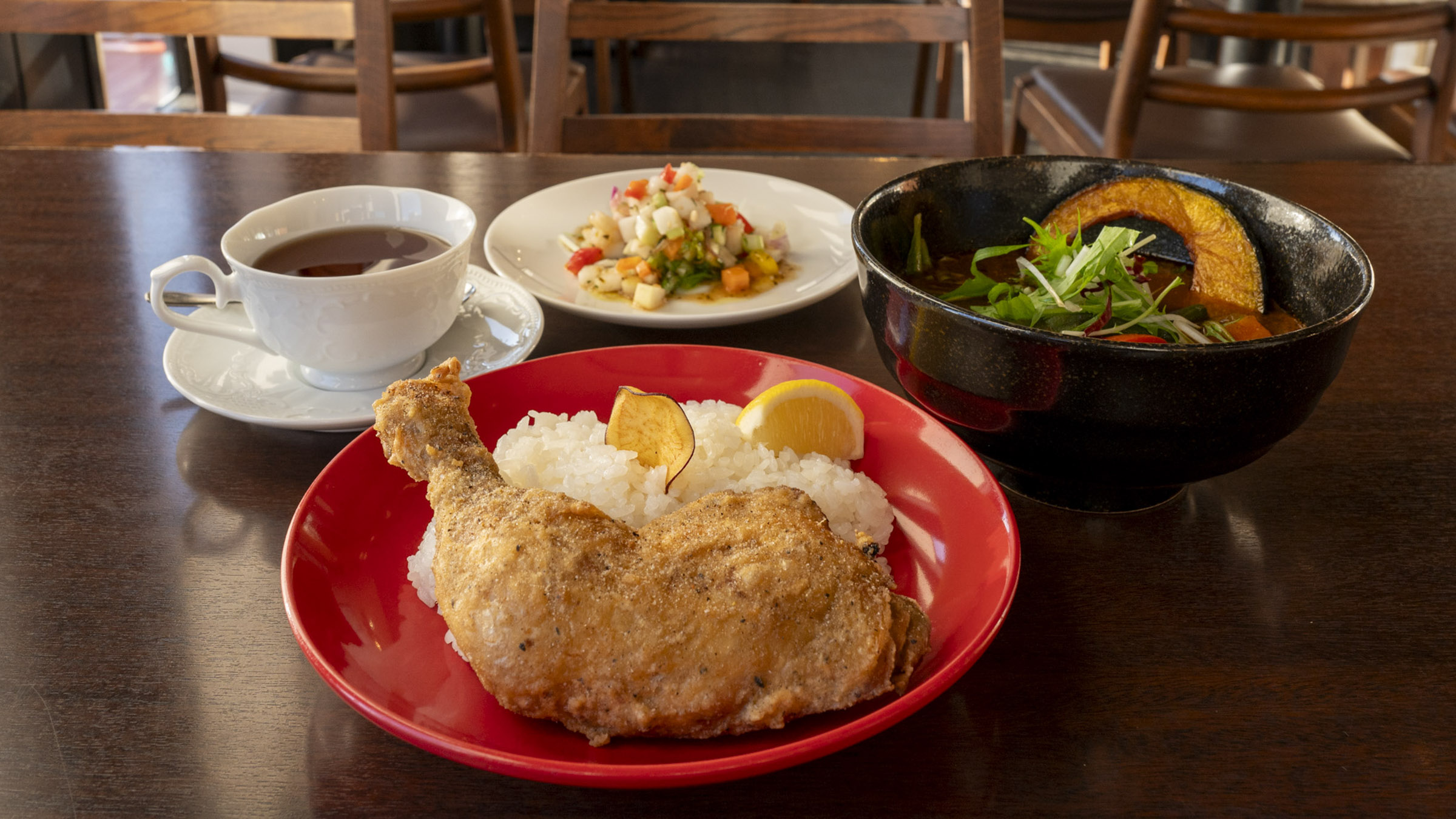 ランチの定番「肉食セット」(1,850円)は10種類の野菜とチキンベースのスープカレー、ごはんに乗った大きなフライドチキン、ドリンクを楽しめるお得な定食です。