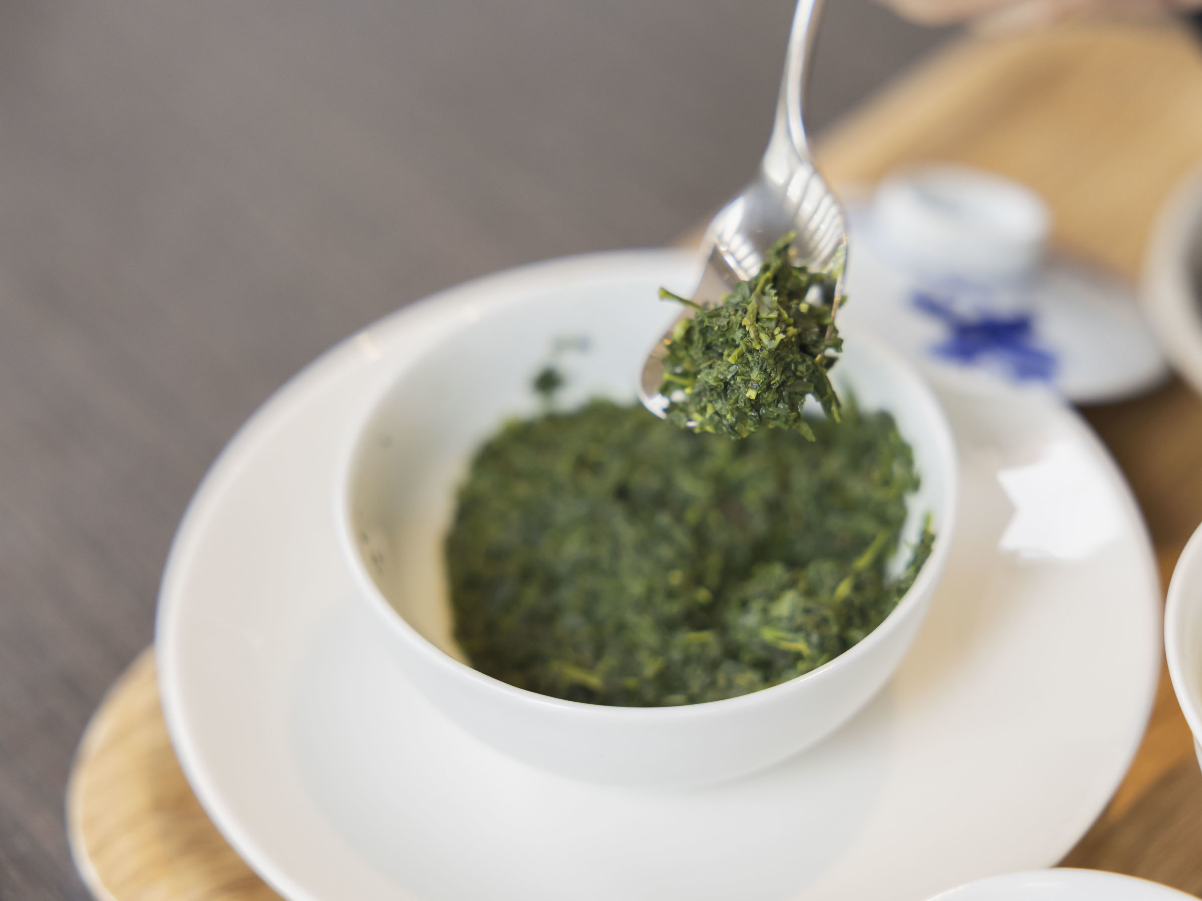 コースの締めは、スプーンでいただく茶殻。食物繊維とビタミンEたっぷり含む茶殻はあっさり味で、醤油と和えて食べると青菜のお浸しのようで、意外な美味しさに驚かされました。