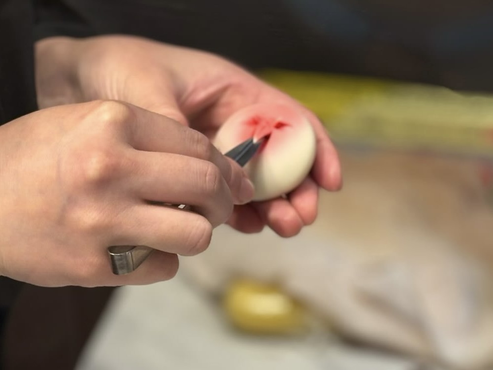専用の細工バサミであんの表面を薄く切り出し、花びらを生み出す「はさみ菊」。一度ハサミを入れればやり直しはききません。角度や深さ、リズムをそろえながら、平らなあんに立体の表情が宿っていきます。切り口からのぞくほのかな紅色が、作品に生命感を与えます。