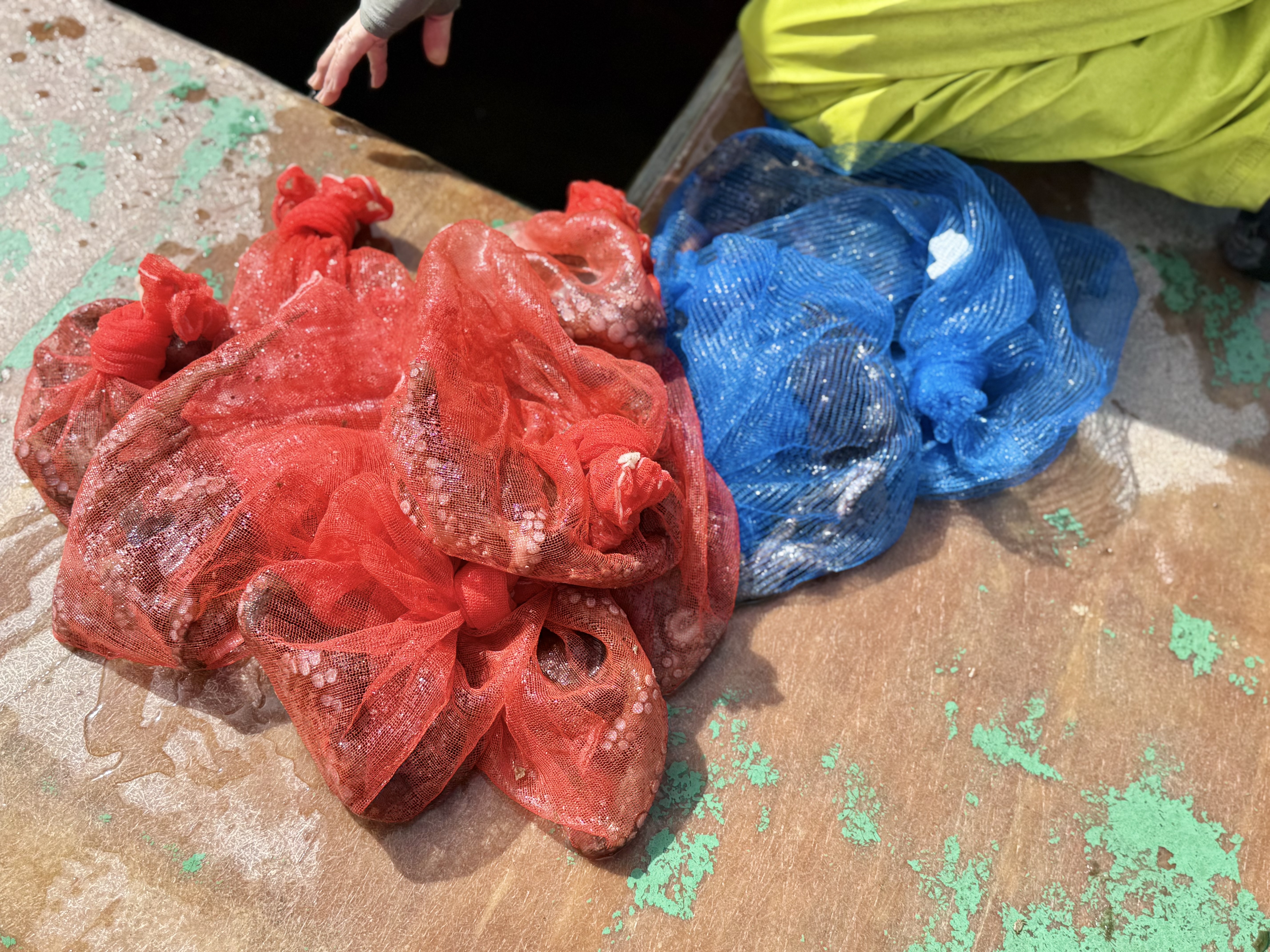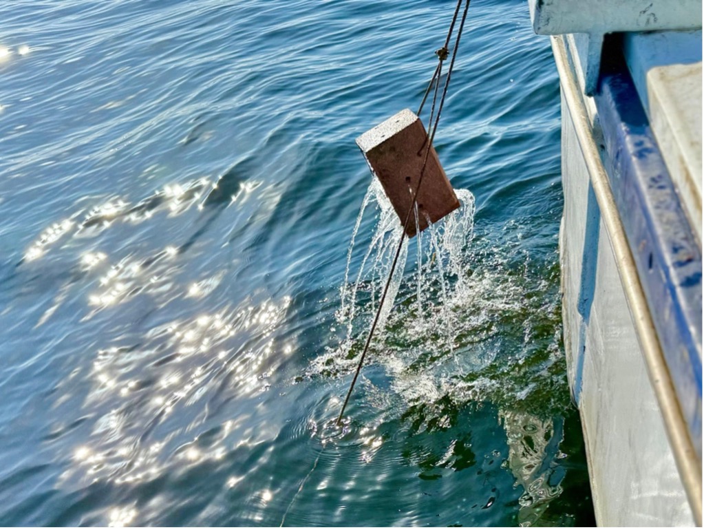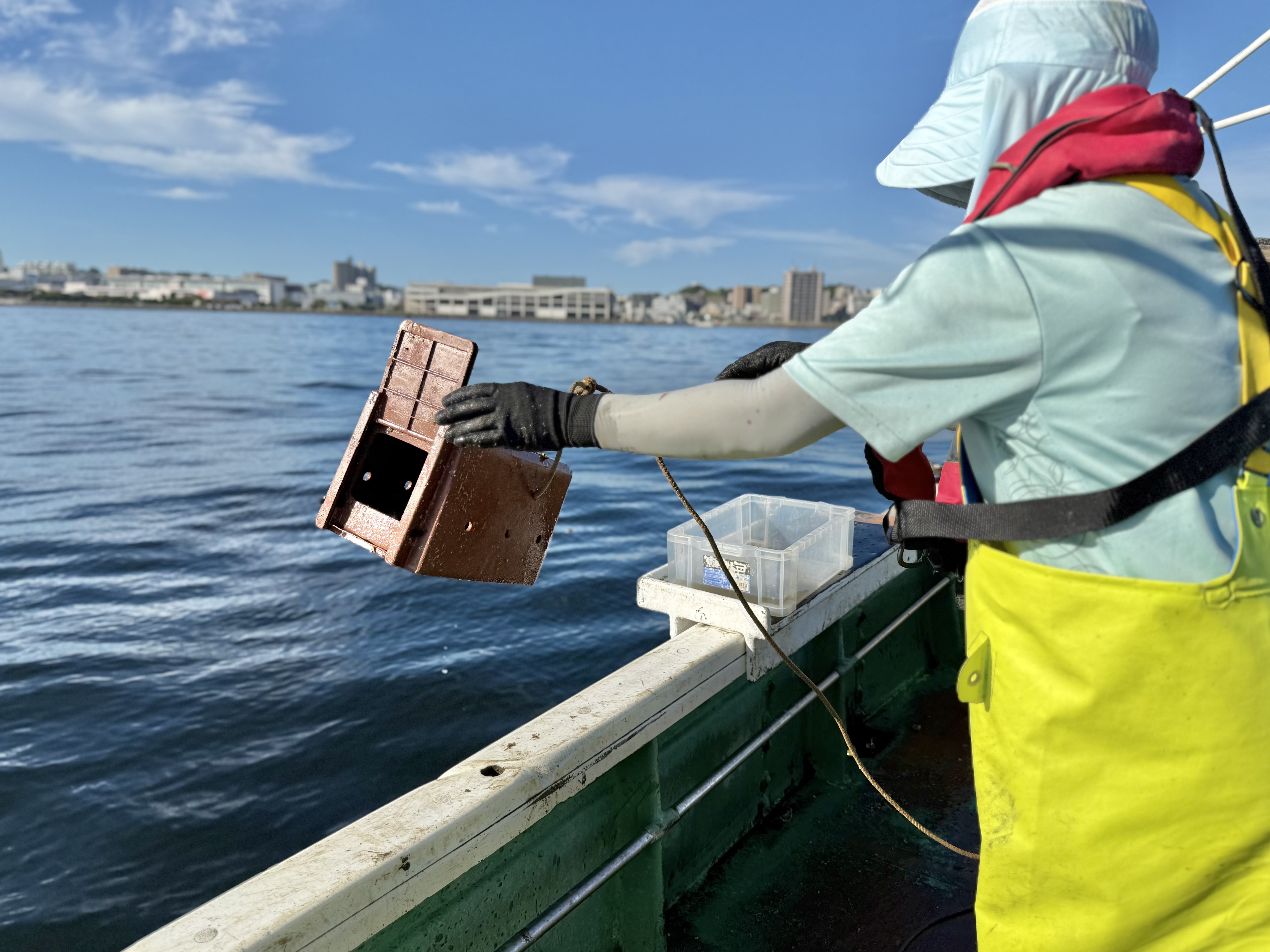 数日海底に沈めておくだけで、ゴミが入ったり、貝が付着したりします。