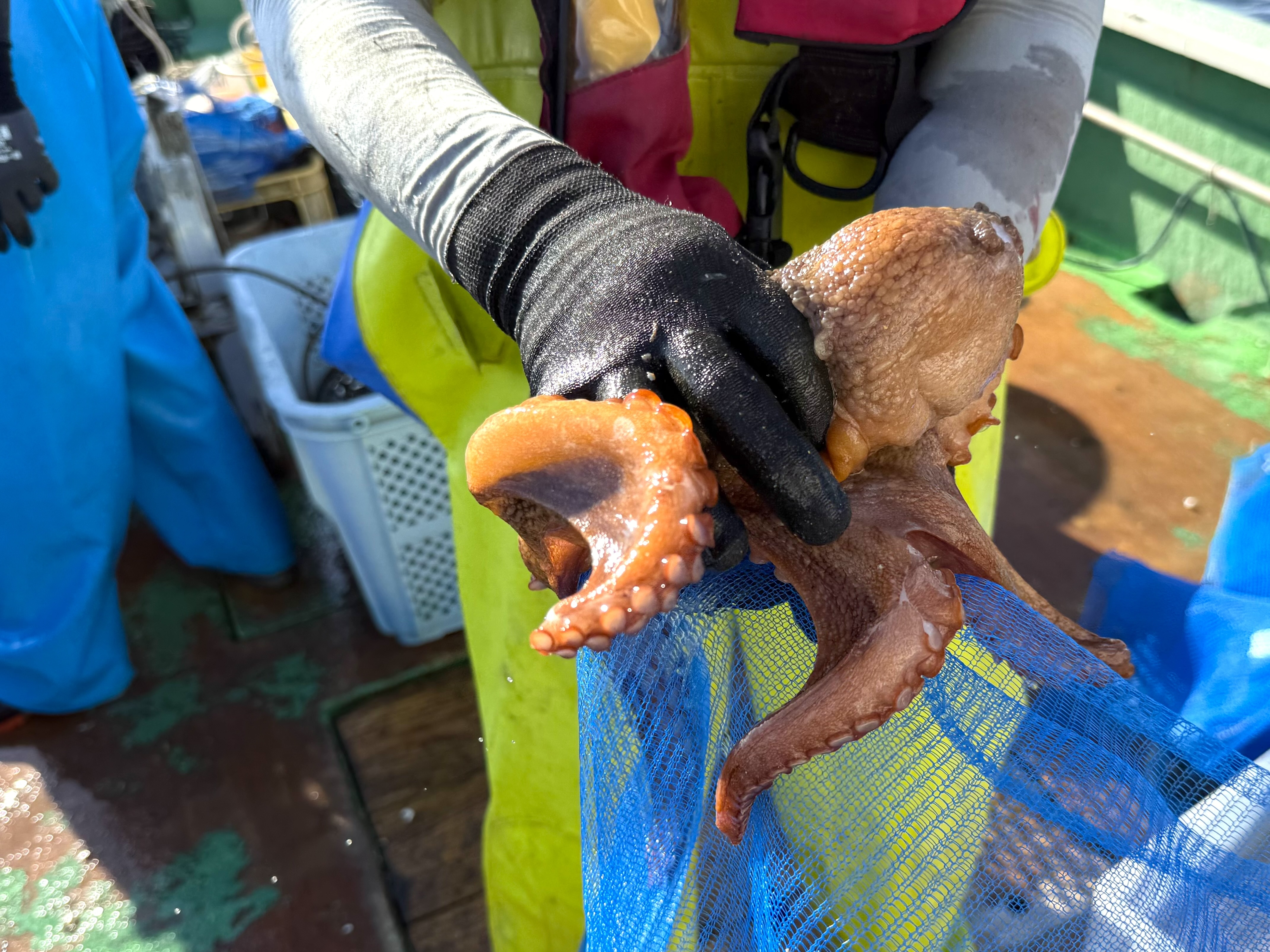 獲れたタコは、狭い生け簀での共食いを防ぎ、傷をつけないよう、ぬるぬるした体をギュッと掴んで素早く一尾ずつ網に入れ、船底の生け簀(いけす)へ送られます。